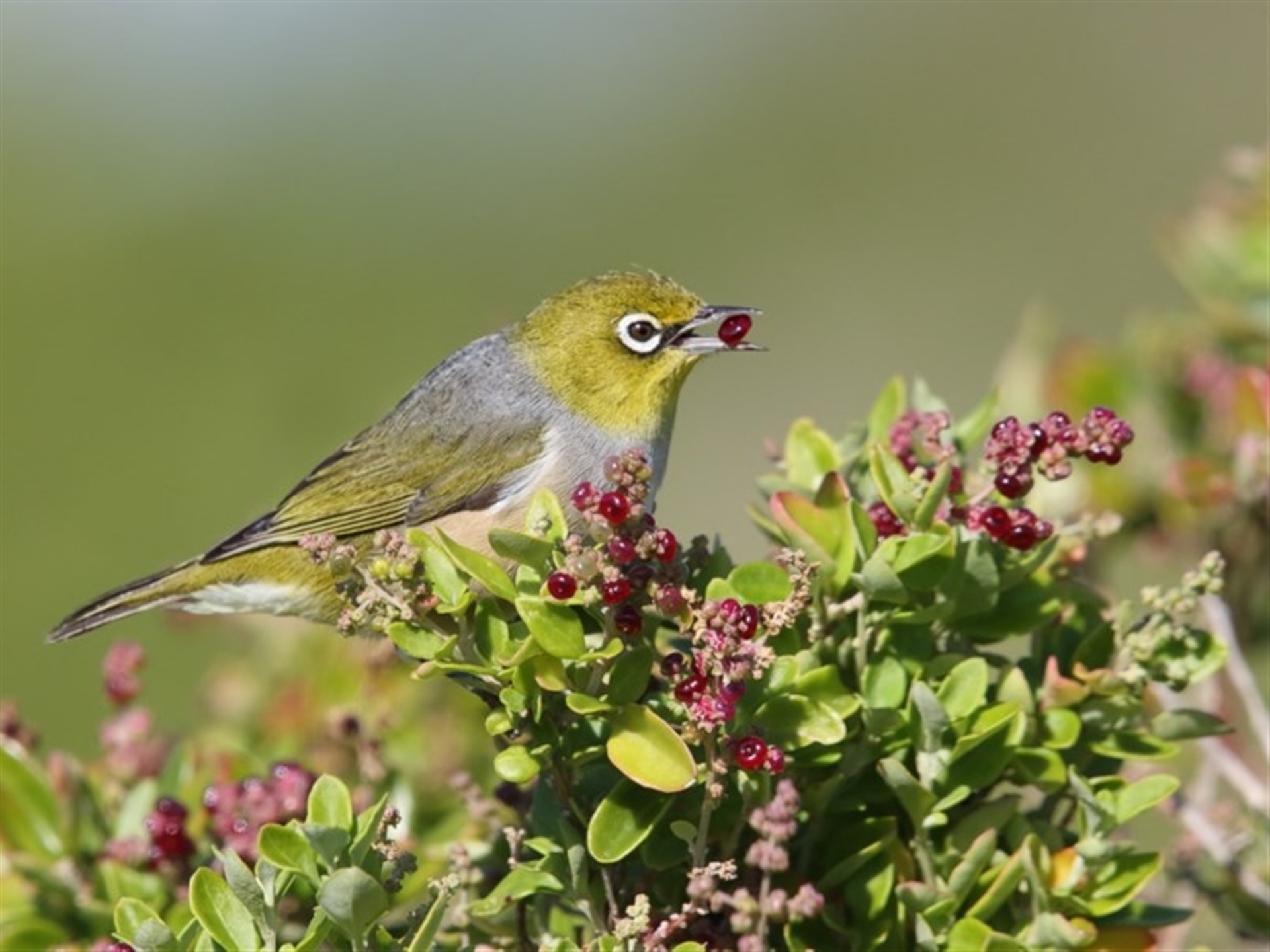 Silvereye feeding on a Seaberry Saltbush (Rhagodia candolleana) at Haycock Point.