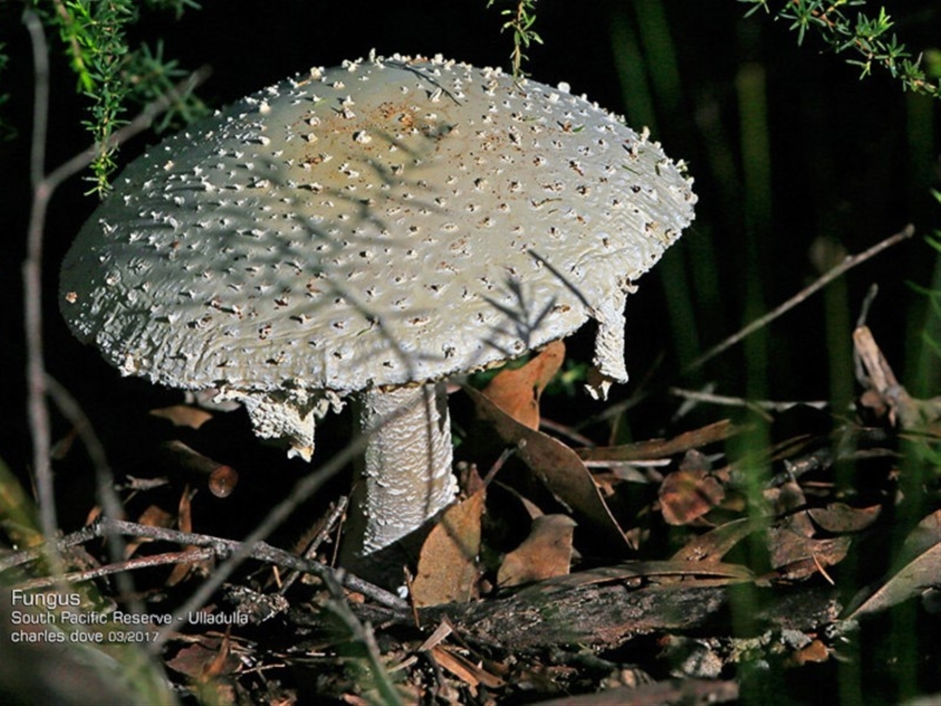 This looks like an Amanita species with the remnants of pyramidal warts on the cap. Was it's colour grey or white? There are a few Amanitas with pyramidal warts, this one could possibly be an aged specimen of Amanita pyramidifera with the warts wearing away. The stem looks fairly typical from what I can see - this species doen't have a ring and it should have a bulbous base