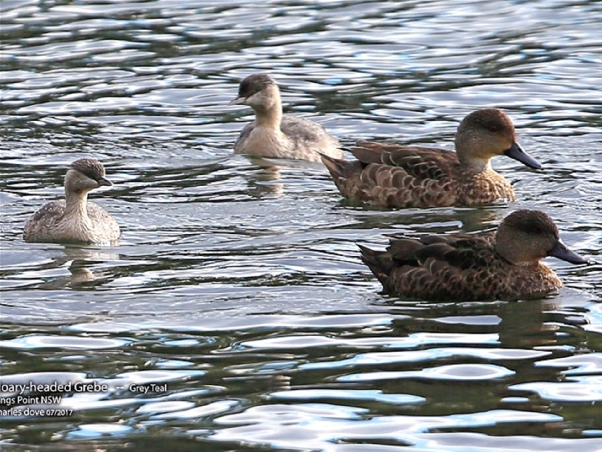2 Hoary-headed Grebe in the company of the Larger Grey Teal. They normally arrive during the winter months in Burrill Lake