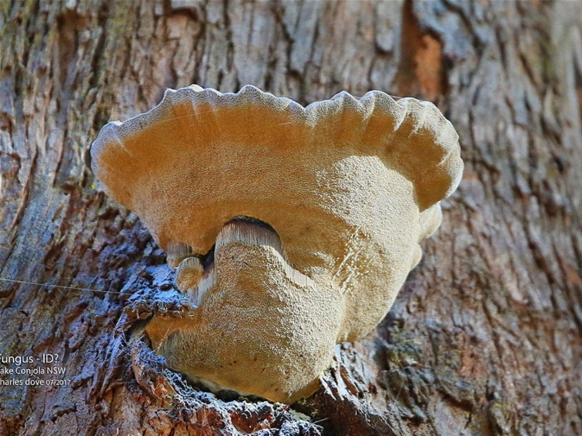 Fungi Shelf-like to hoof-like & usually on wood Pored or somewhat maze-like on underside [bracket polypores] CharlesDove South Coast NatureMapr Polypore sp.
