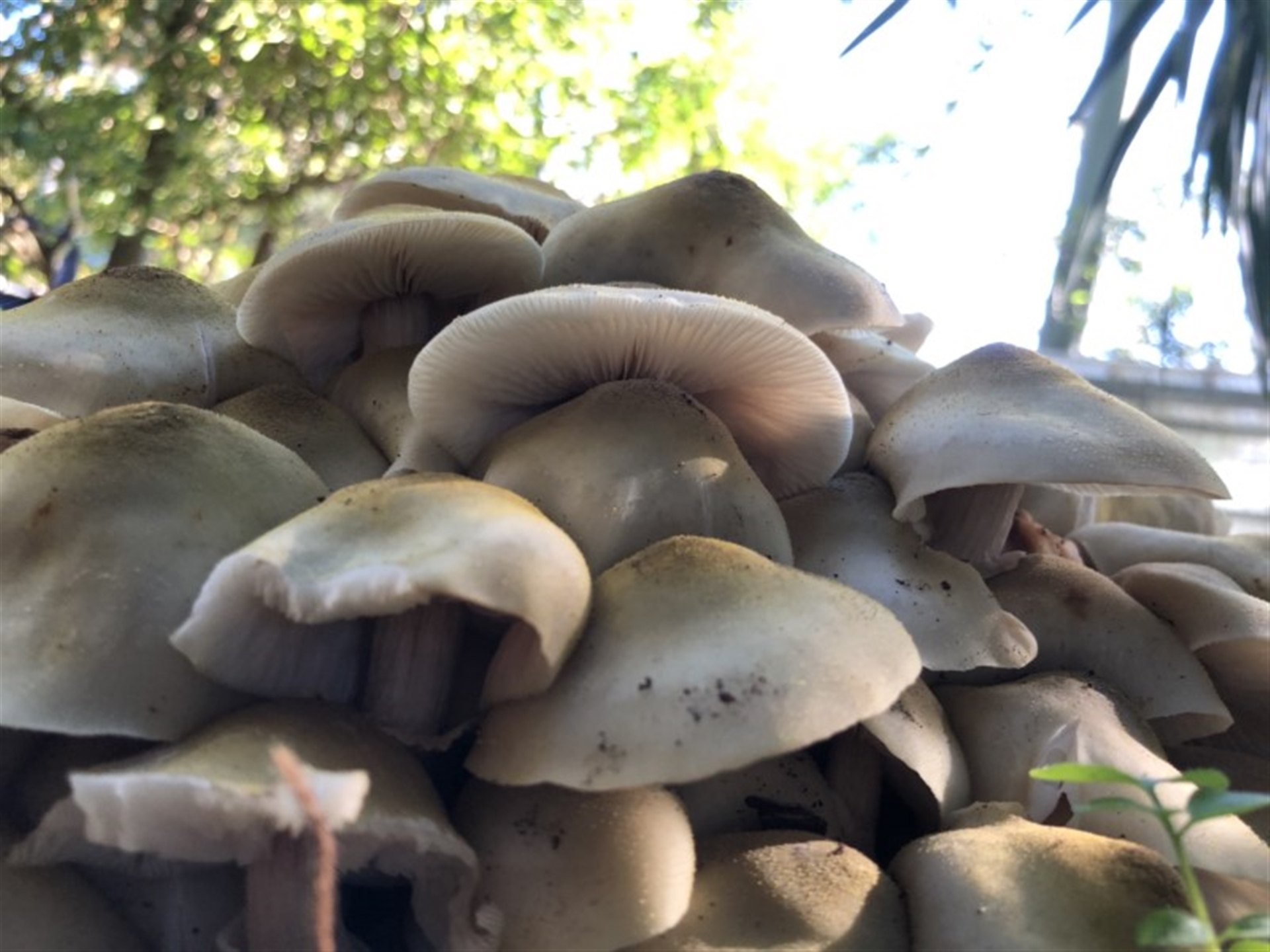 Did you take a photo that shows the stem (stipe)? Initially looking at the colour I thought they might be omphalotus nidiformis, the luminous fungus. On closer inspection the caps are the wrong shape. The front cap on image 1, the one with the little fungus fly (Tapeigaster luteipennis) on the left edge appears to have a dusting of white spores on the back section. I'm wondering if they might be an Armillaria. I can't see the cap surface clearly enough, which if Armillaria would have a 'gritty' look about it. The stipe would have a stubby ridge, ring on the upper half of the stipe and the stipe itself would most probably be lighter in colour about that ring and paler below. Sometimes there's a hint of pink in the gills (lamella). If you have the opportunity to have a closer look or better still additional photos I may be able to give you a definite identification. An impressive group!