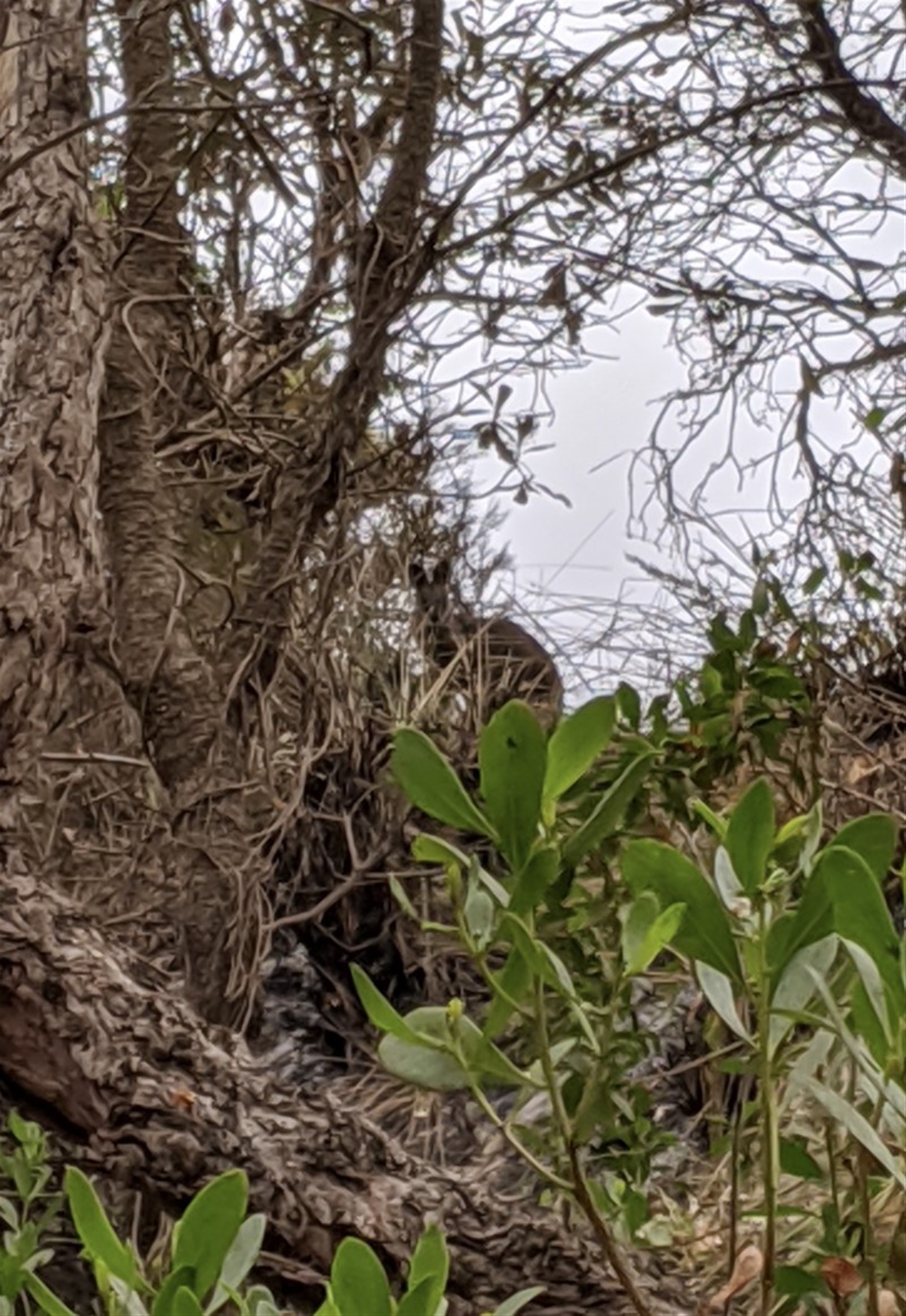 On the edge of the burnt bush behind the dunes.