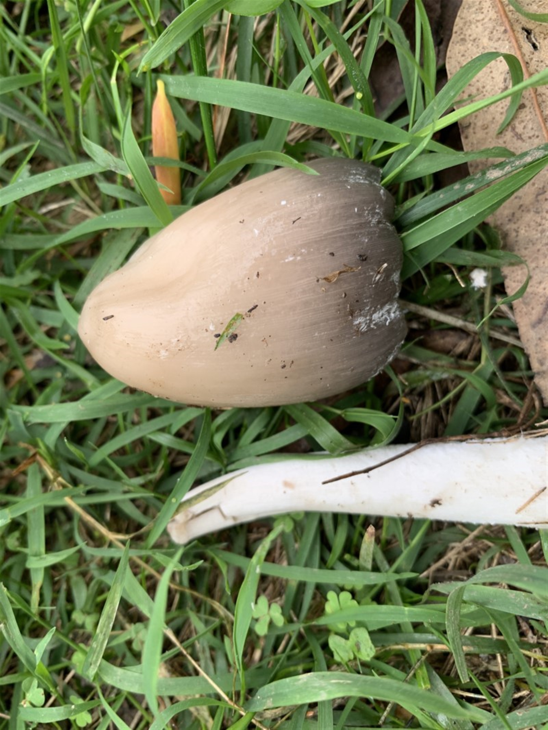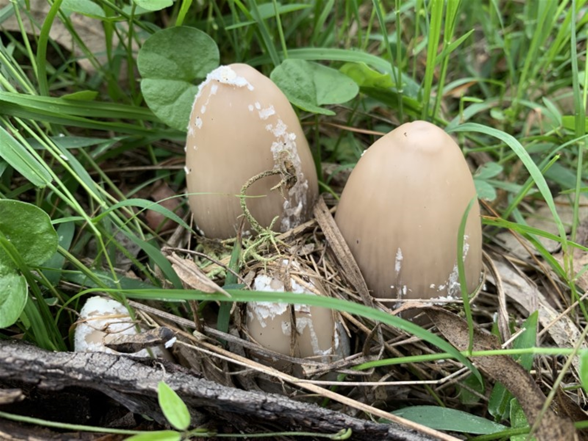 These looked like a nest of eggs. Caps were approx. 5 cms tall, 4 cms wide with no stalks seen. I found one that was on the ground broken. This had a stalk approximately 10 cms or so tall and the broken cap was approximately the same size as the largest 'eggs in the nest' (if you follow my meaning).