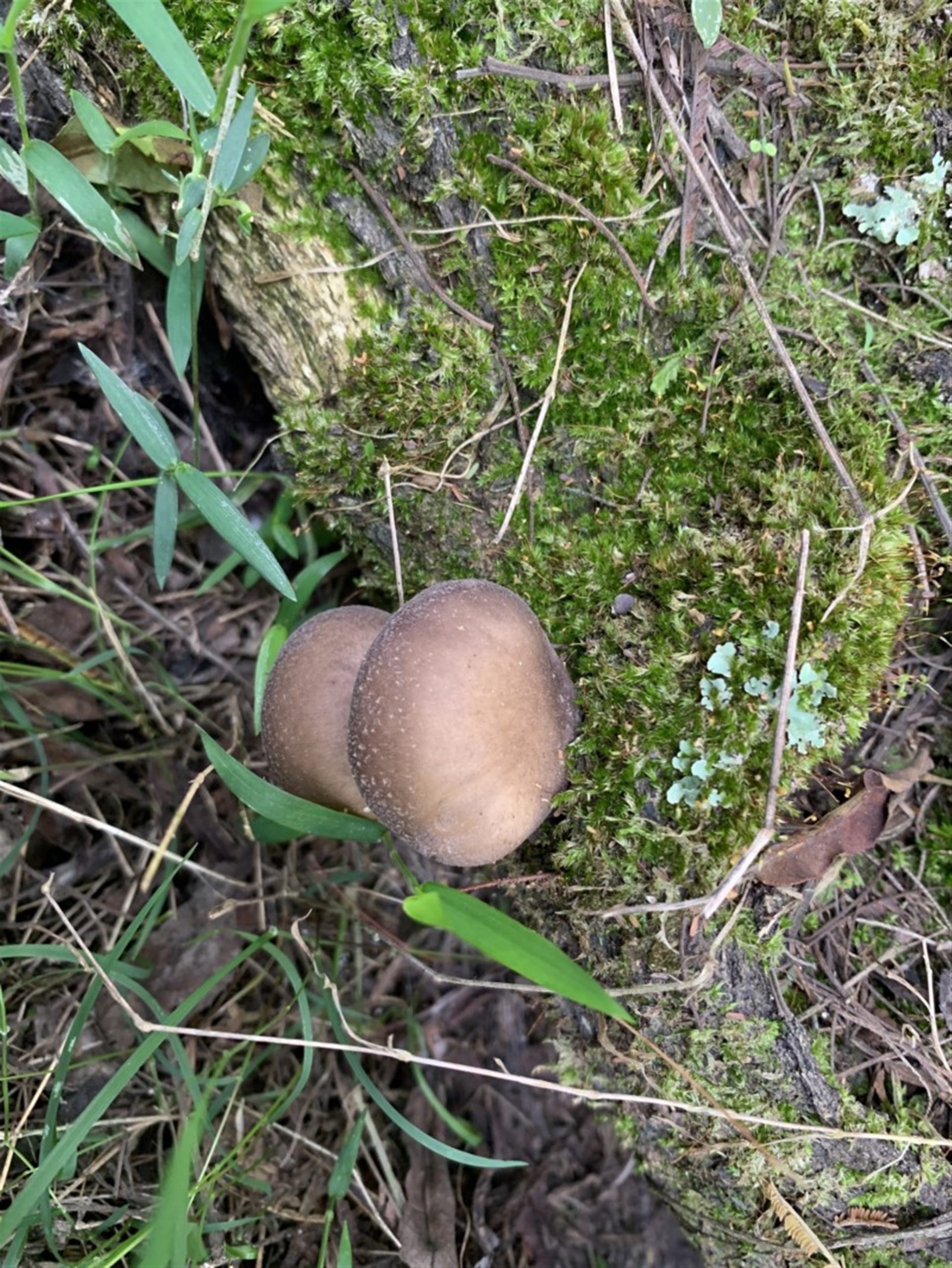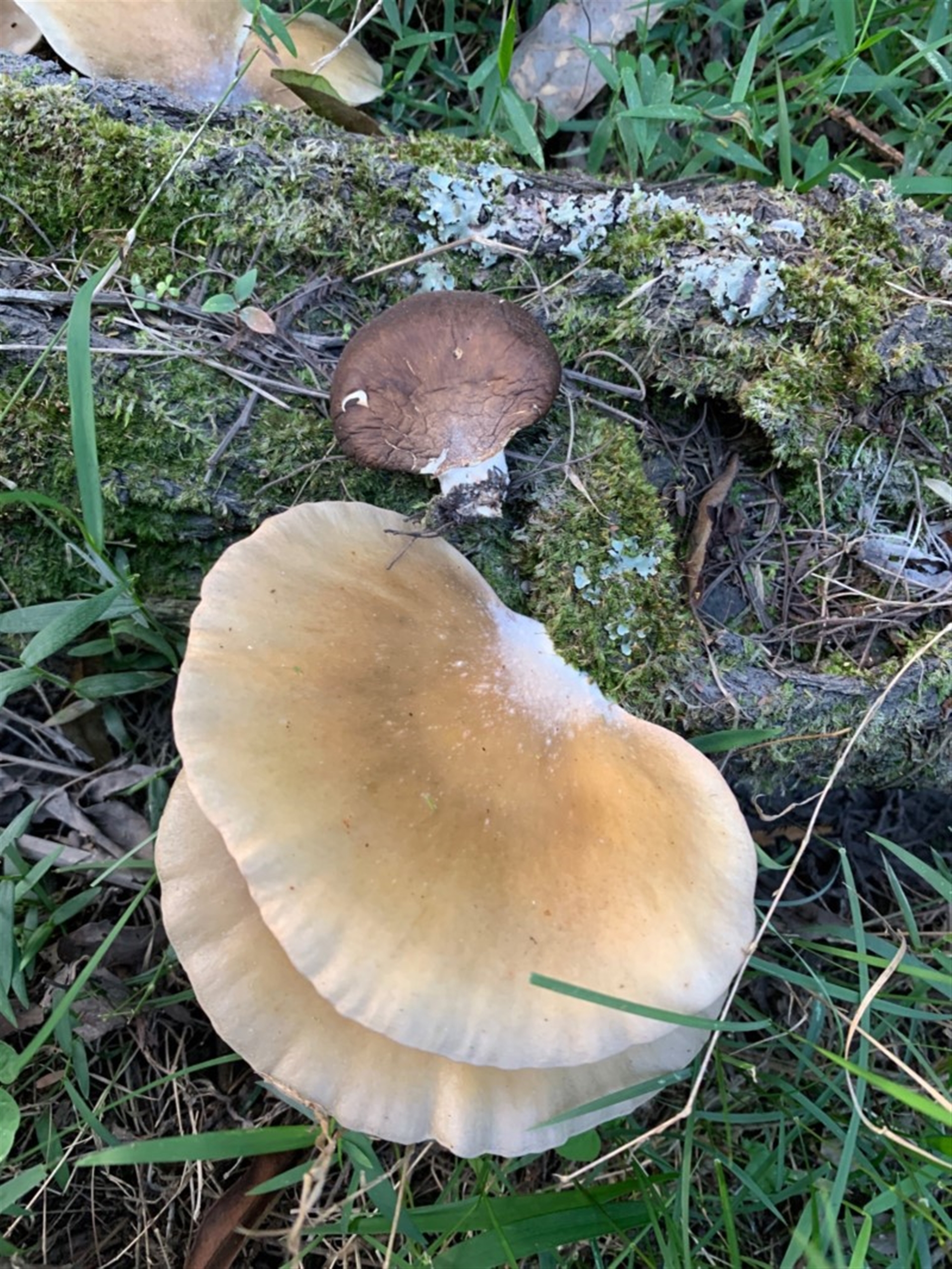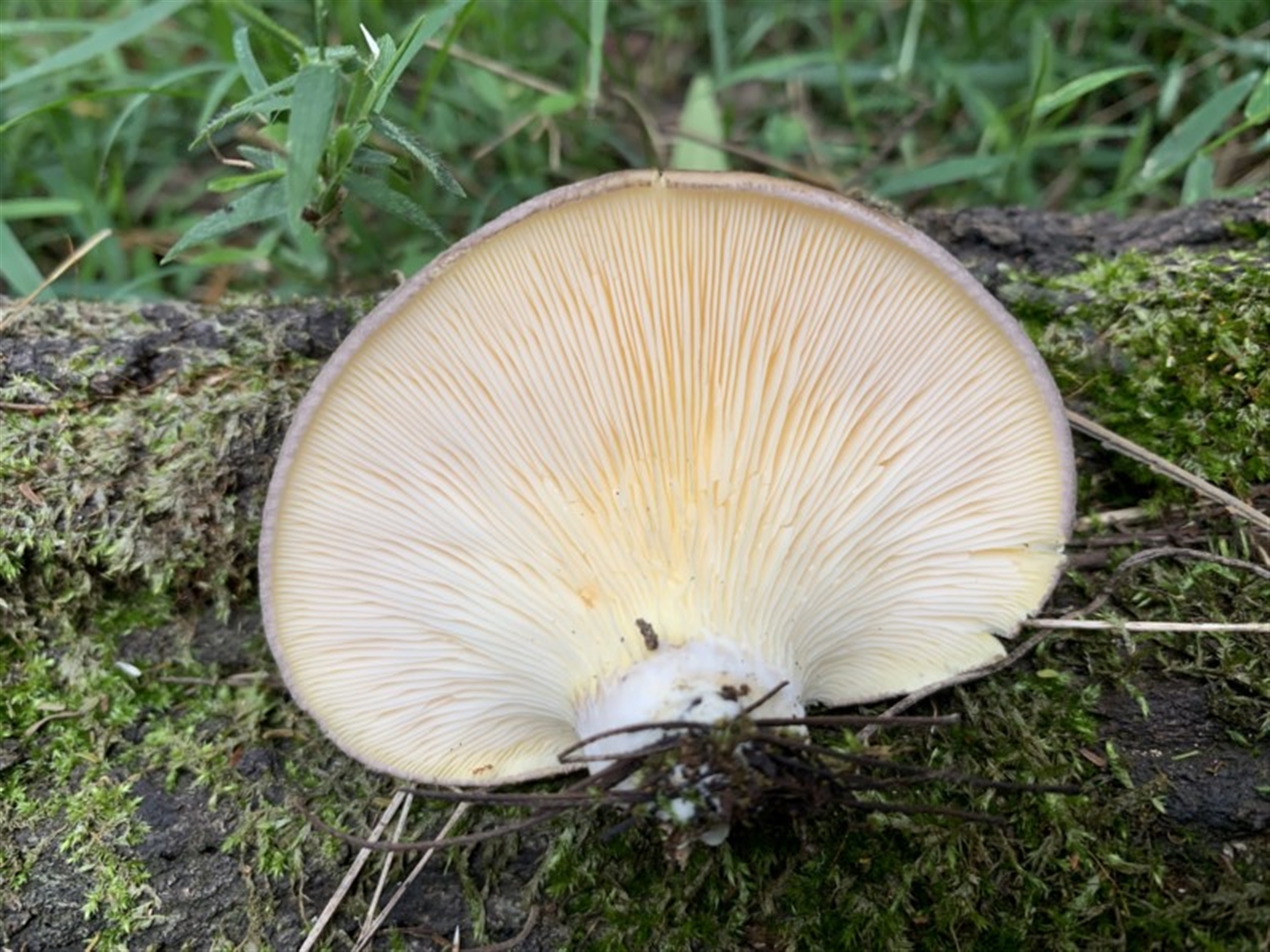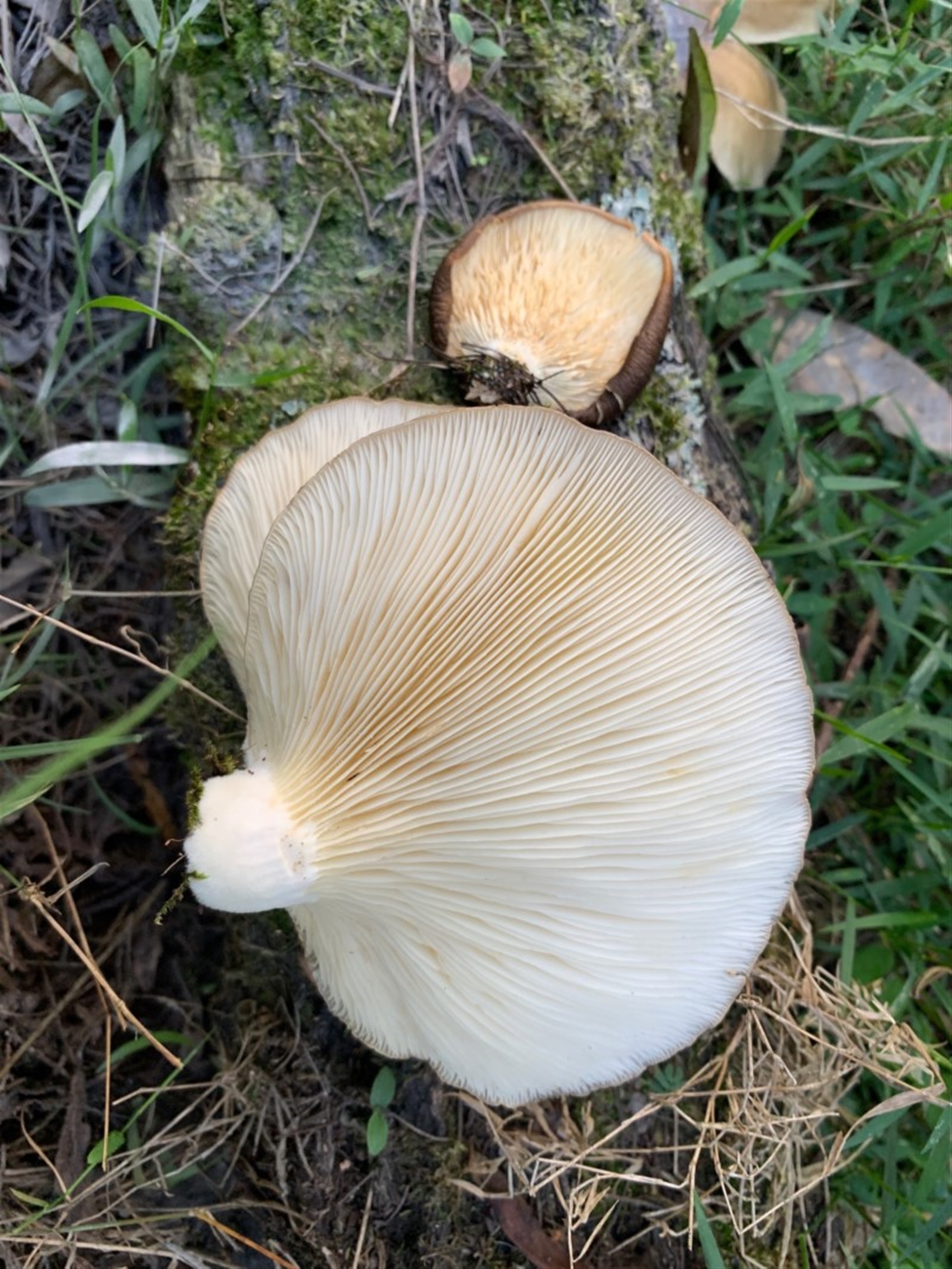 This is appears to be a very interesting record Fiona. At first I thought it might be a Pleurotus, however the gills (lamellae) don't appear to be decurrent (running onto the stipe). Also it is more 'bell shaped' than what I would expect with a Pleurotus. I'm wondering if it might be a Conchomyces sp. possibly C. bursiformis
