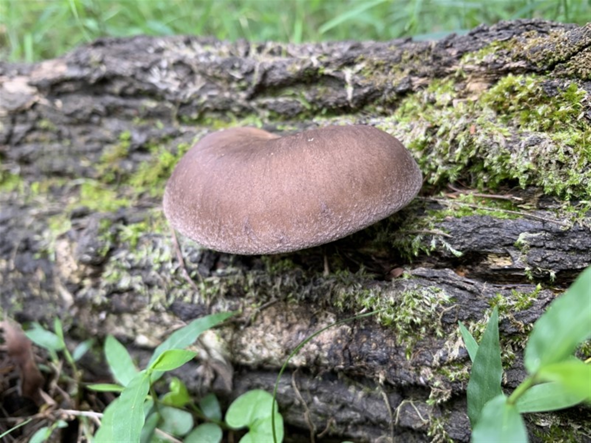Darkish brown solid fungi with edges a slightly different colour. Underside pale coloured gills. Changes to a pale colour with a slight brown tinge on the cap as it gets larger. The gills remain the same colour.