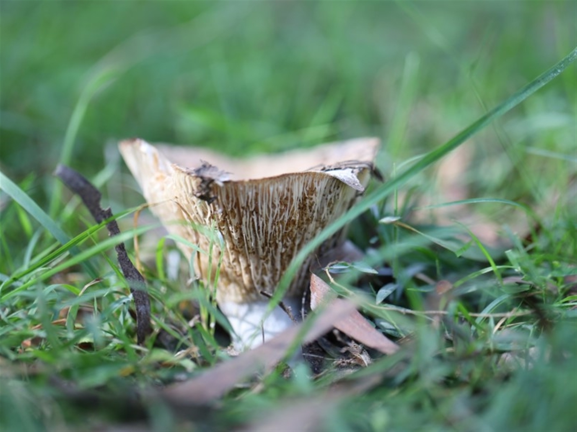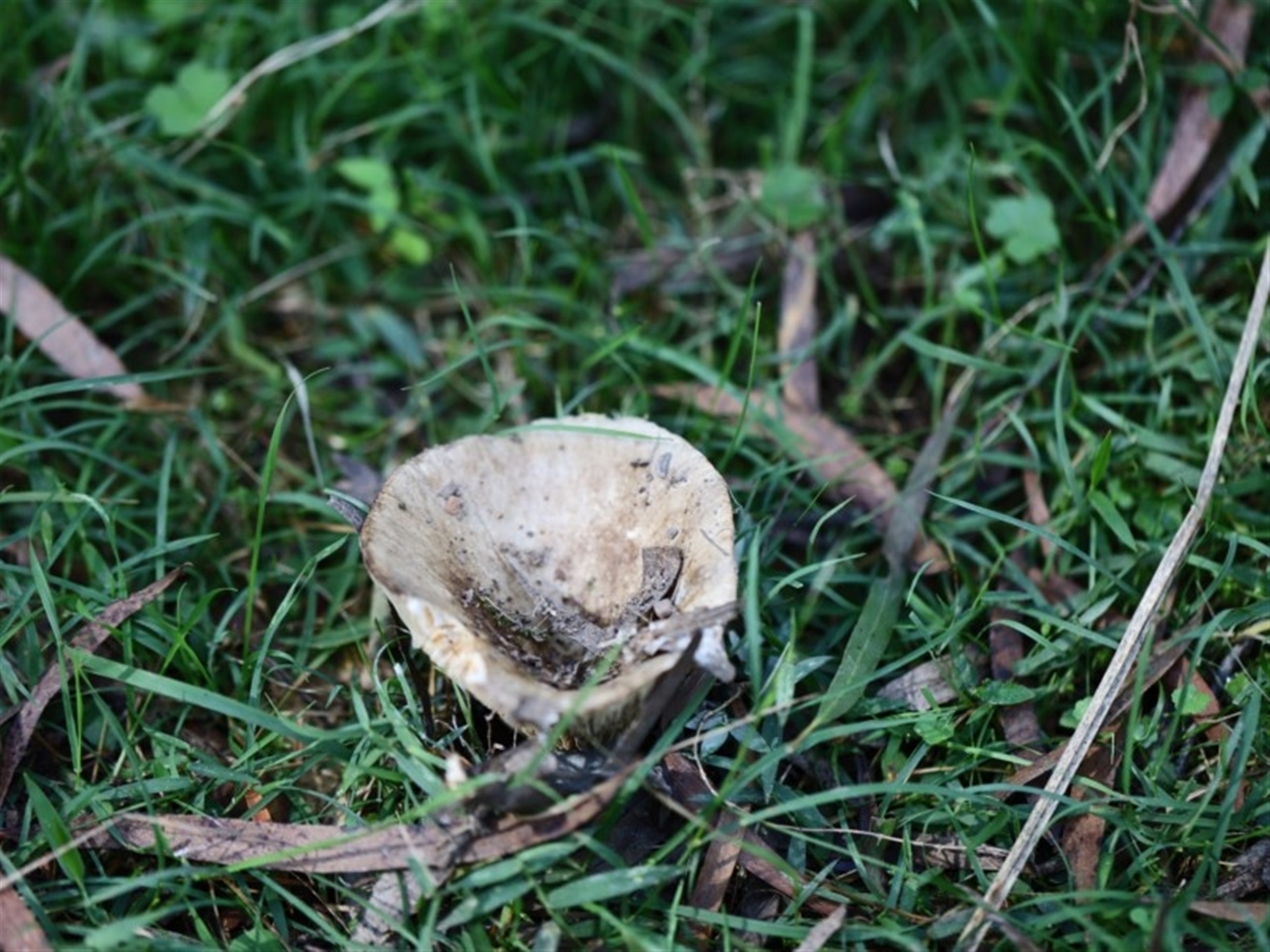 Single dirty white cup shaped fungus. Cap size approx. 5 cms across and roughly 5 cms high. White gills are exposed The stalk was thick and white.