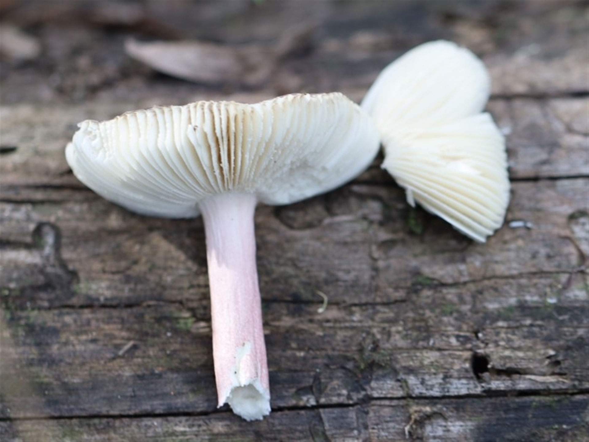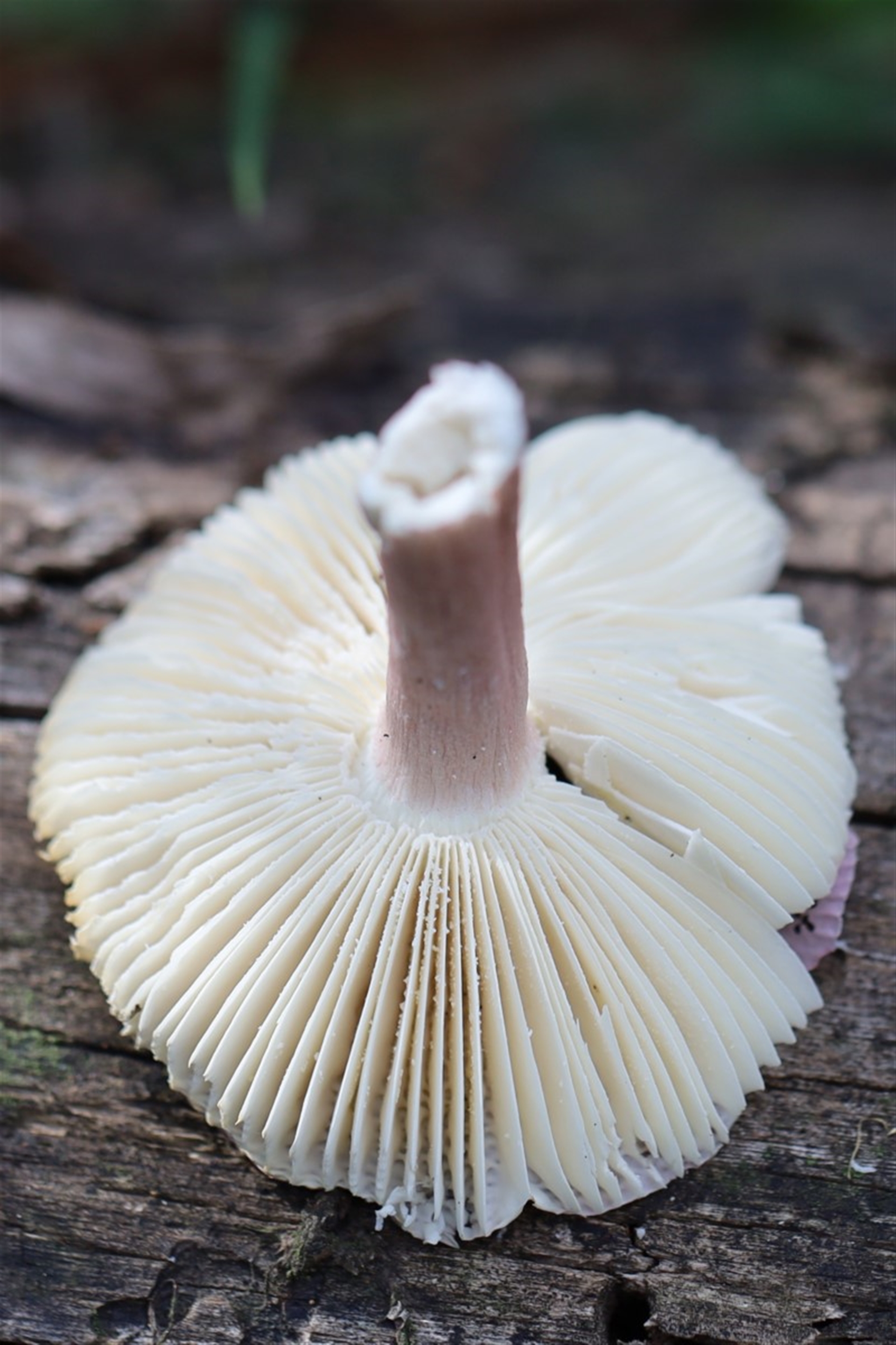 Purple/pink tinged cap with gills visibly fringing the outside. Deep white gills, slightly darker towards the cap. Stem a purple/pink tinge. I'm hoping the last image is the same fungi just at a younger stage.