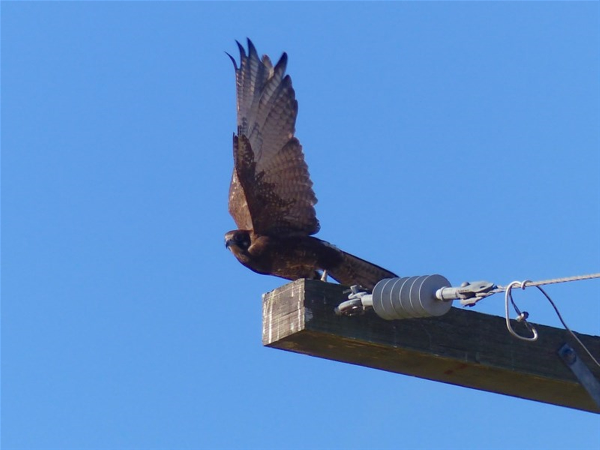 We have seen a Brown Falcon in this area before. Lucky to get a photo of take-off.