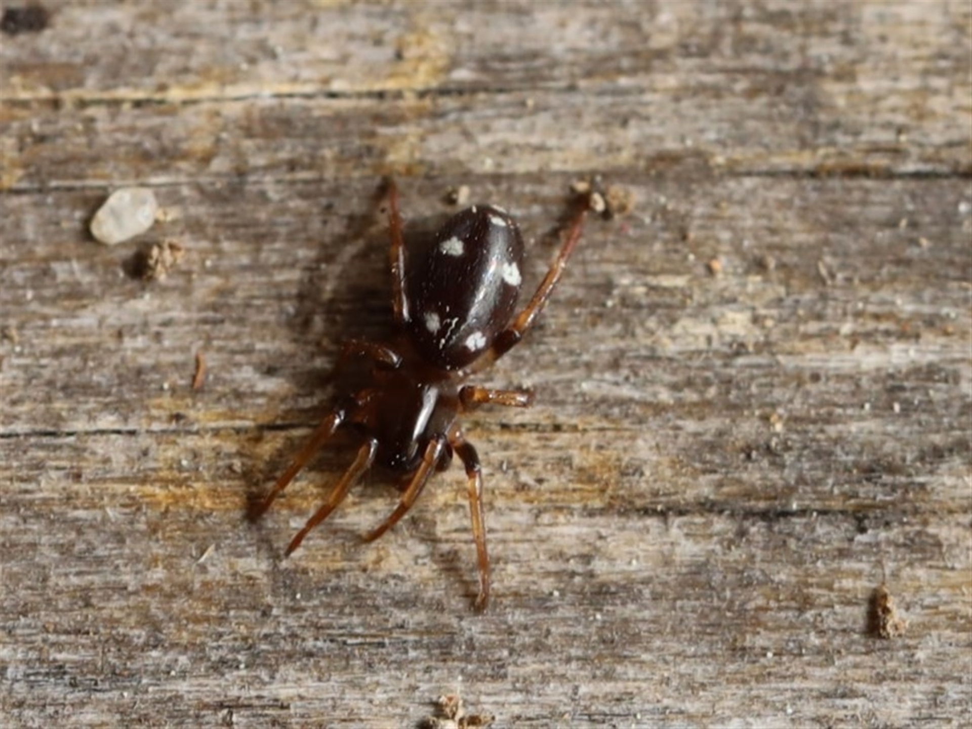 Small black spider with brown legs and 4 uneven white spots on the back. They were found running amongst ants that were similar colour and only a fracture smaller.