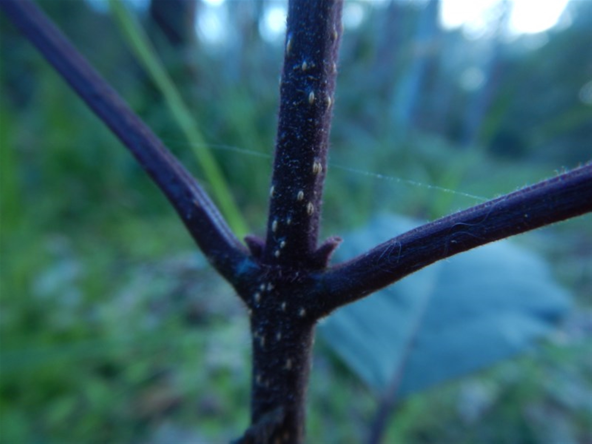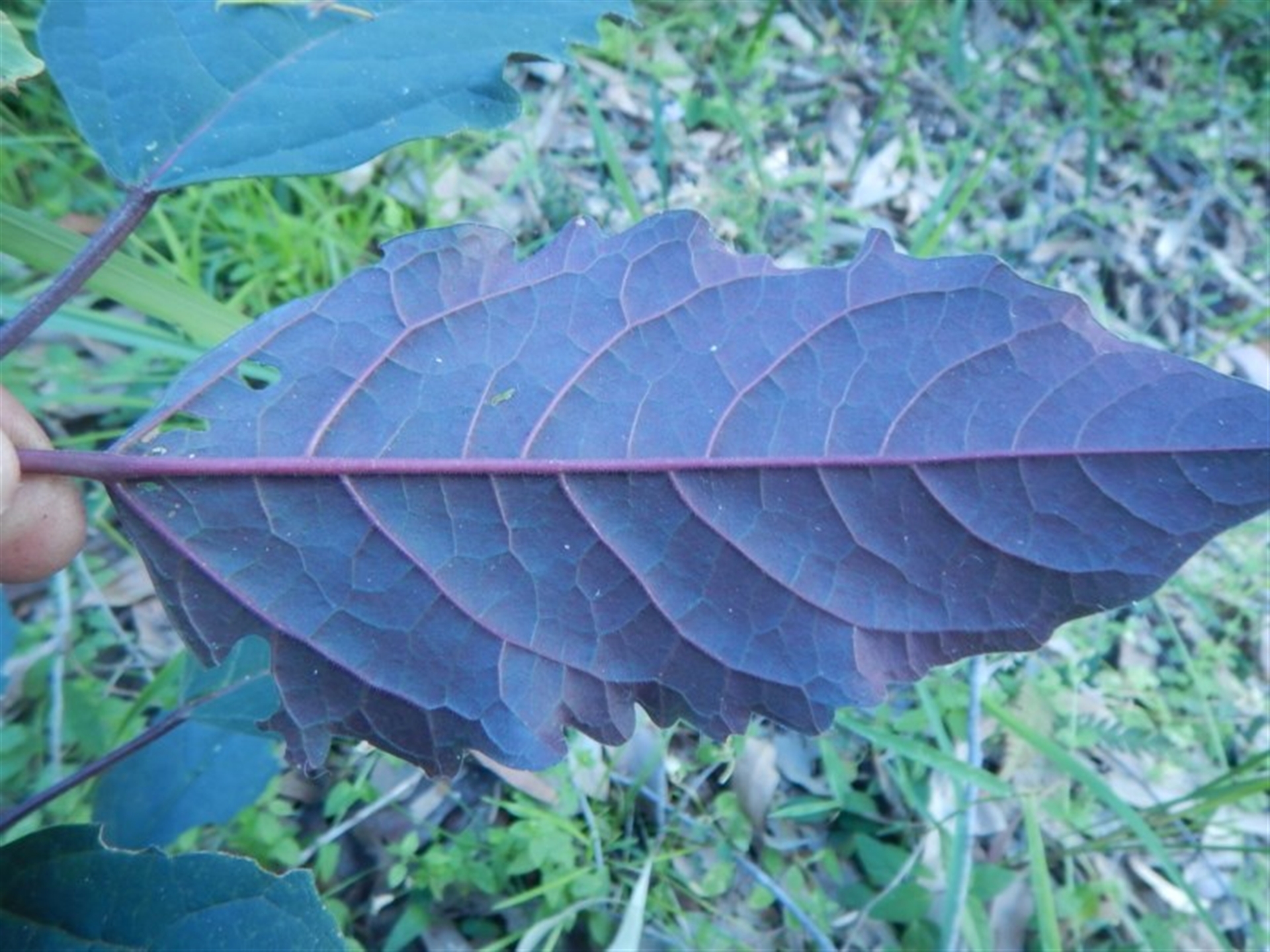 Small tree approx 50cm high. Leaf dark green on top and purple underneath. Trunk dark purple with small white spots.