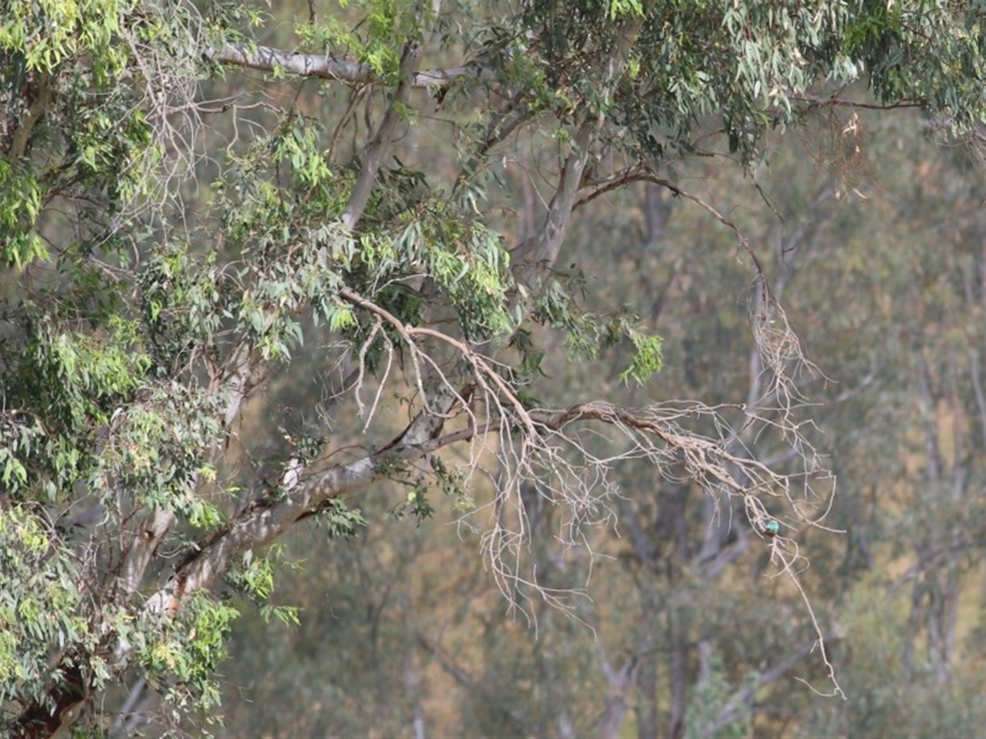 Looks like a tree shot. But this is what I saw - way off in the distance - a flash of blue-green colour (lower right) on the dead branches.