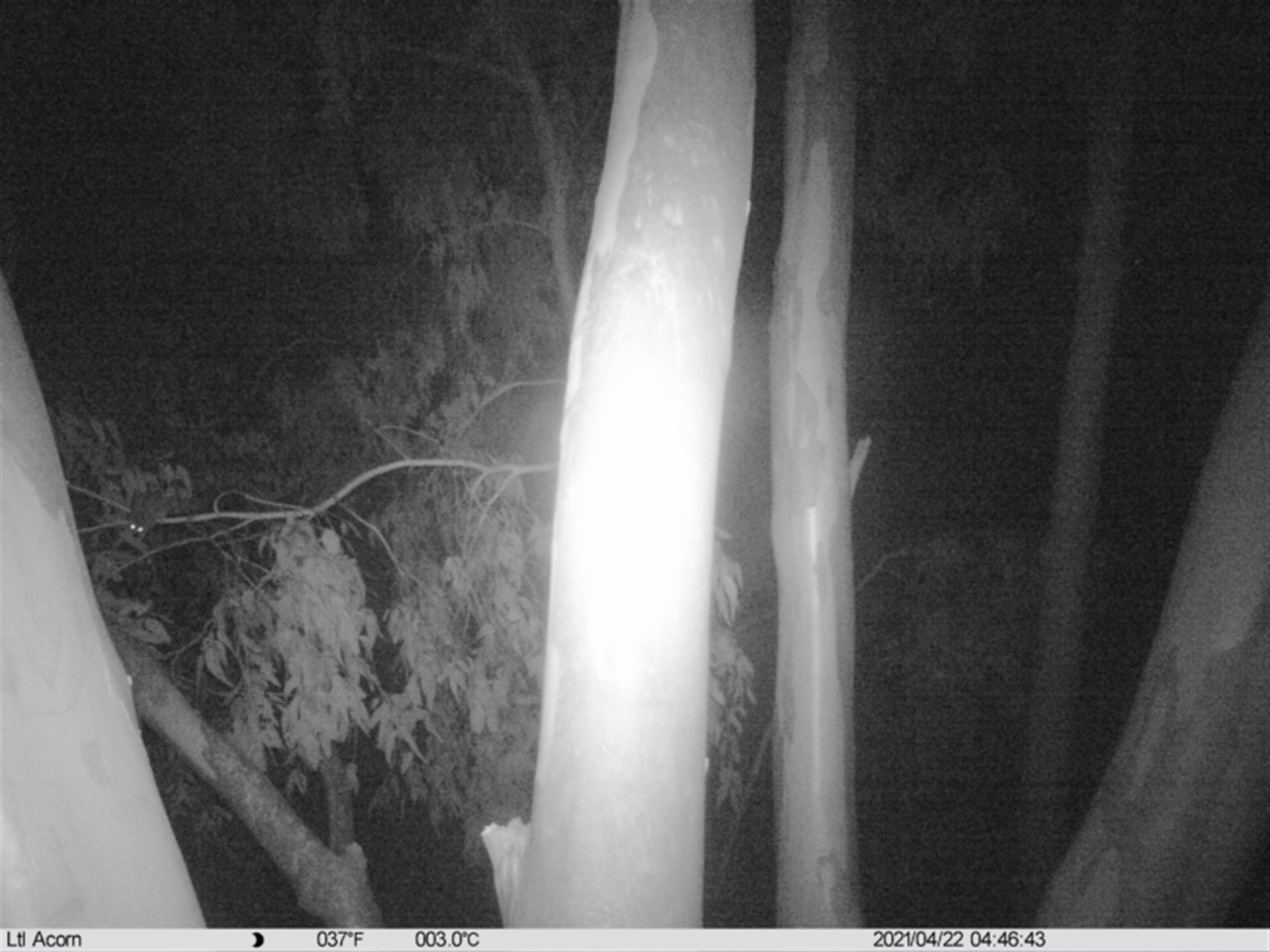 Eye shine visible in both pictures on the small branch in the centre of the photos. Body shape and tail seen as the glider moves along the branch