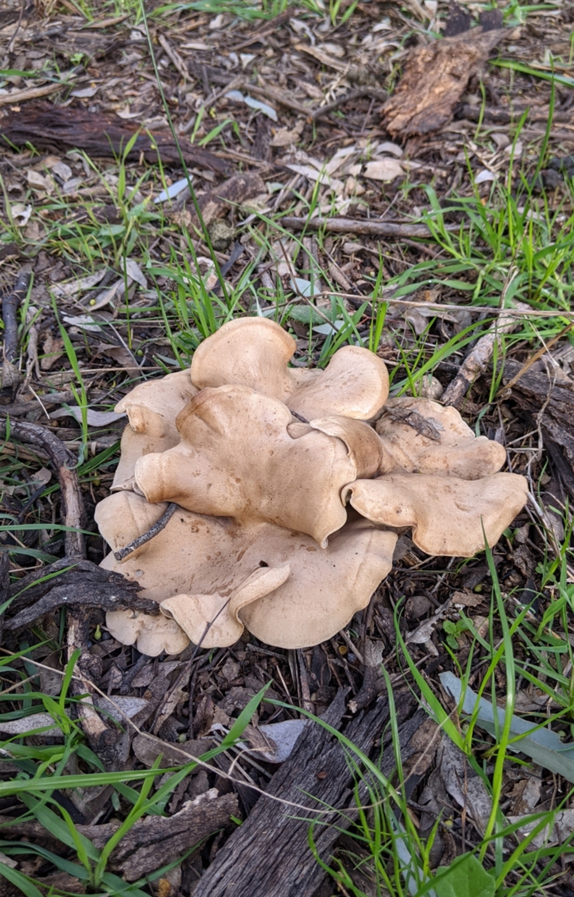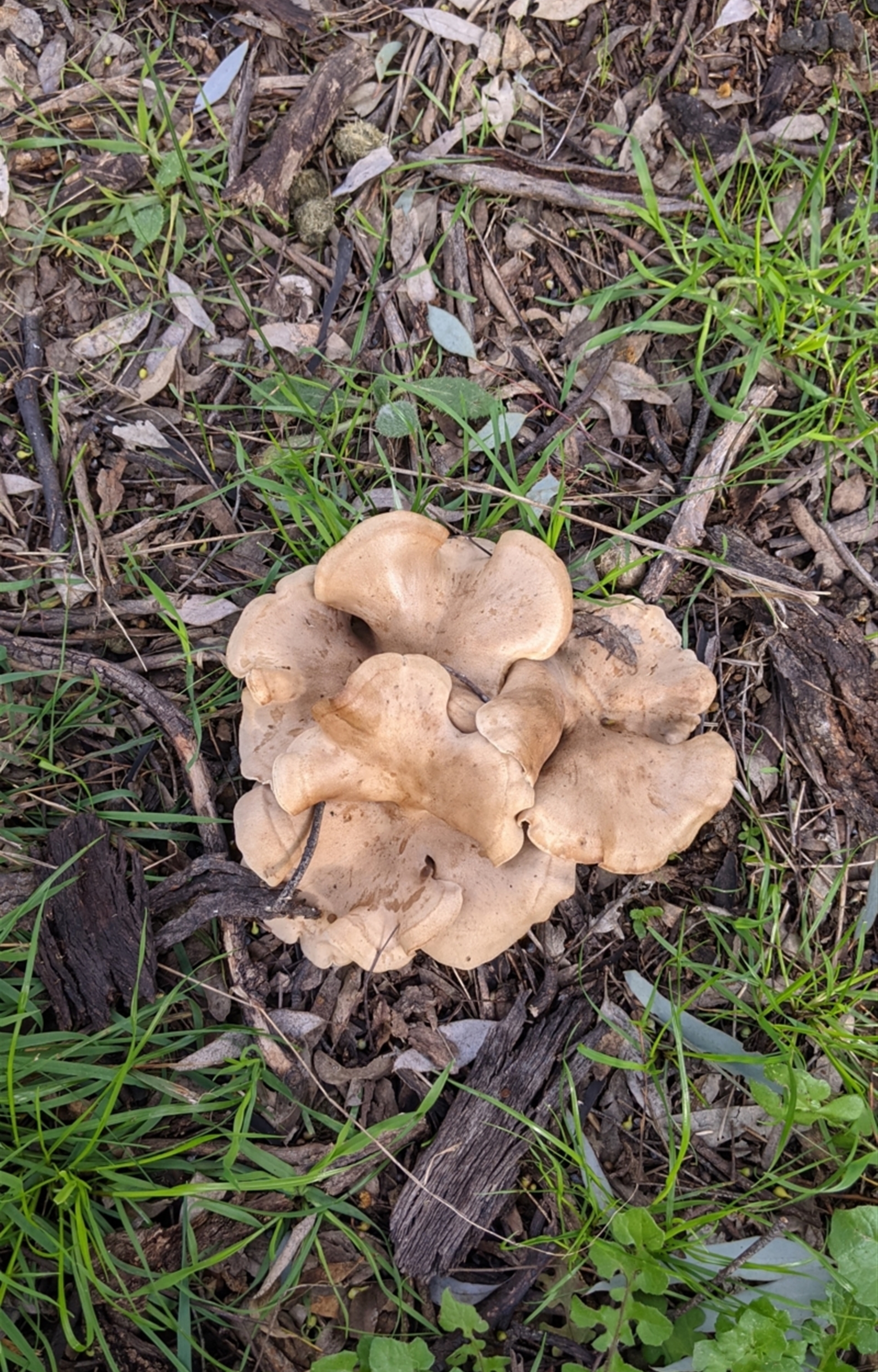 Few scattered clusters of this mushroom, growing in the leaf litter/grass under a large gum tree