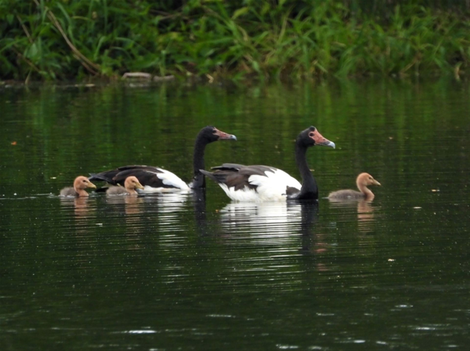 A Magpie Goose family having a swim.