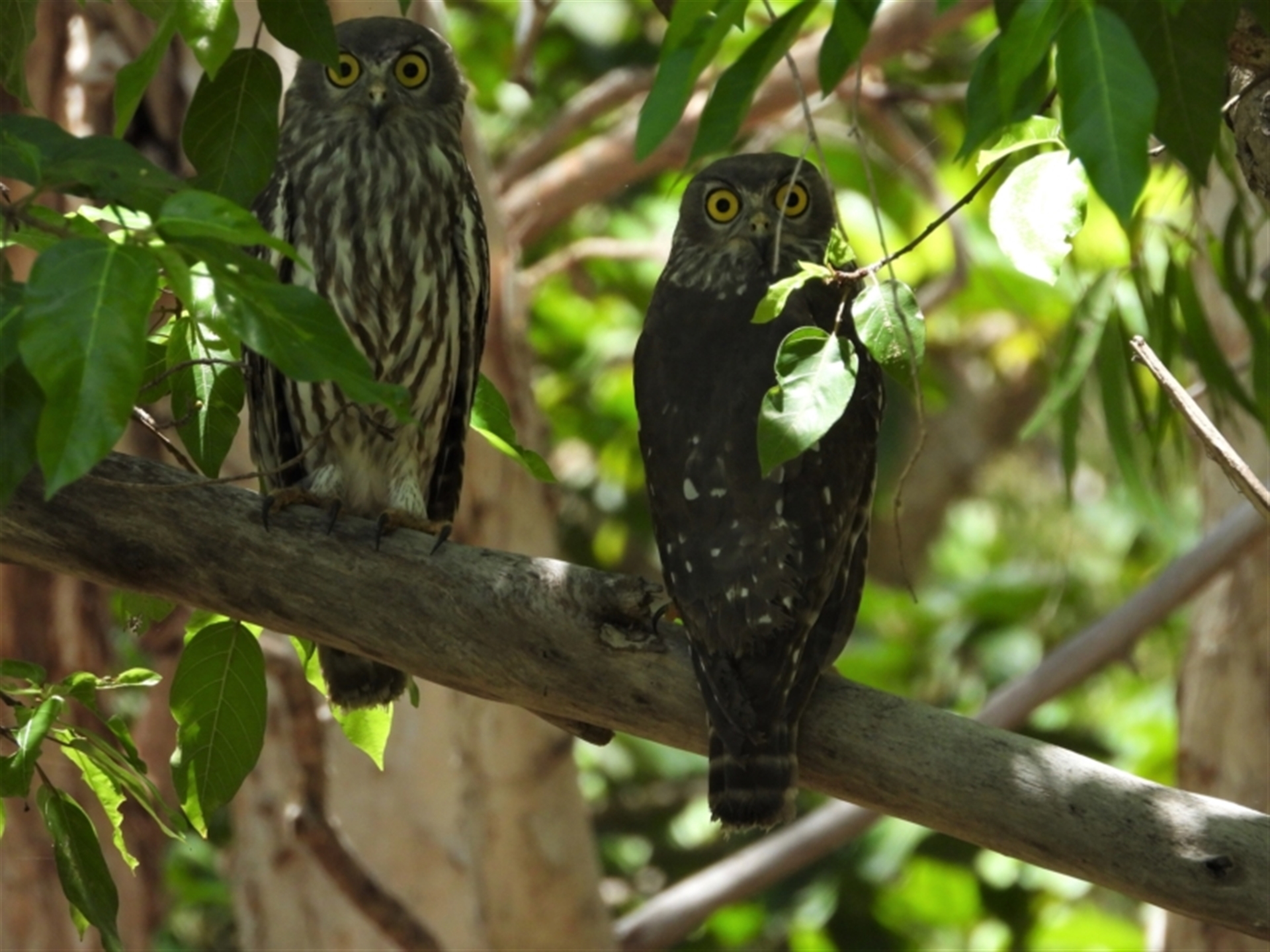 A pair of Barking owl's perched in a tree.