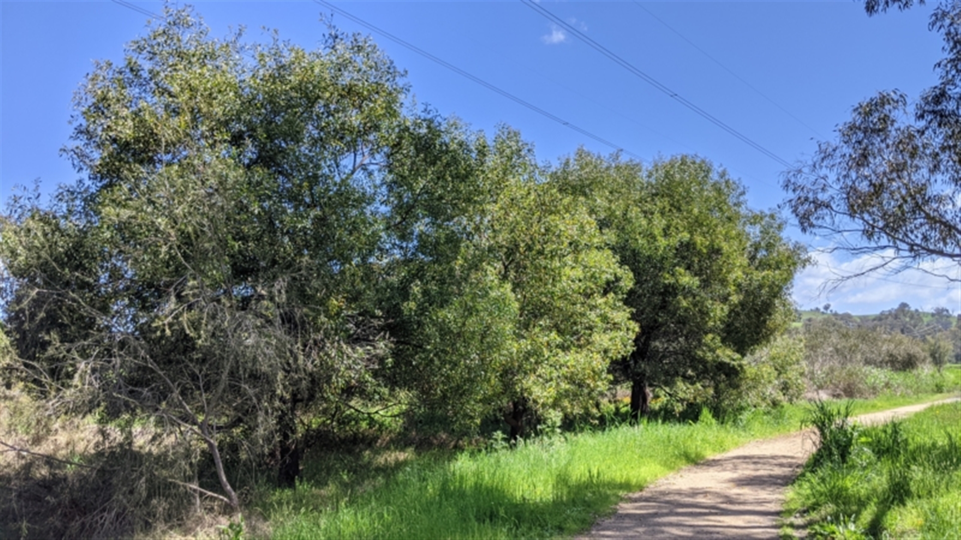 Blackwoods growing in a row along the path. They're old, but most likely were planted. Just at the end of their flowering.