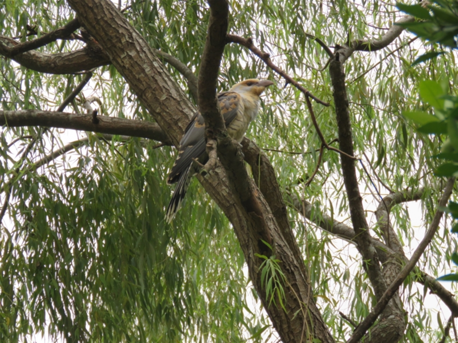 Juvenile Channell Billed Cuckoo waiting for food from it's Currawong parents in our garden - the currawongs nested in one of our gum trees close to the house, and once the cuckoo fledged it called for food constantly for 3 months around all the trees in our garden.