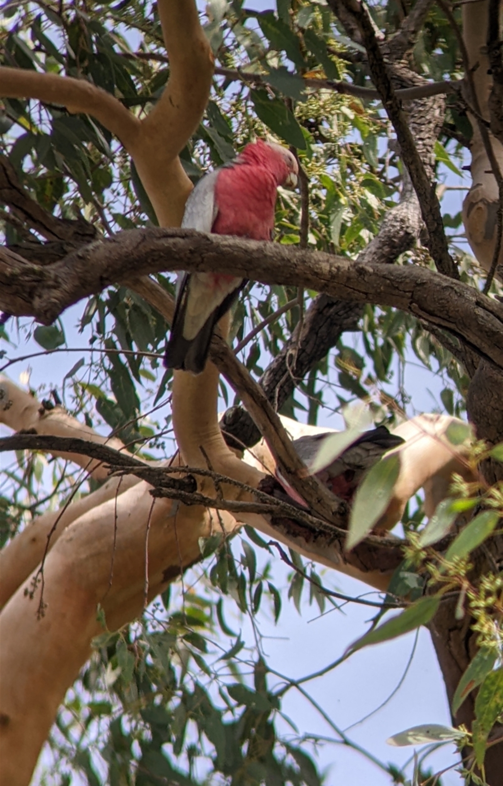 Pair of Galahs resting in the shade of a large gum in the car park of the Springdale Heights baseball field