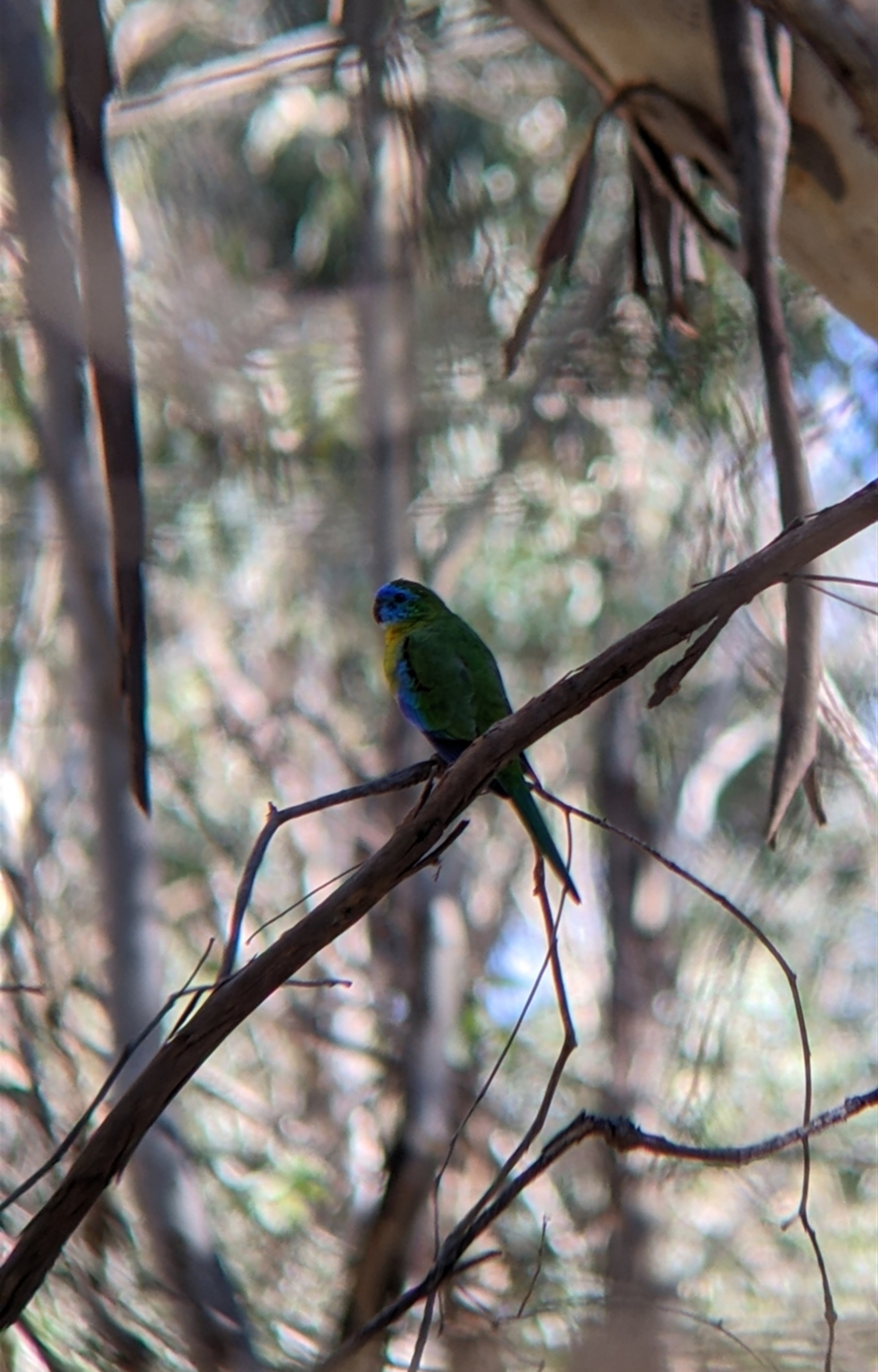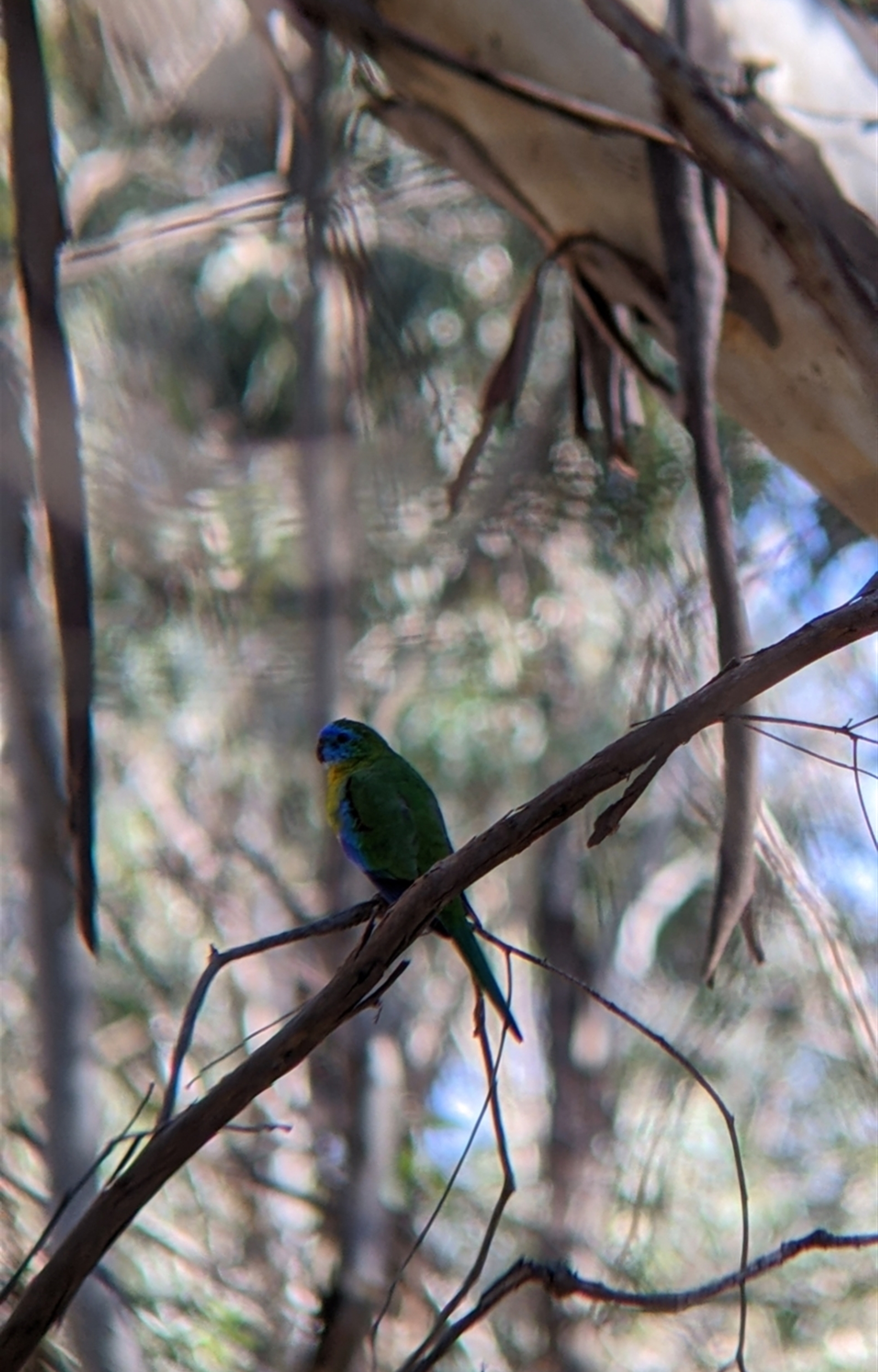 Single turquoise parrot. Was foraging on the ground before we flushed it up into a small dead gum tree
