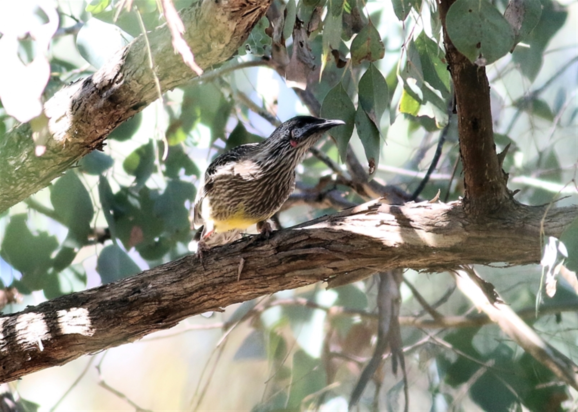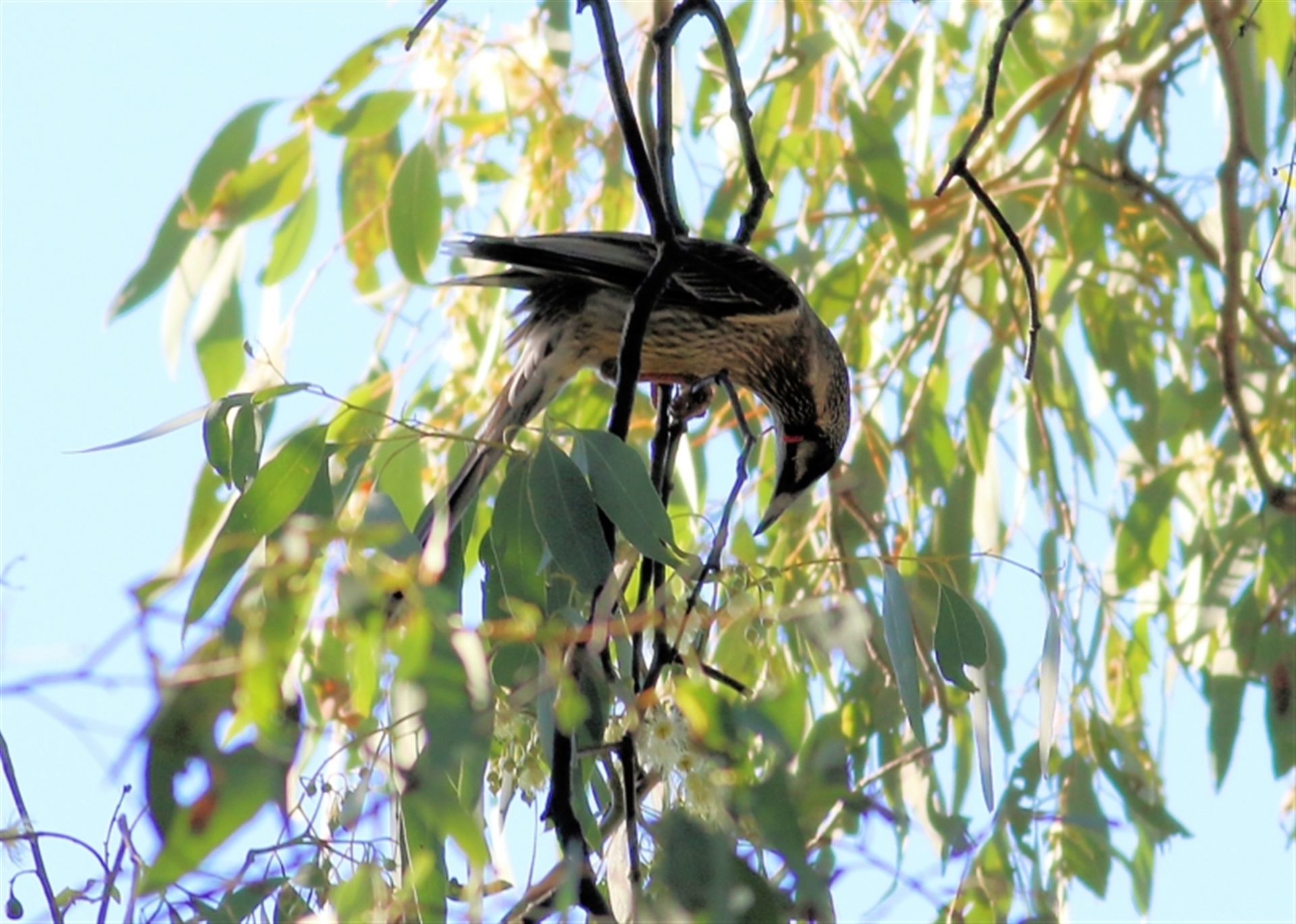 Even though they were greatly outnumbered by the Noisy Friarbirds they were doing a good job of hanging onto the flowering gum trees they had staked out. There were not many trees visibly in flower, but they were all protected by Red Wattlebirds.