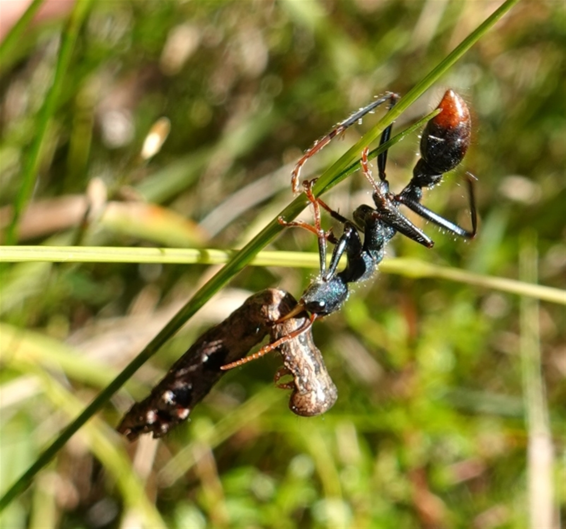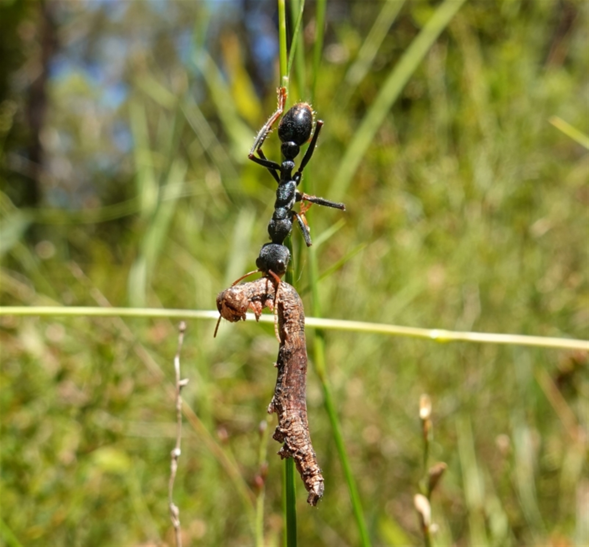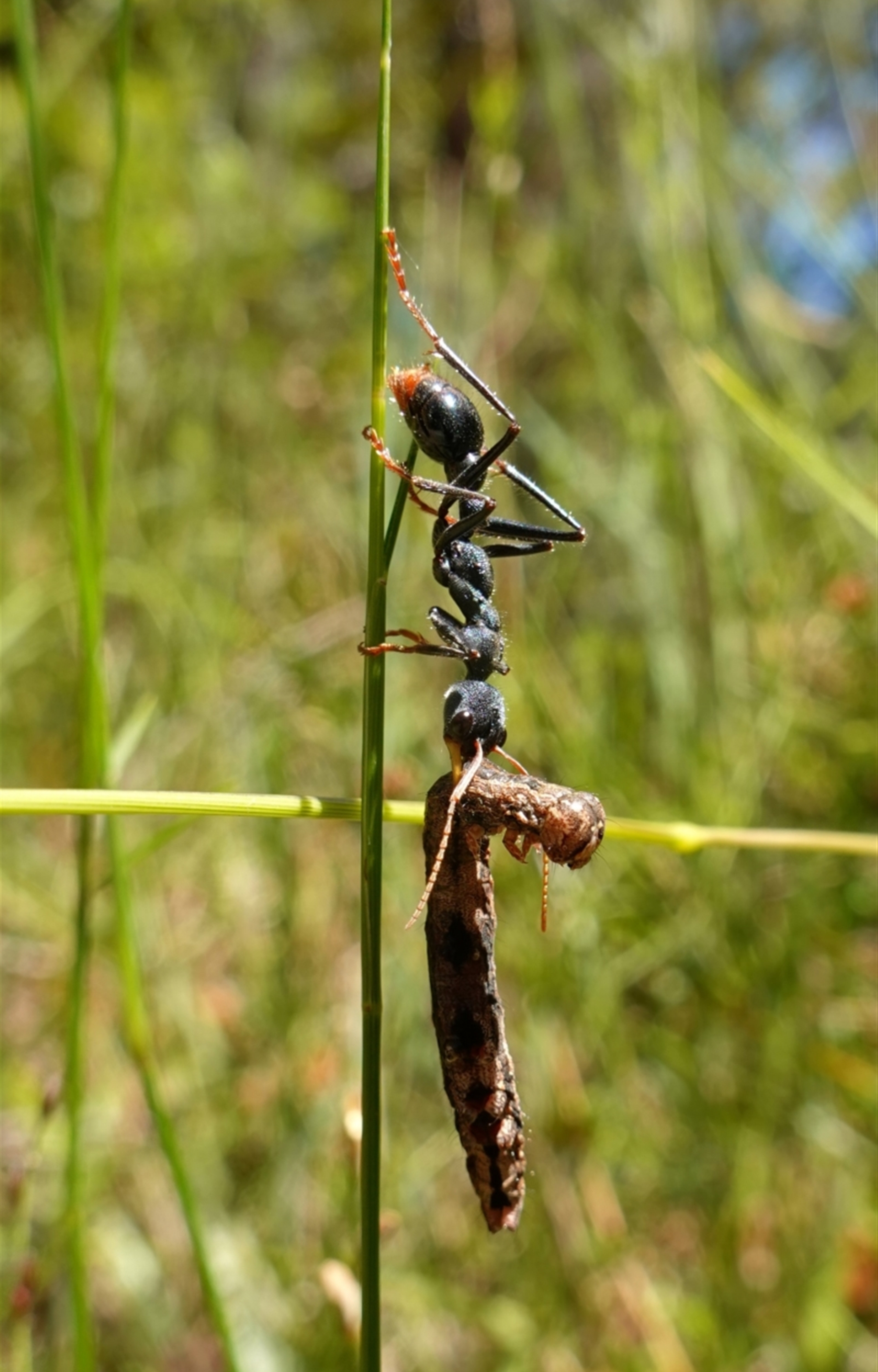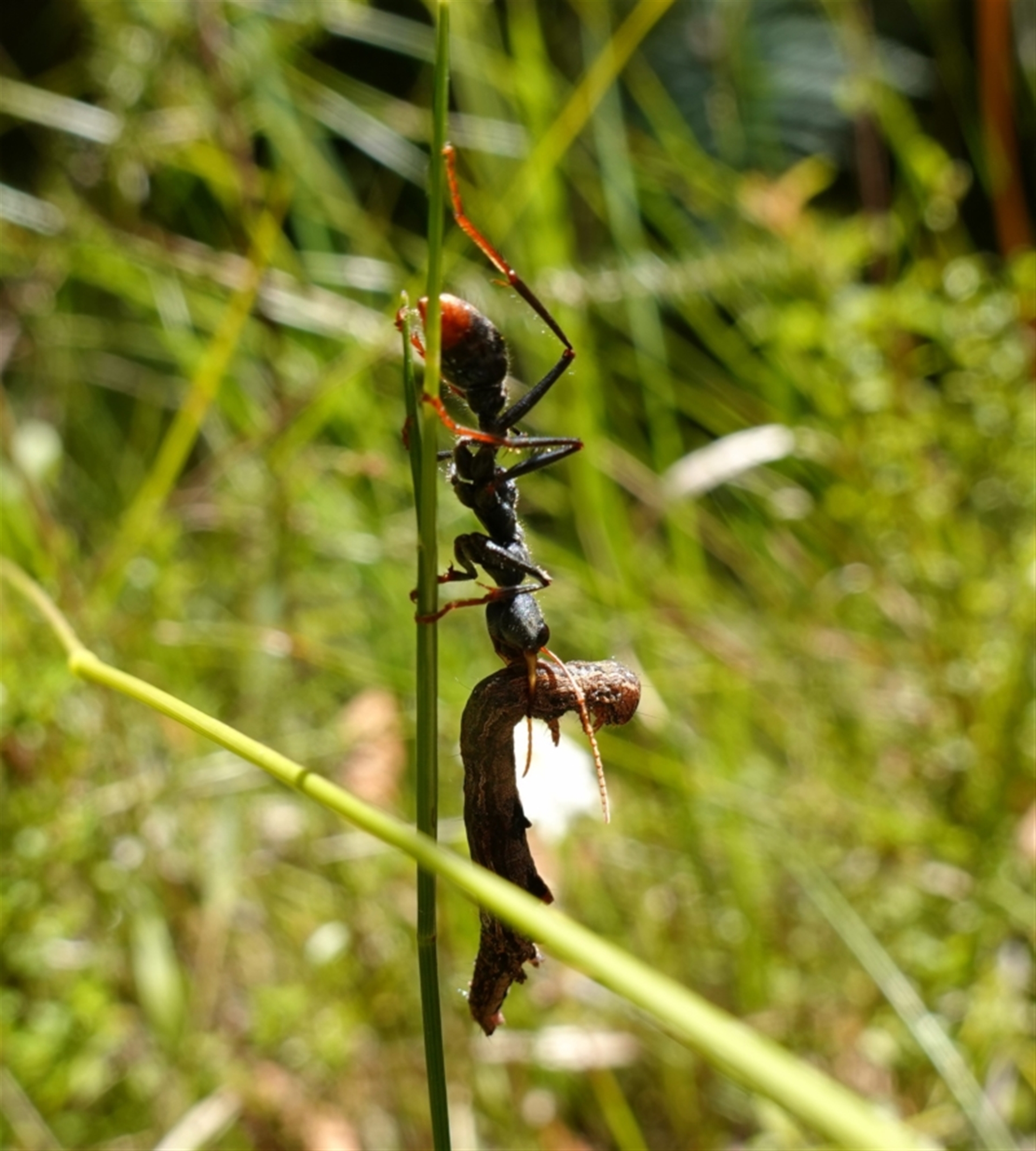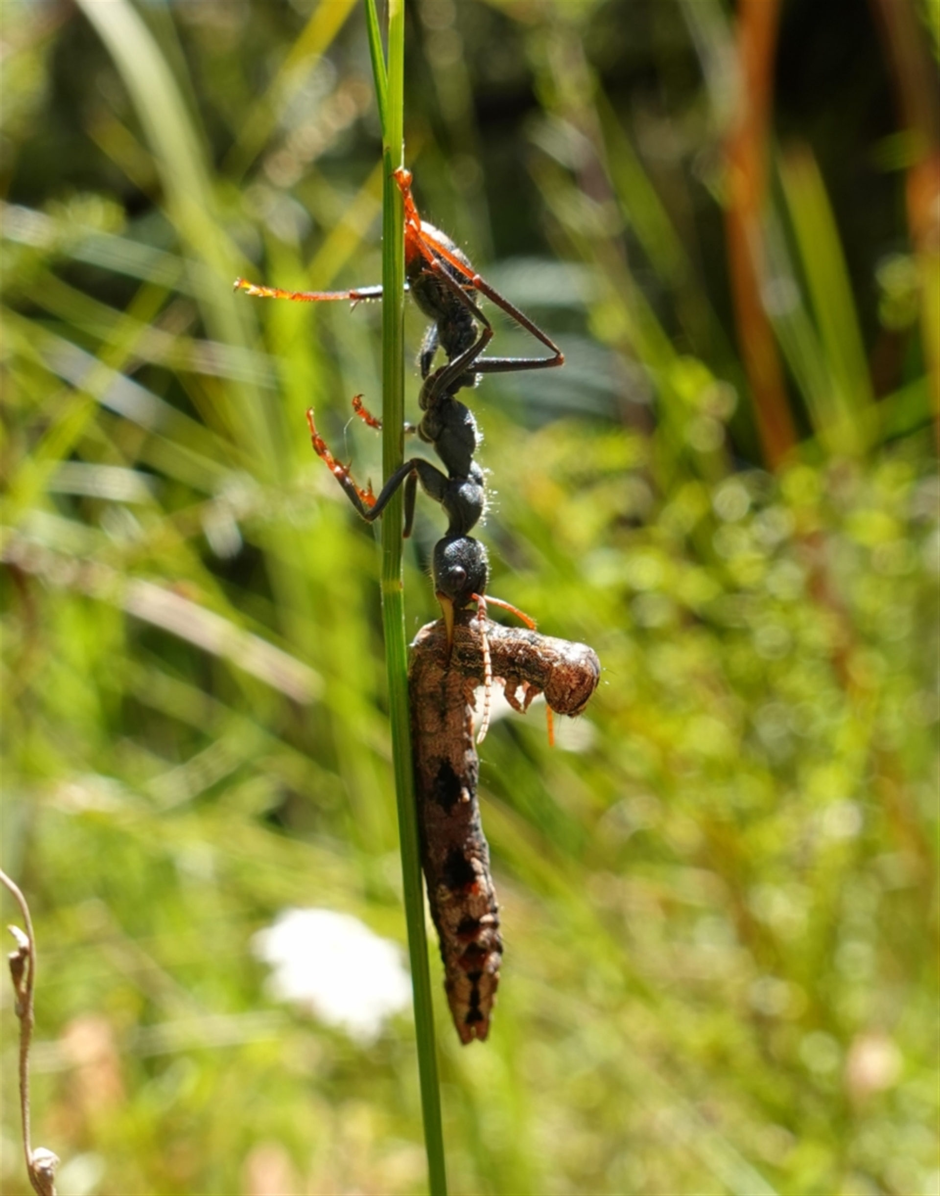 I have seen this type of caterpillar at the top of these grass stems. It appears the ant has pulled the caterpillar off and is trying to slowly lower it to the ground.
