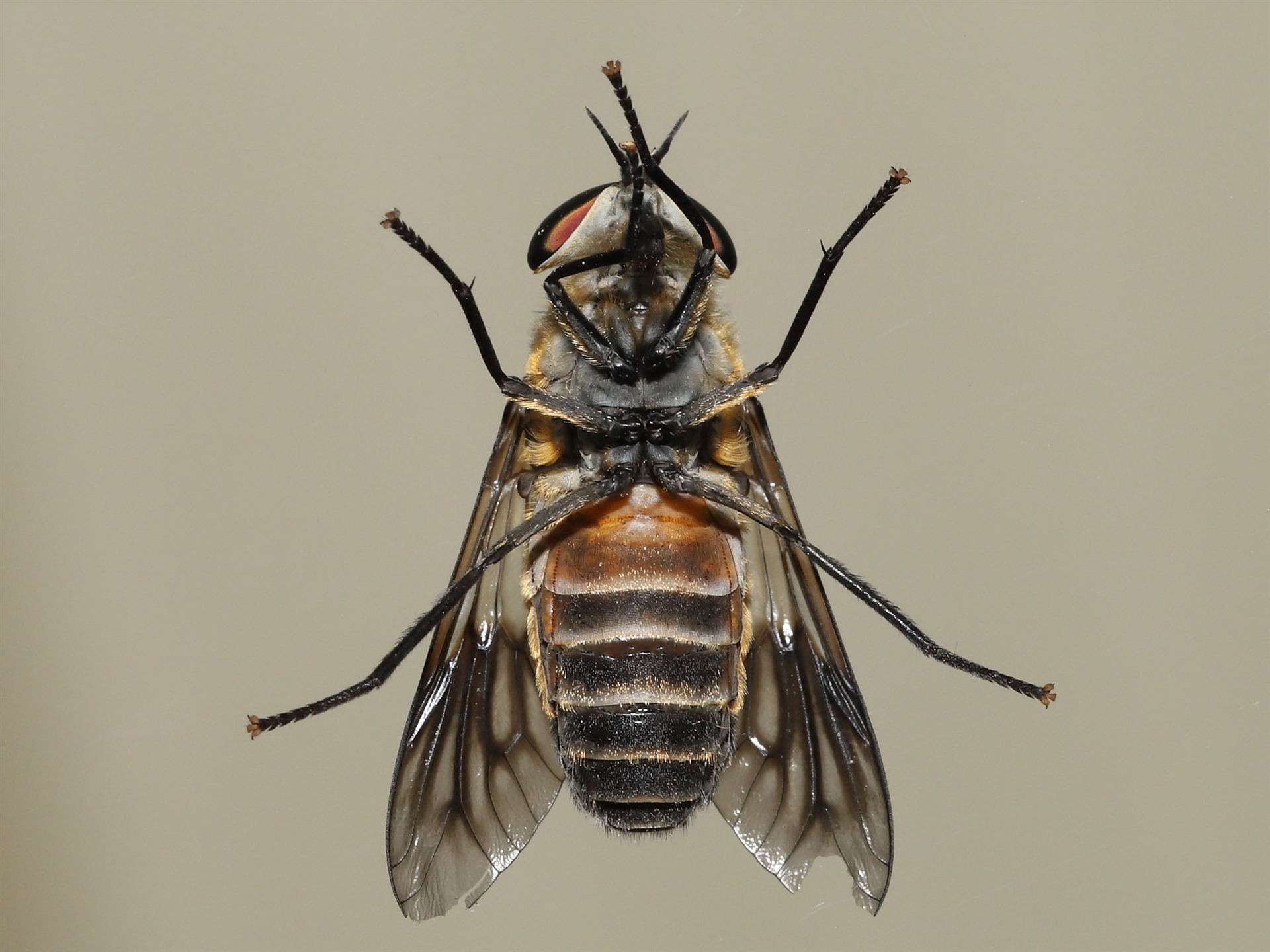Possibly a March fly and maybe female based upon there being space between the compound eyes, and on the development of the proboscis. However, not sure. The ends of the wings show signs of tearing and wing wear.