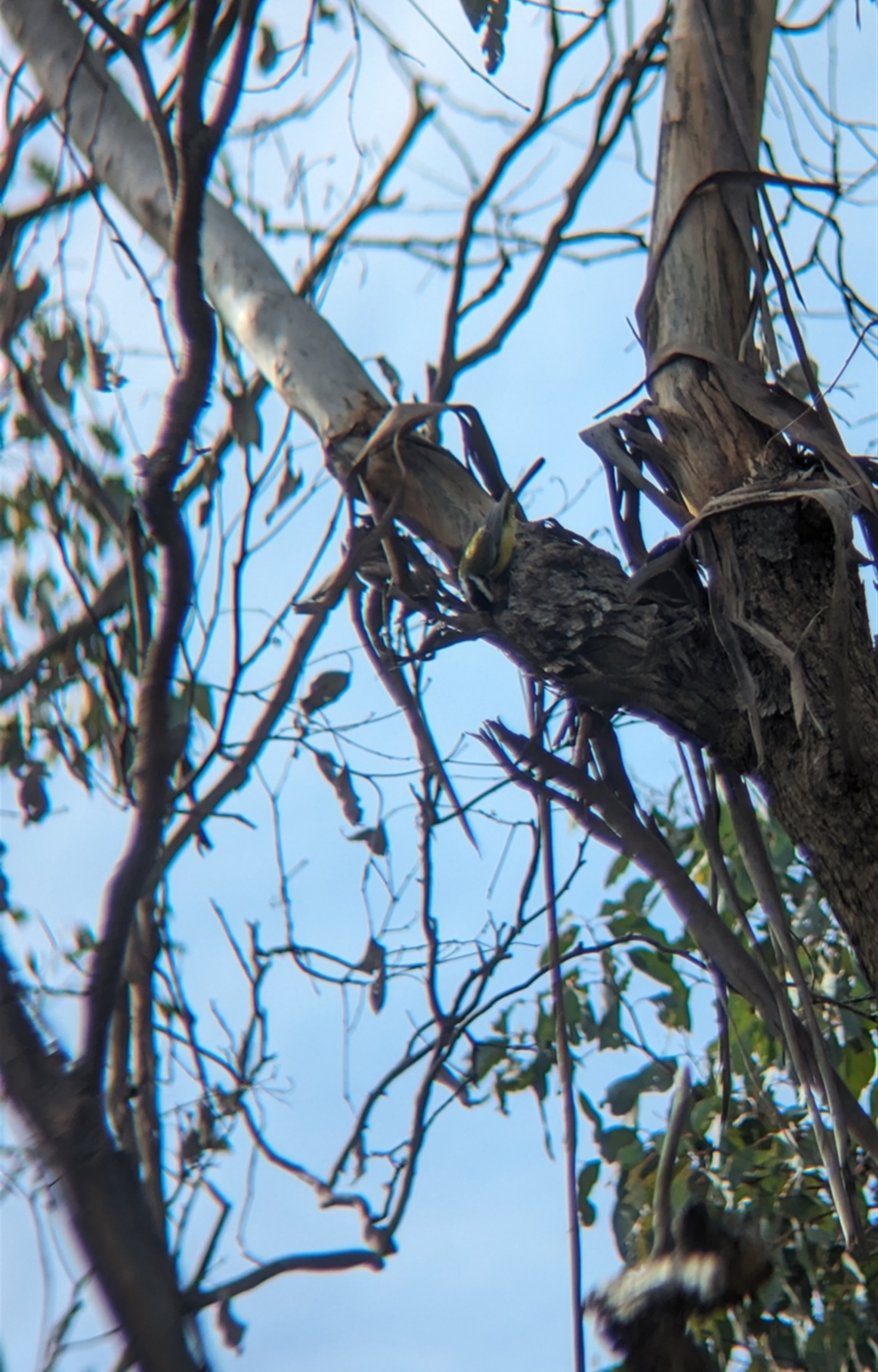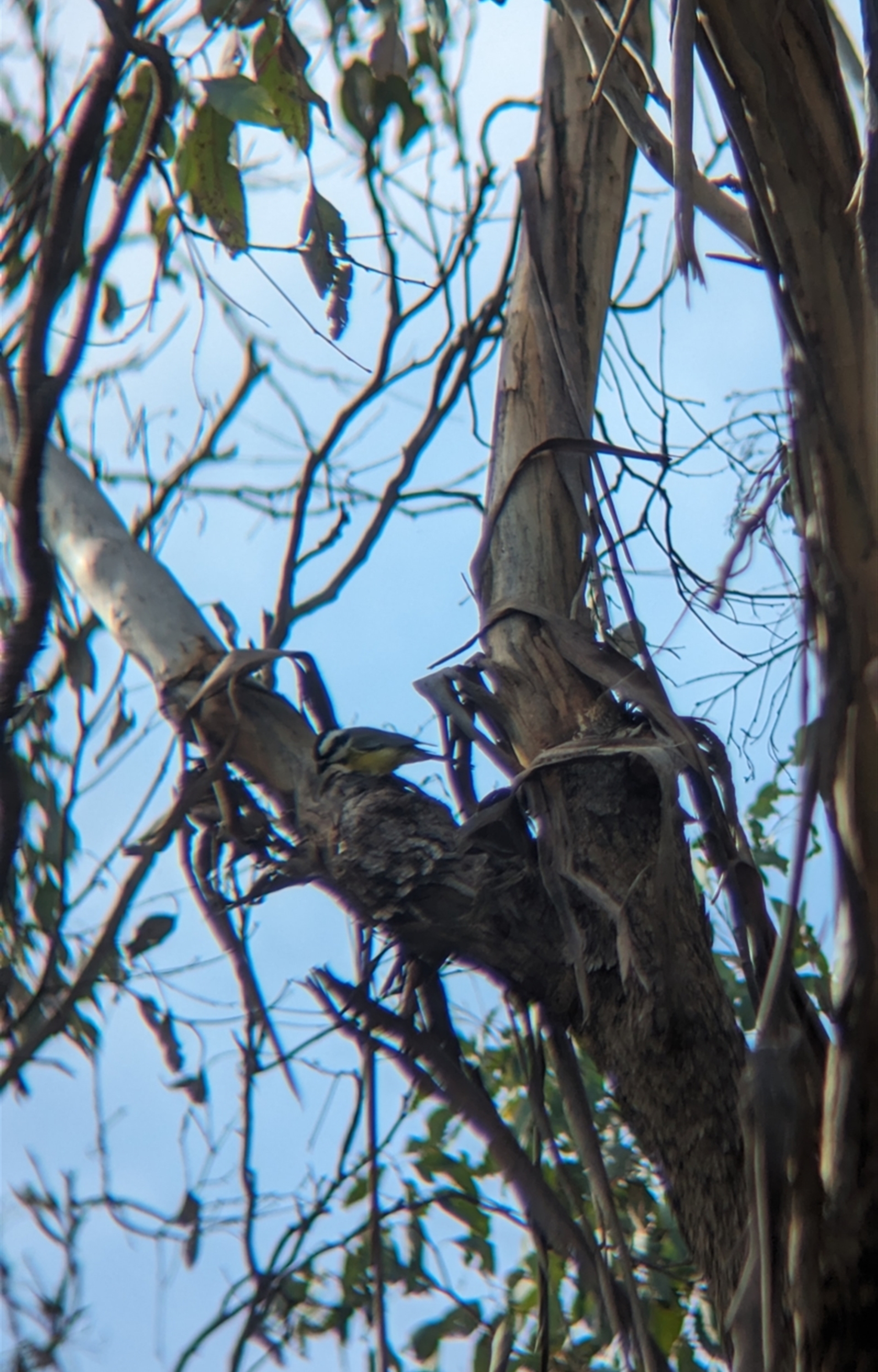 Pair of Crested Shrike-tits foraging in the midstorey, noisily stripping bark to find insects.