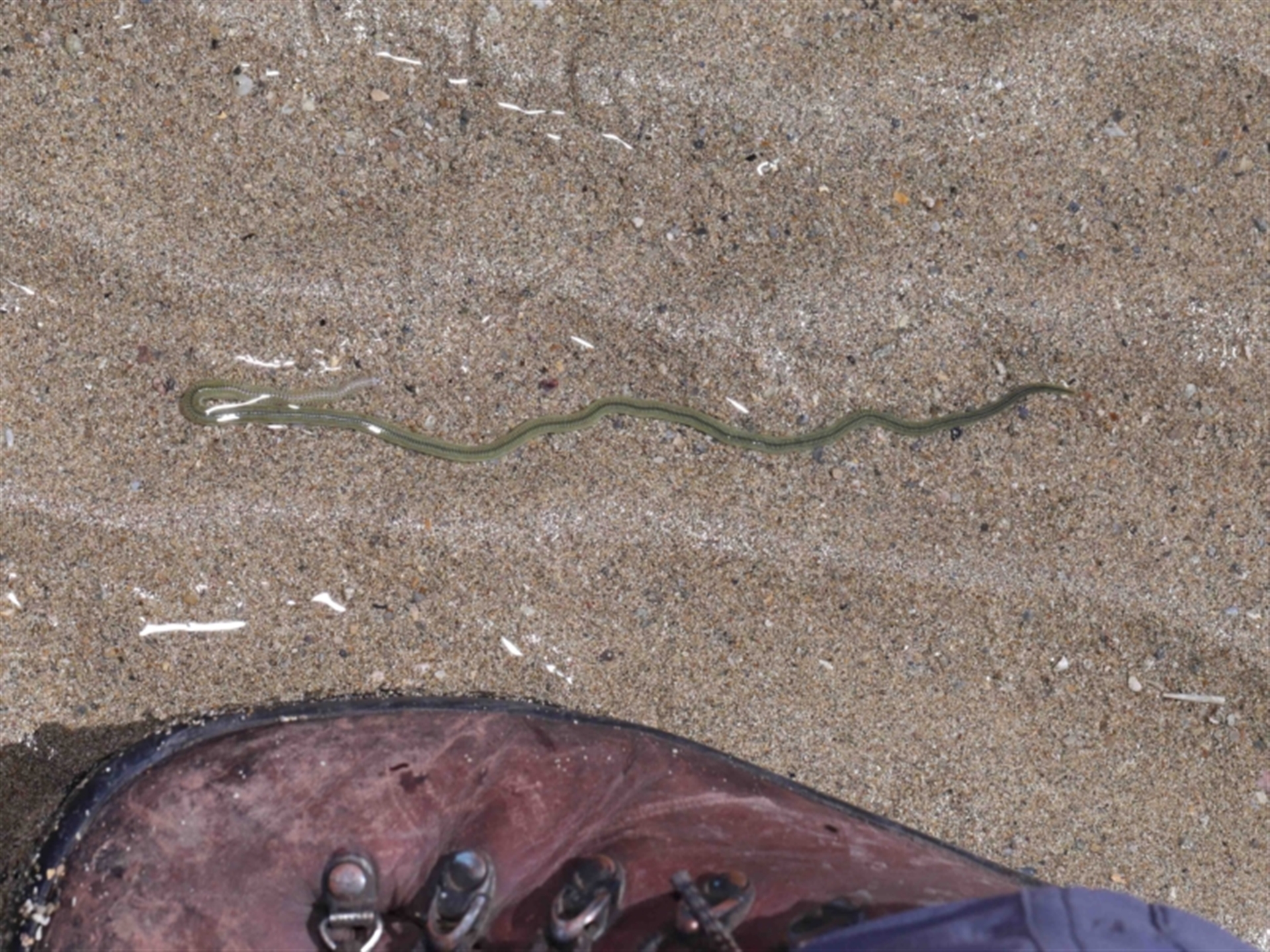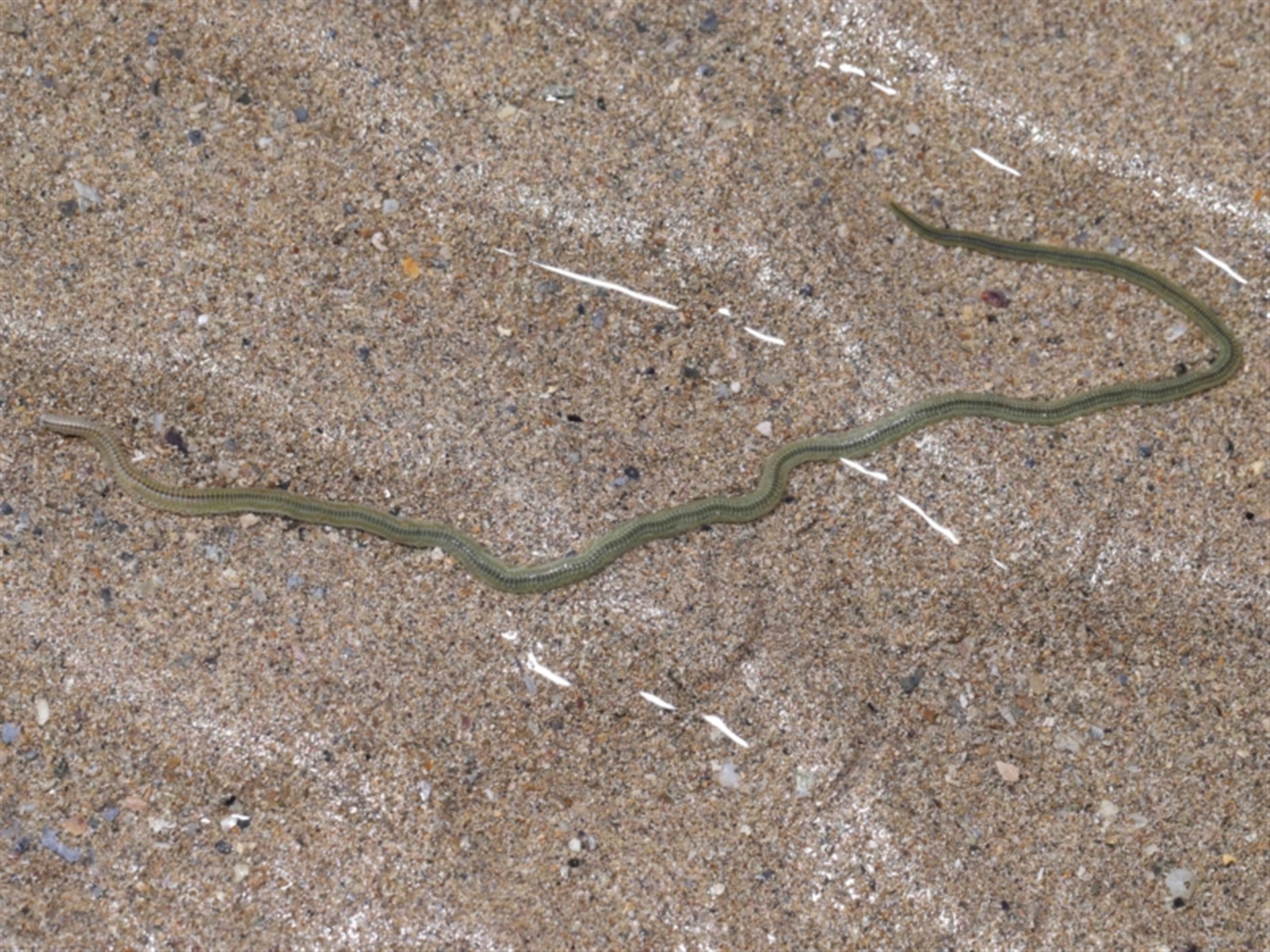 Three widely separated groupings of these creatures were seen across the flats during low tide. They had the appearance of centipedes, presumably some aquatic form. They were all in very shallow pools of water and typically within close proximity to each other but with no interaction. The largest group had 6 individuals, none of which took any notice of us being close by. The head end is seen in the final two images and the approximate size can be gauged from the third image. Thanks to Barbara for the initial sighting.