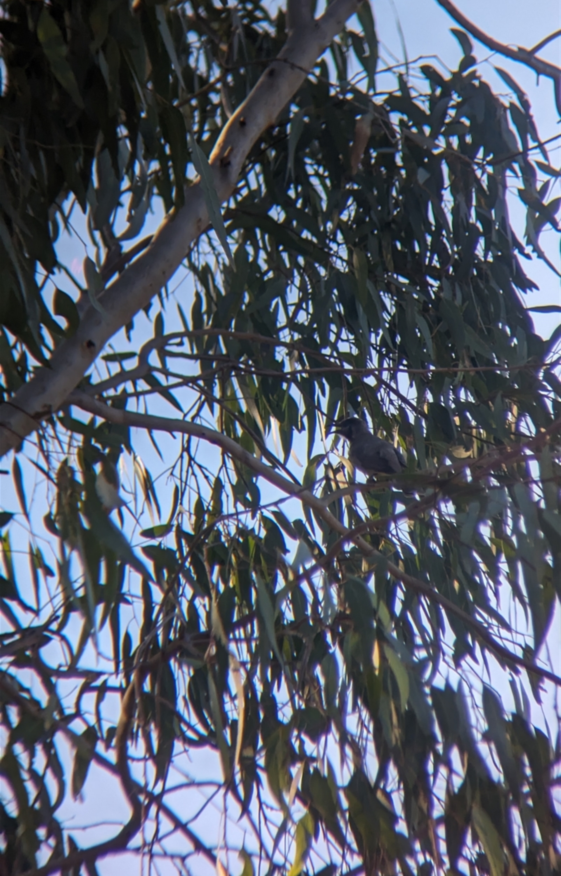 Pair of Little Friarbirds gleaning in the canopy of some red gums.