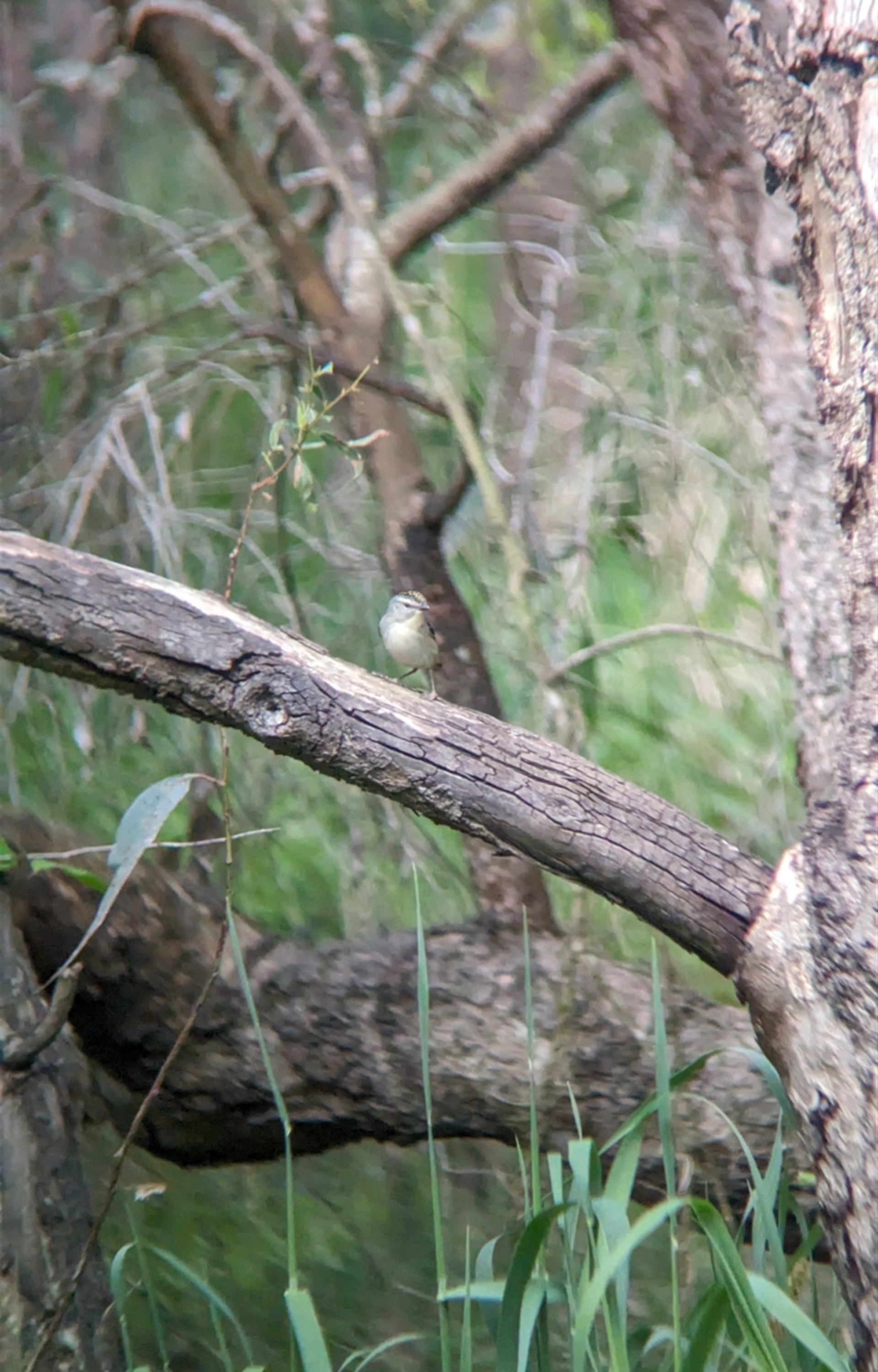 Spotted pardalote foraging around a log