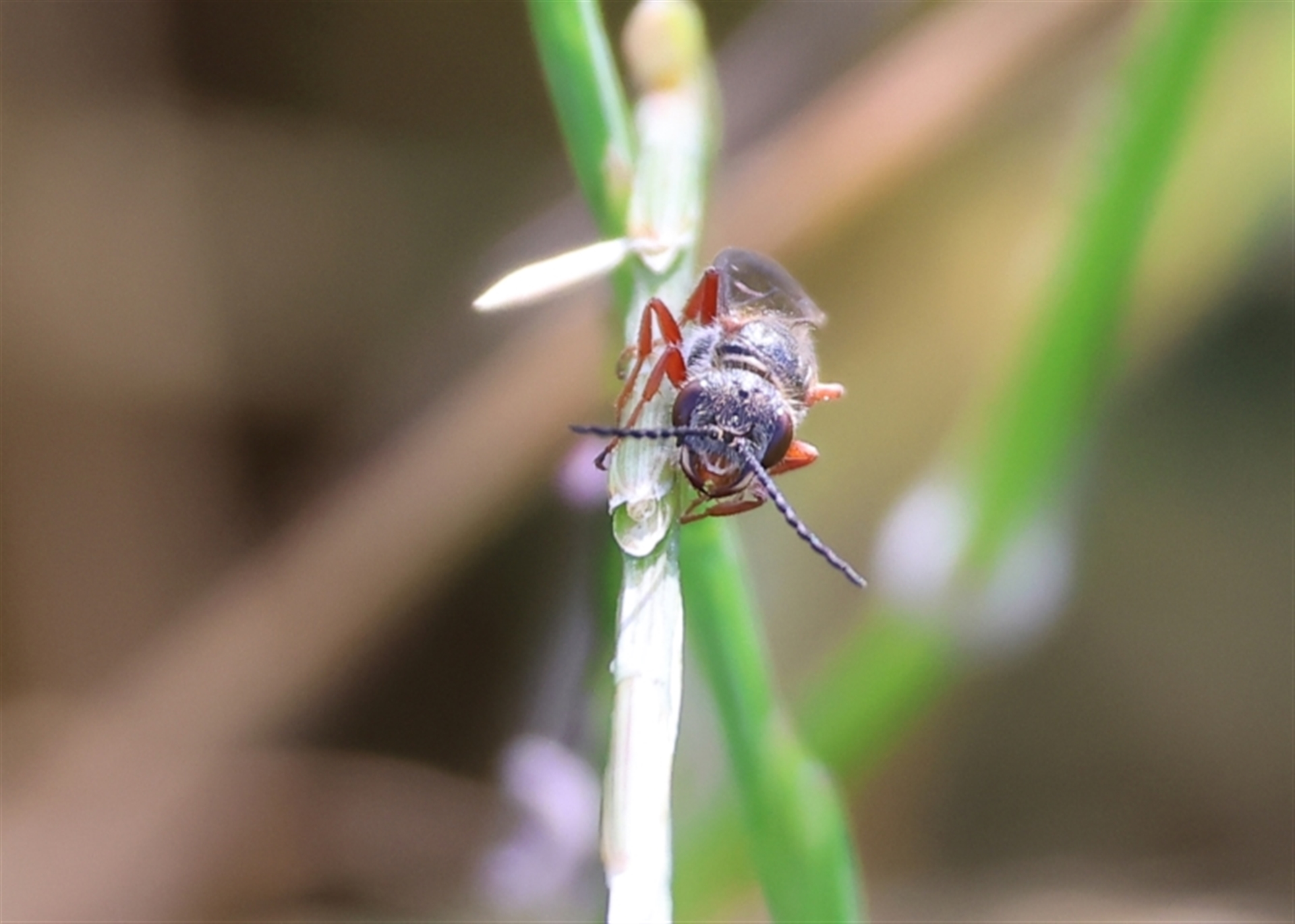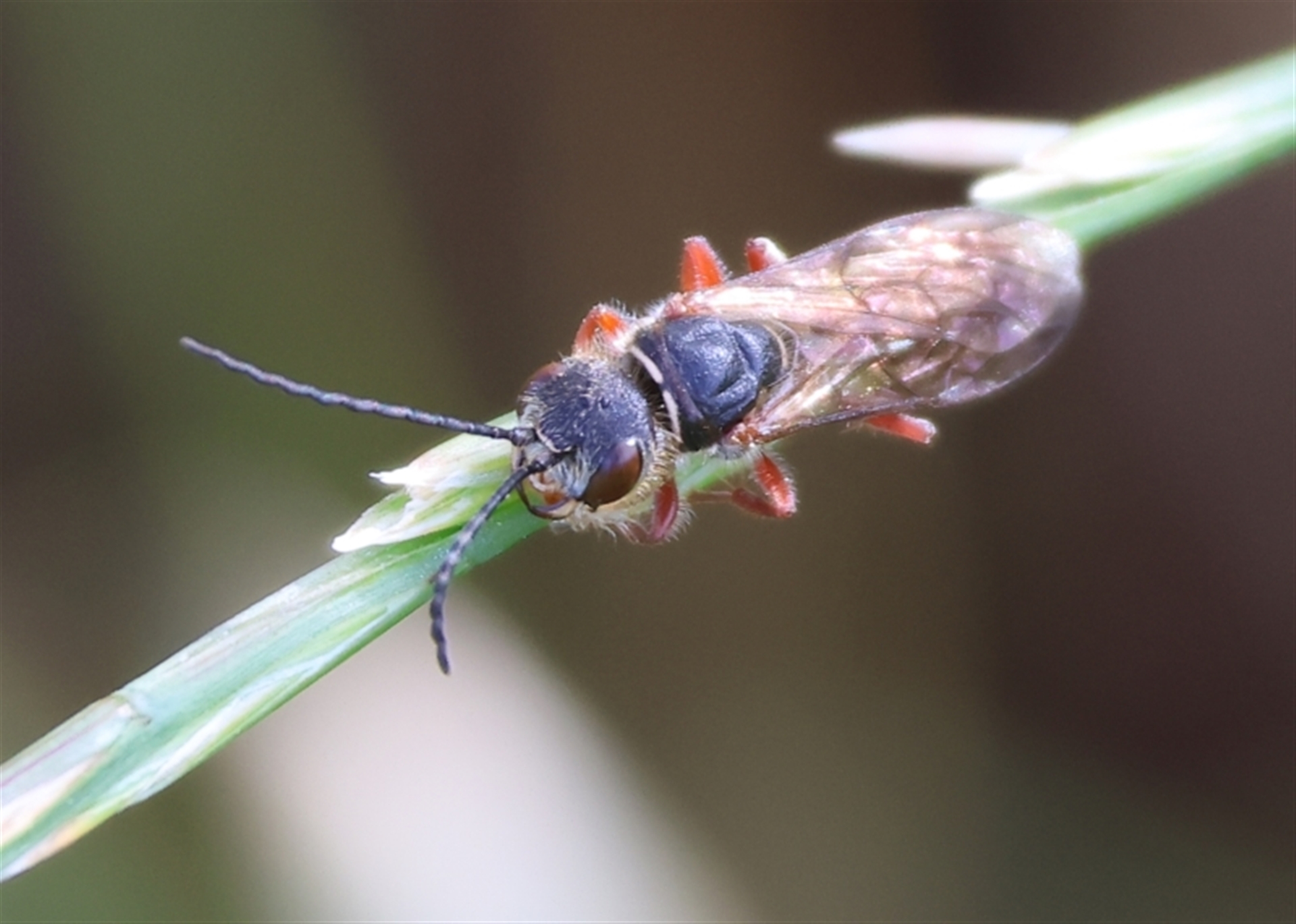 This wasp flew up out of the path grass and up onto longer grass. There were clover and dandelion flowers. Not sure if this is a flower wasp or not.