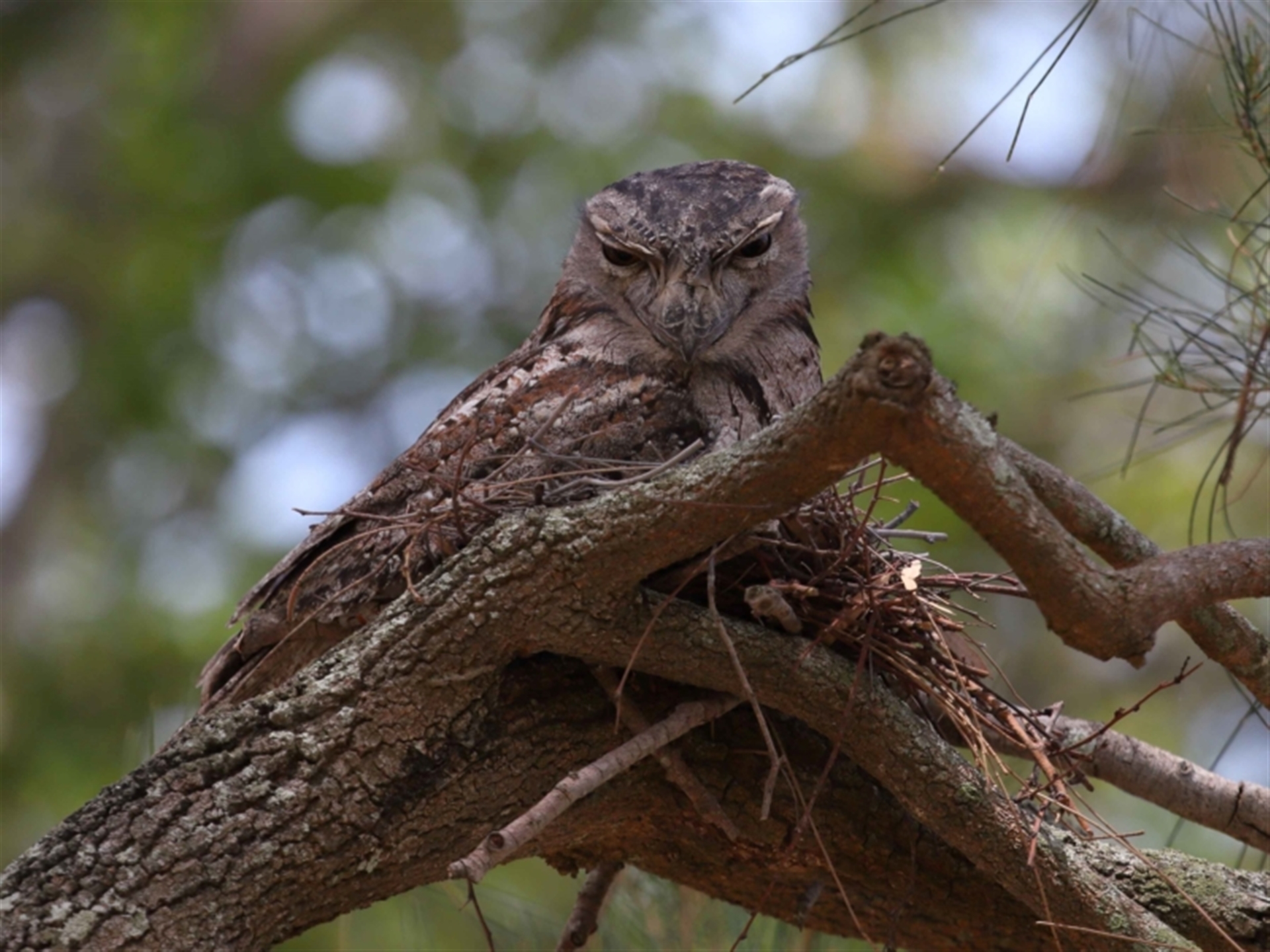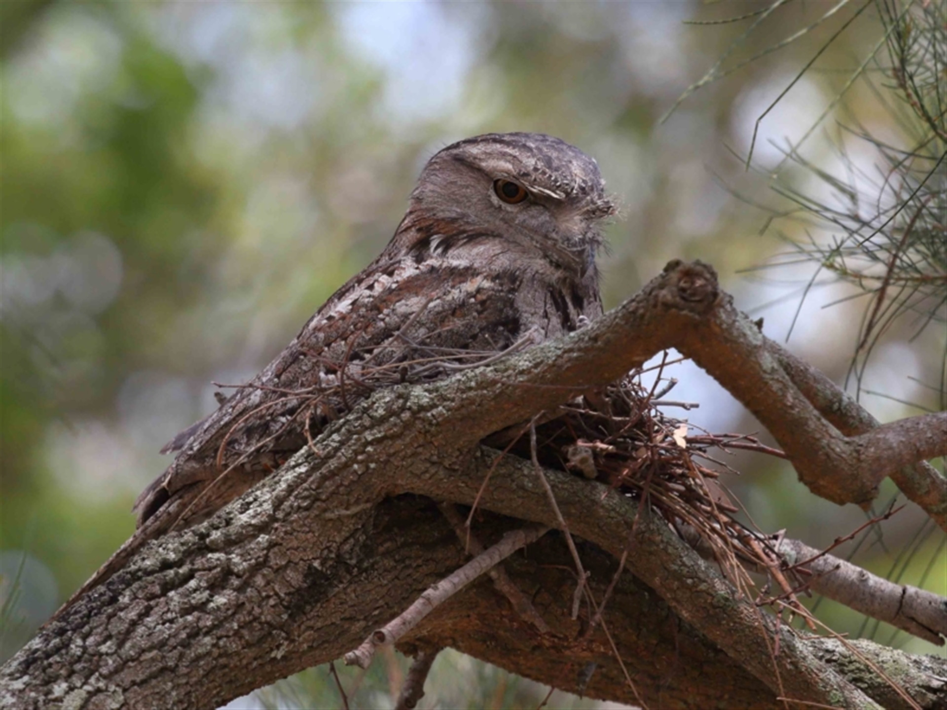 Possibly the male of a nesting pair of Tawny Frogmouths. The smaller bird of the pair was in a tree a few metres away as recorded in following sighting 4536160.