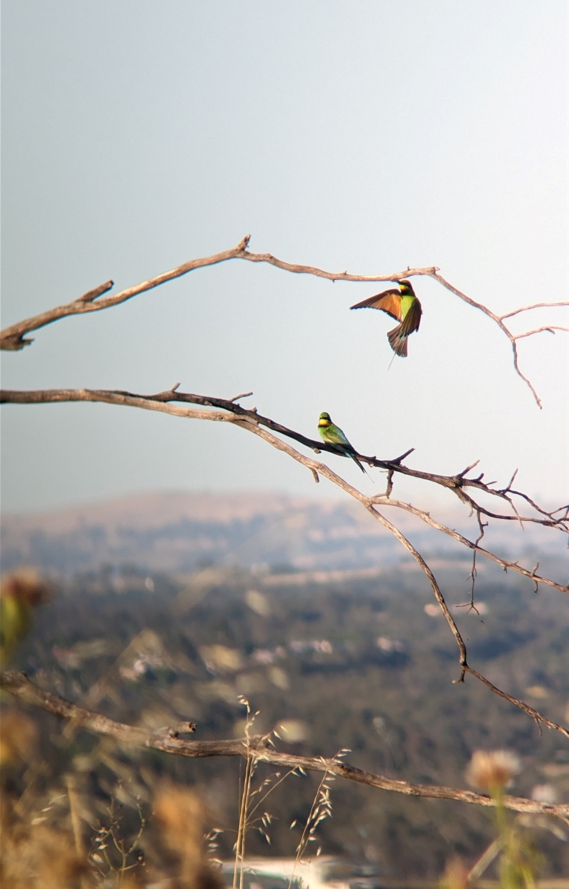 Small flock of bee-eaters flitting out from some fallen sticks to catch insects then returning to their perch to eat