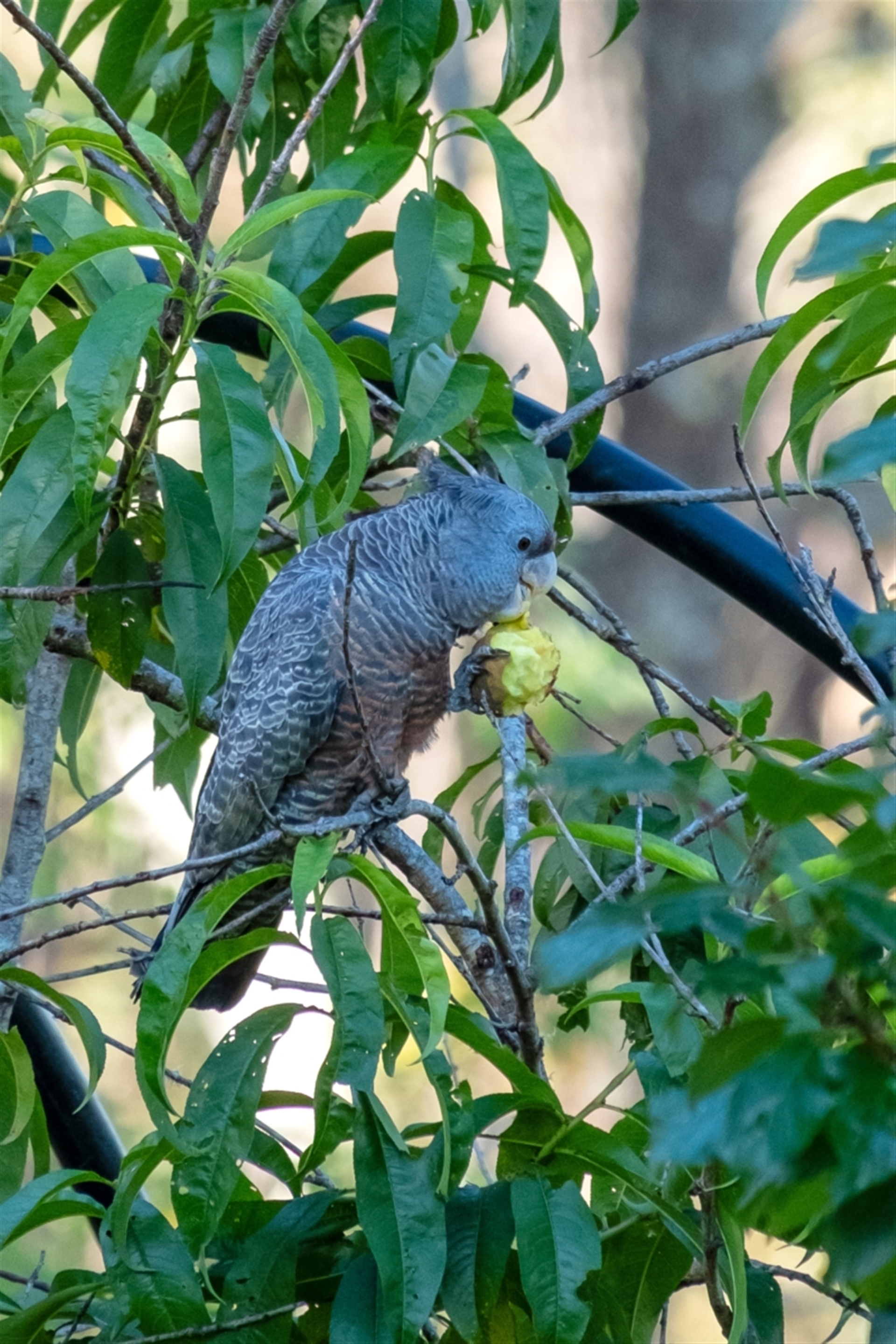 4 Gang Gangs sitting in a tree in the backyard. 2 adults and a male and female fledgling. I watched the adult female eat 2 peaches off our tree. This is the first time I have seen them eating peaches. She then fed the female and then the adults flew off and left the fledglings by themself. I heard them return and feed the fledglings again later on.