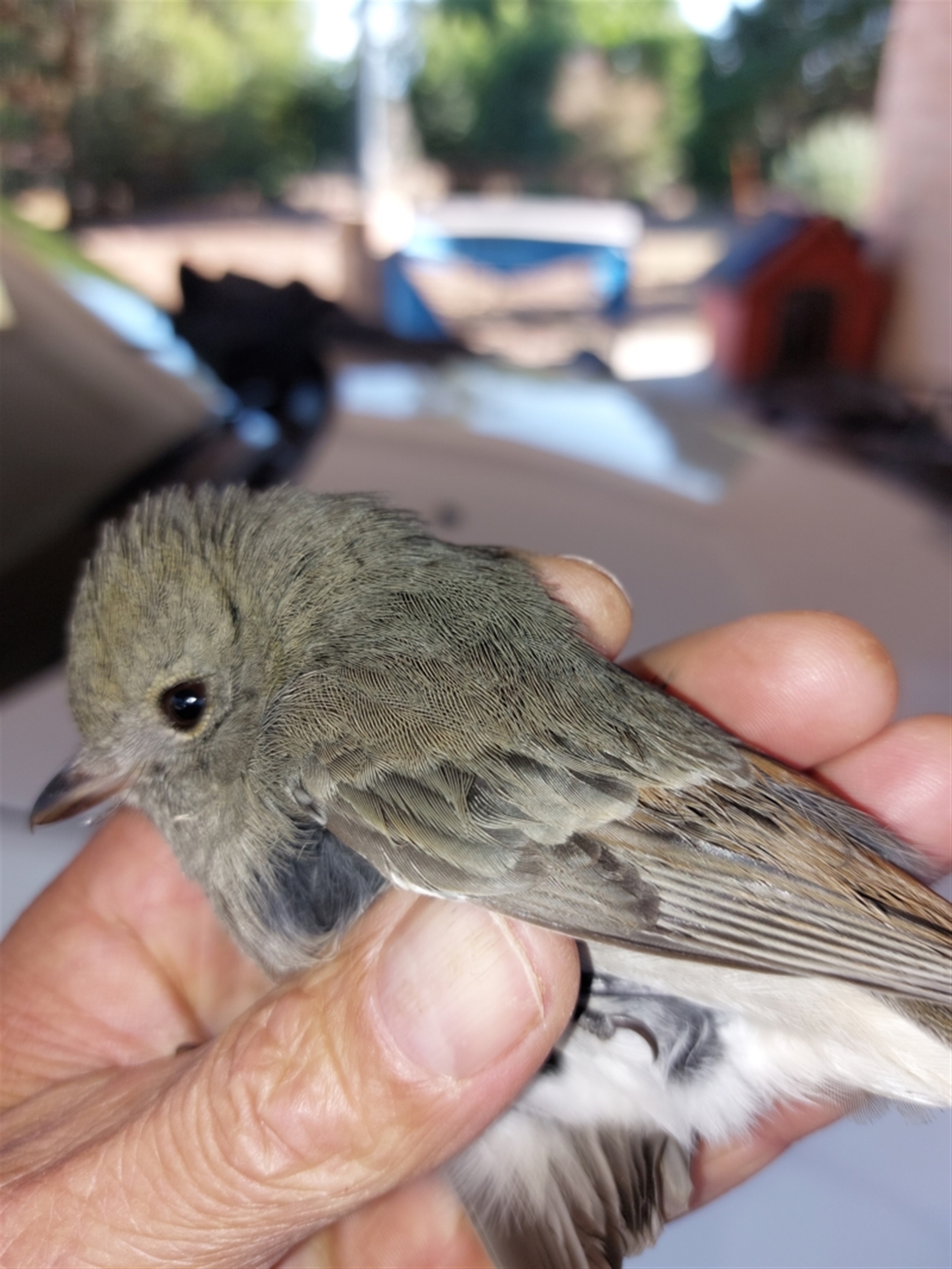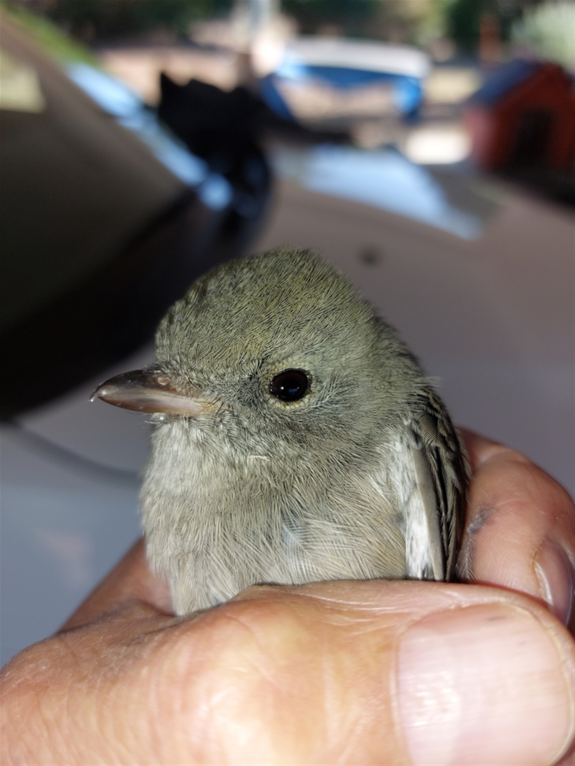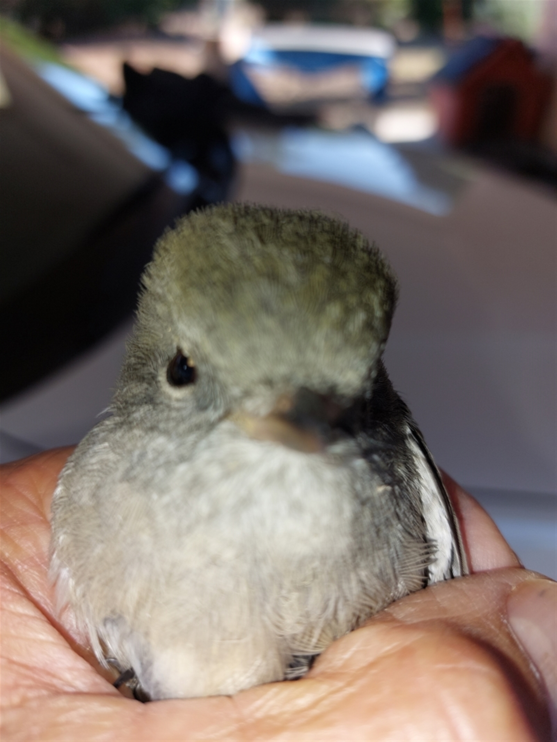Was on the ground, suspect it flew into a window. It was able to fly off