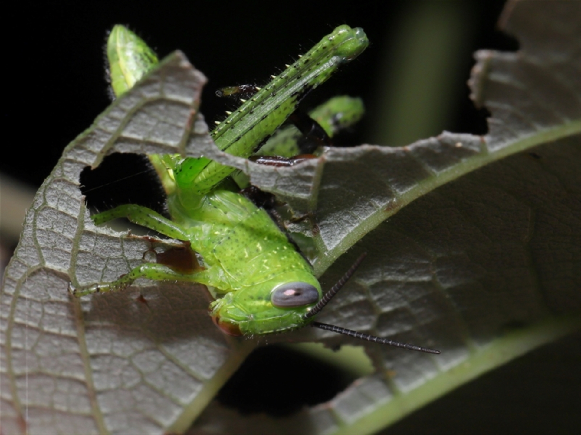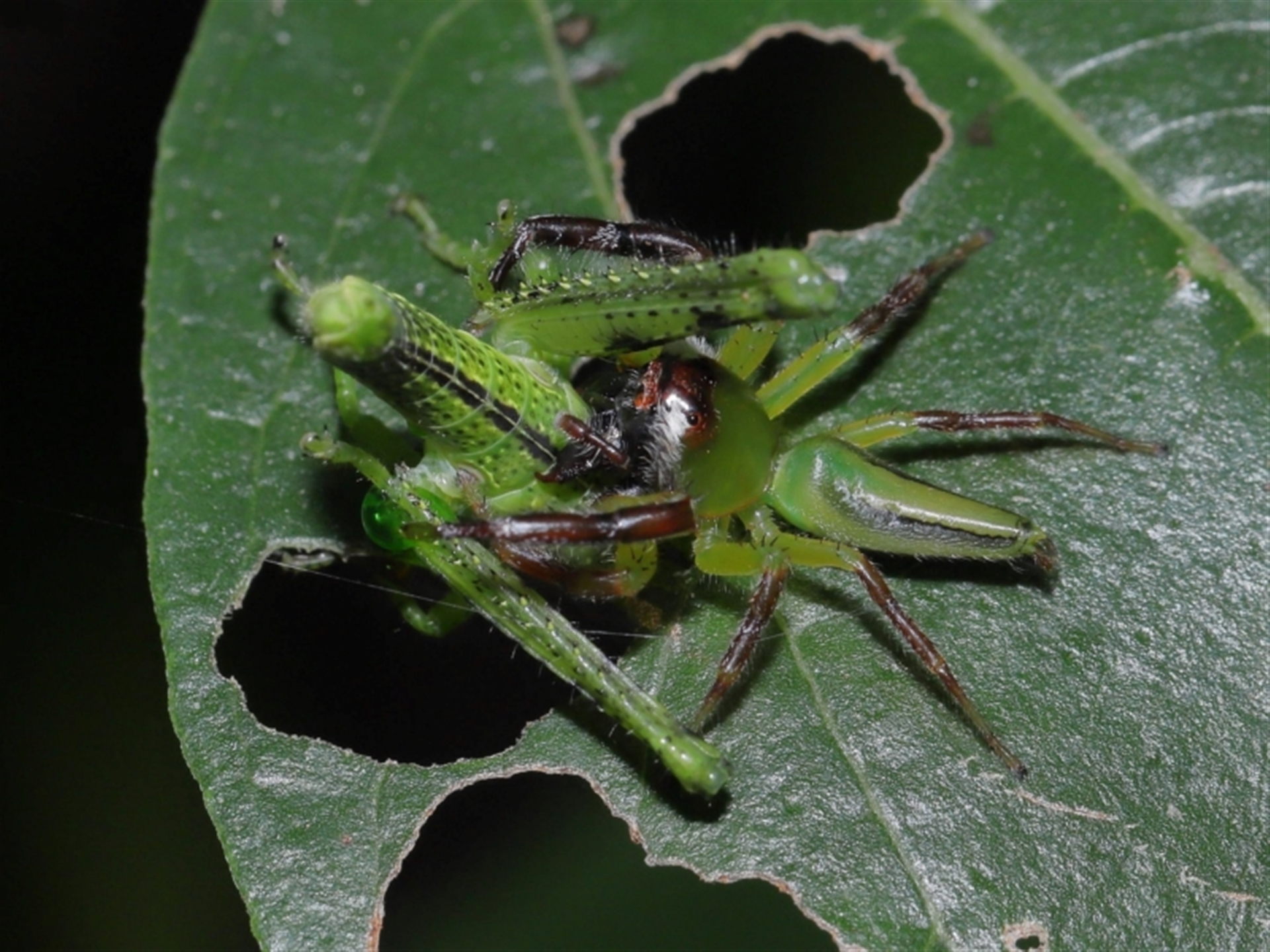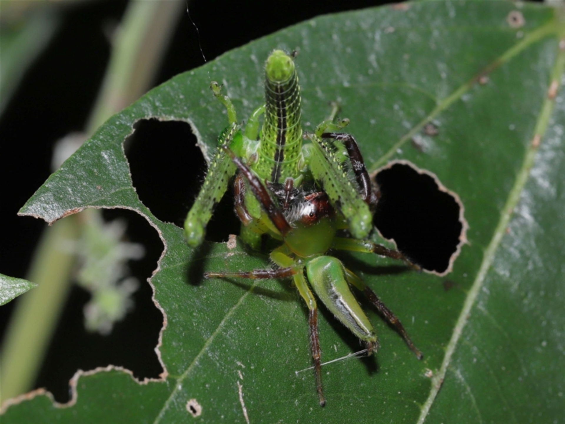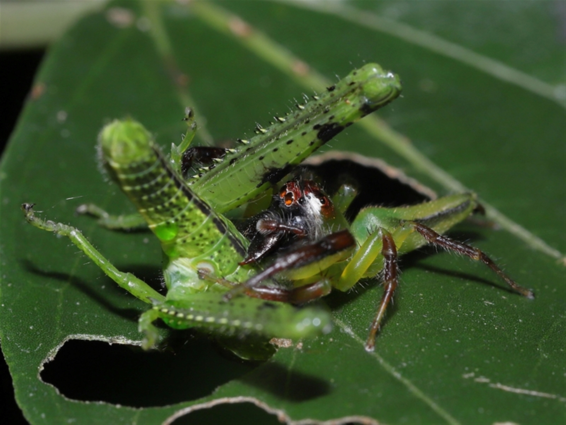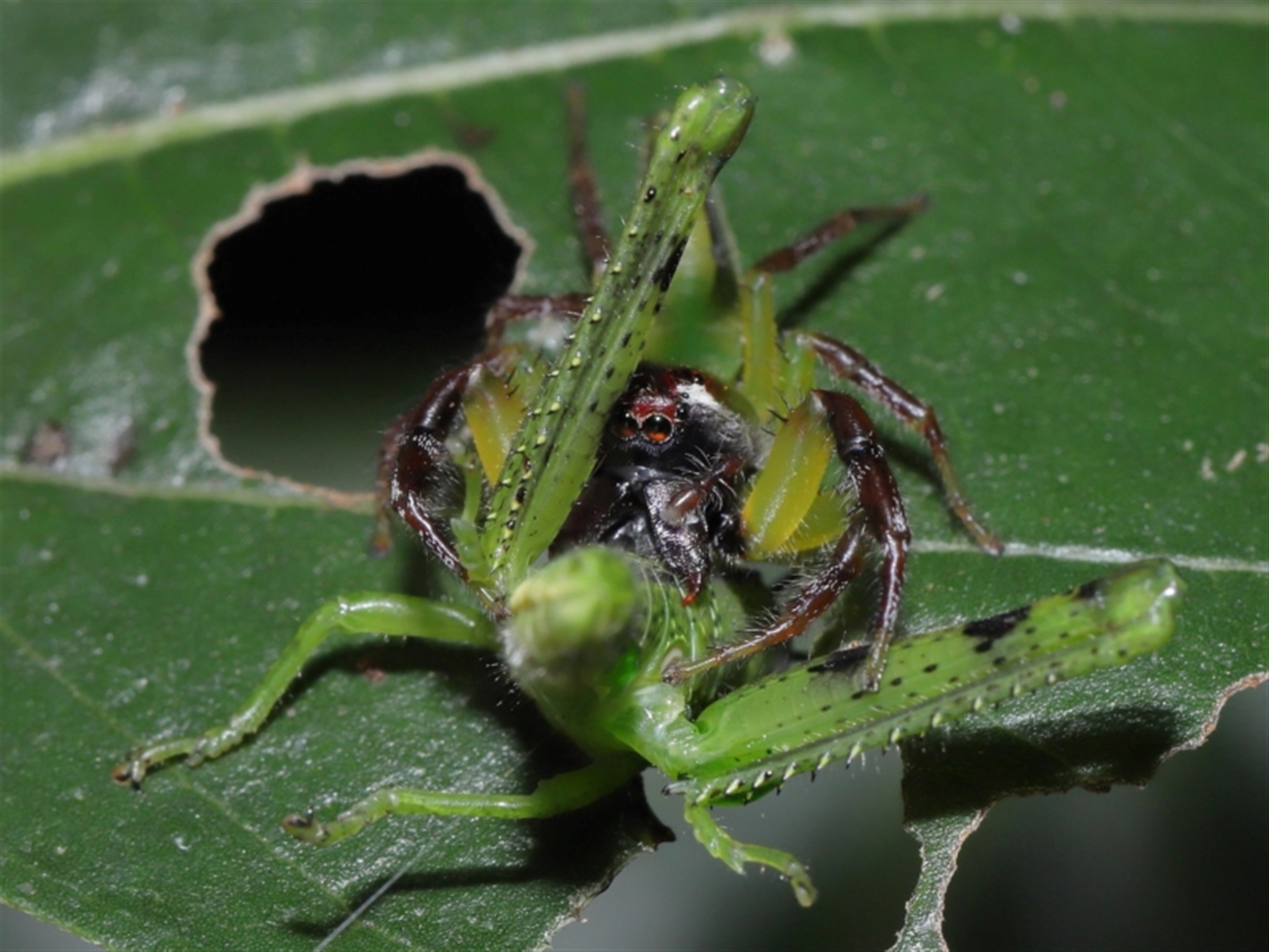 A male Mopsus mormon jumping spider having just caught its prey, a Valanga irregularis grasshopper.