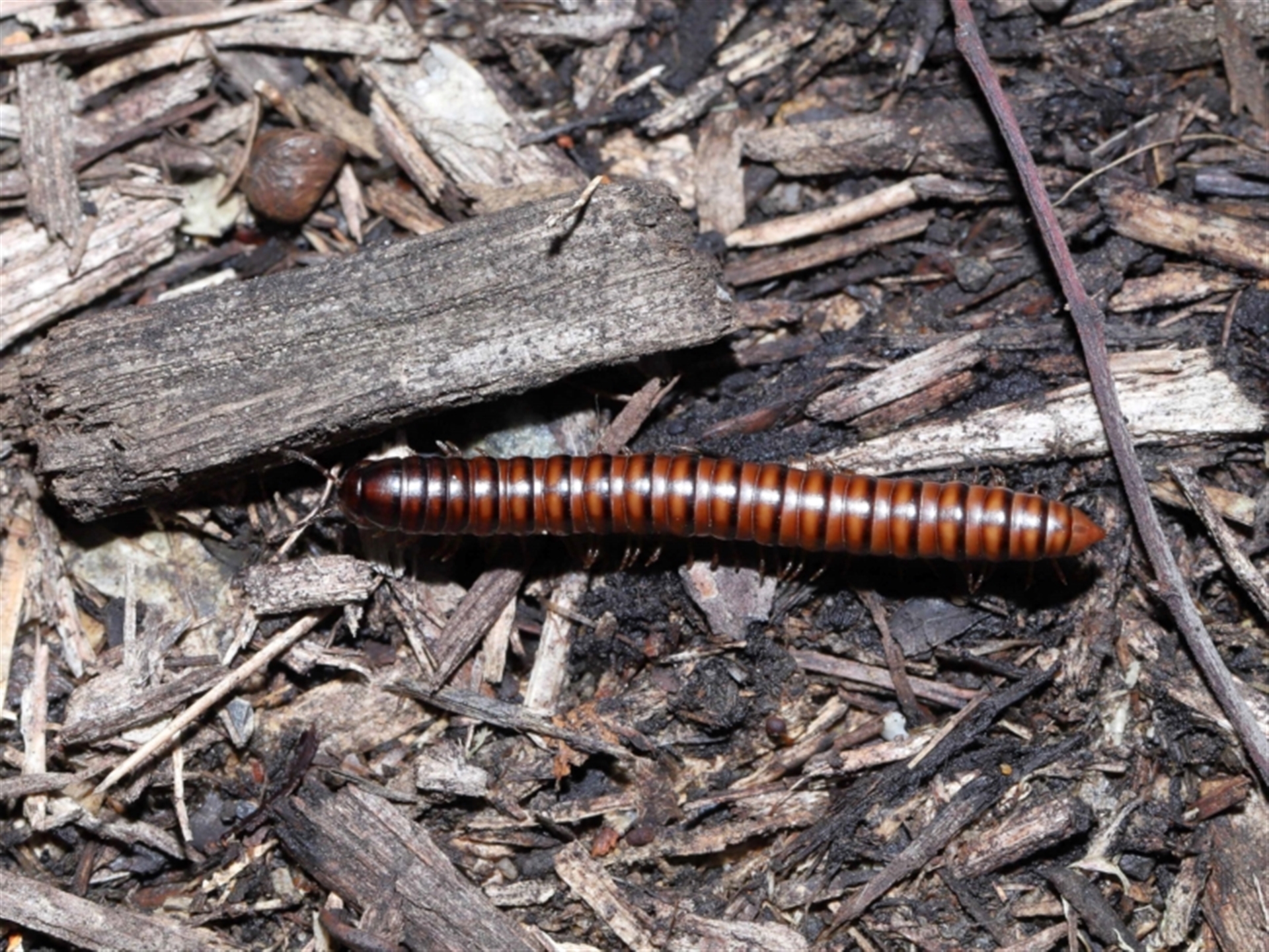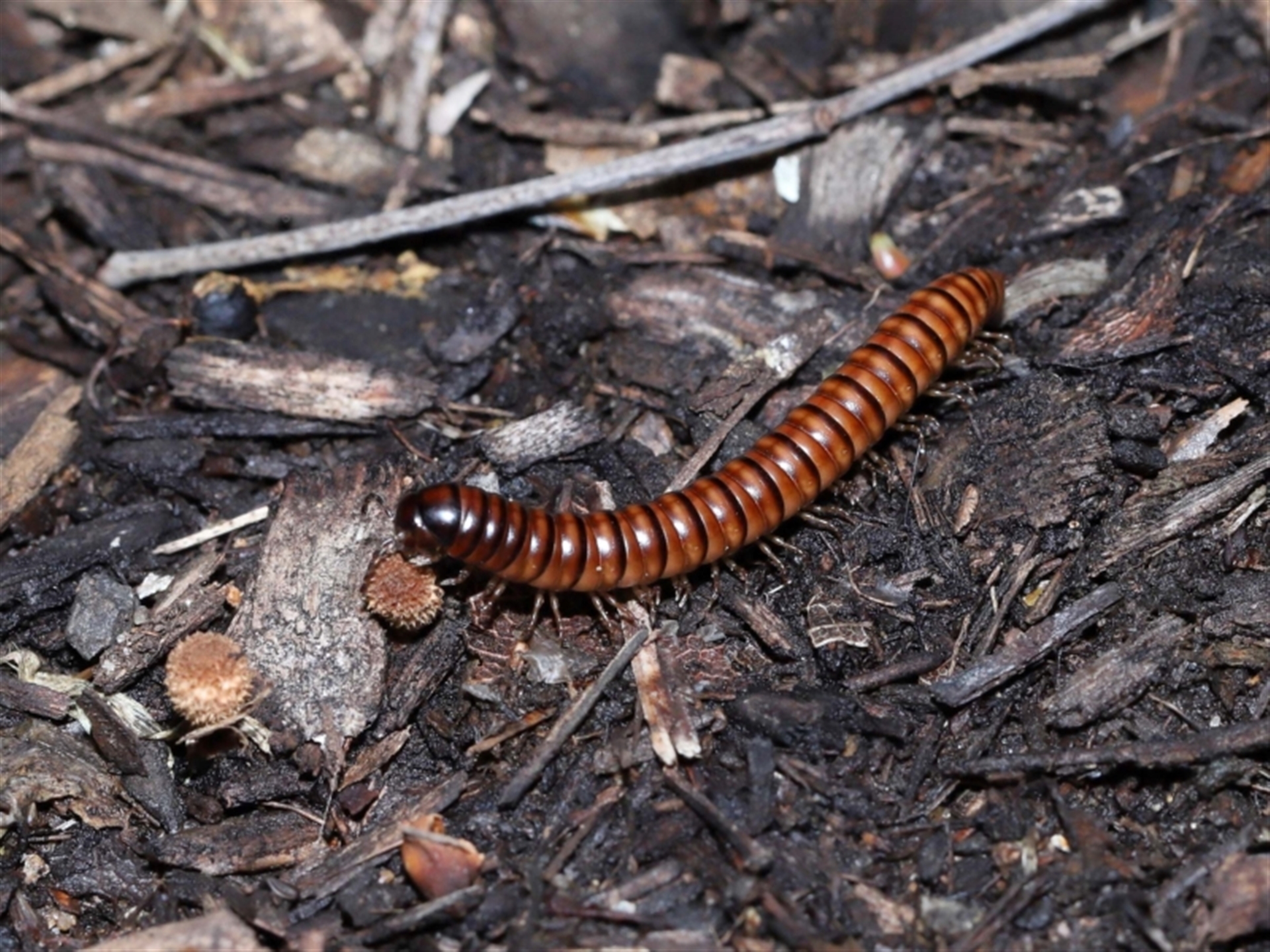 Thanks to Barbara for the initial sighting of the Millipede. It was working its way across wood chip mulch that was covered with Birds Nest fungi. The Millipede appears to be a female based on the leg configuration.