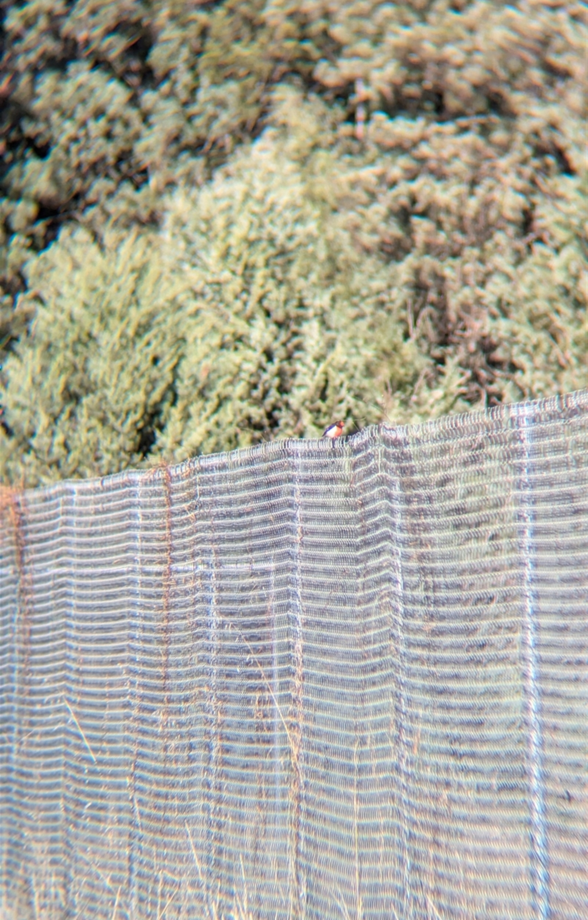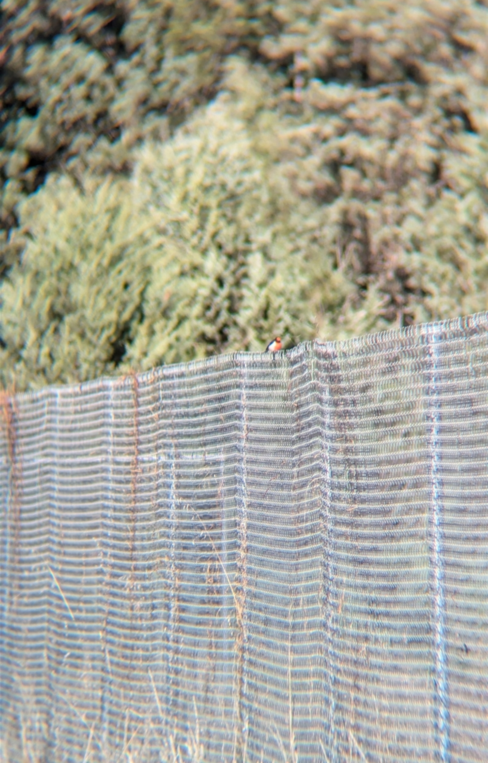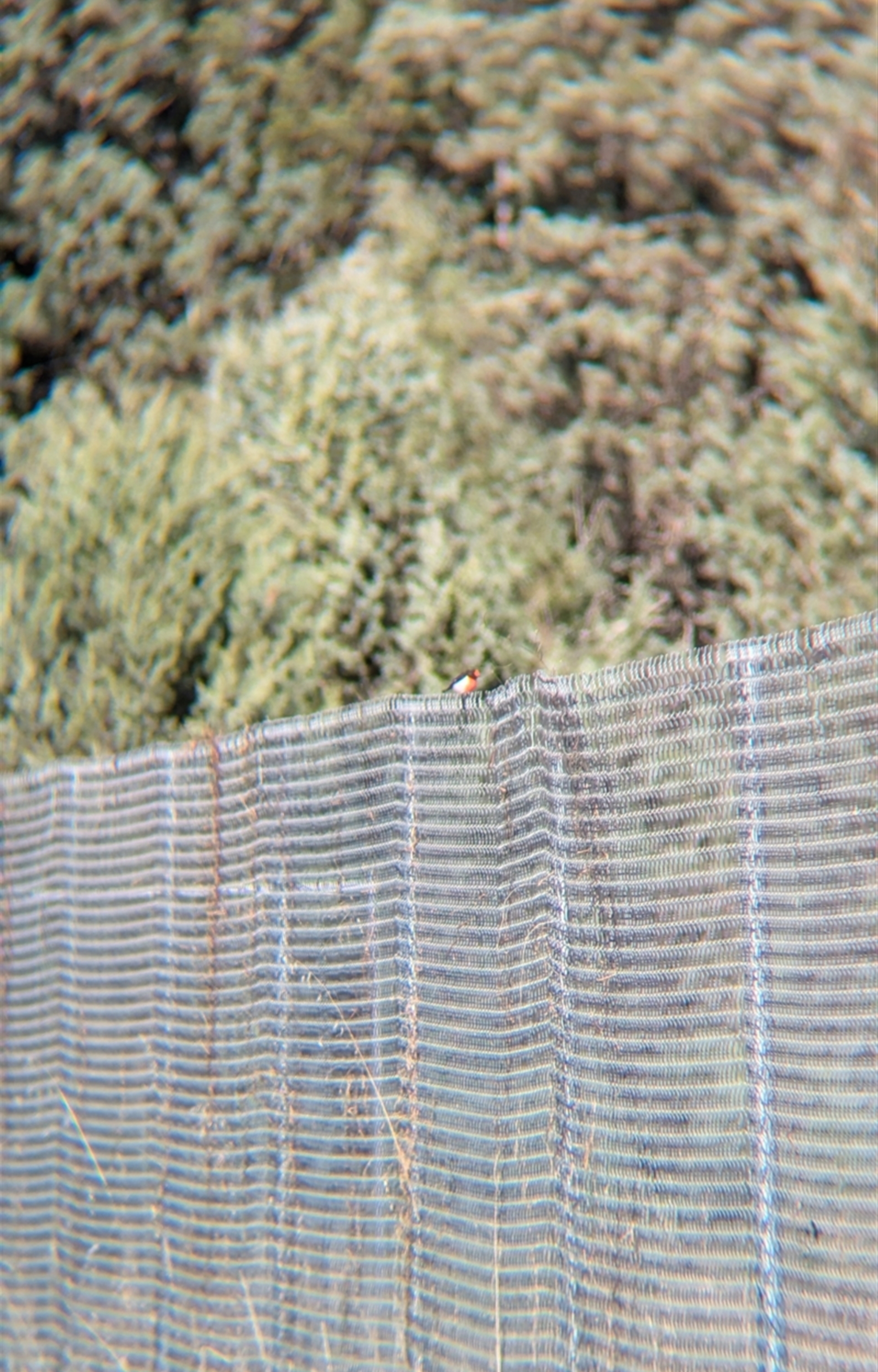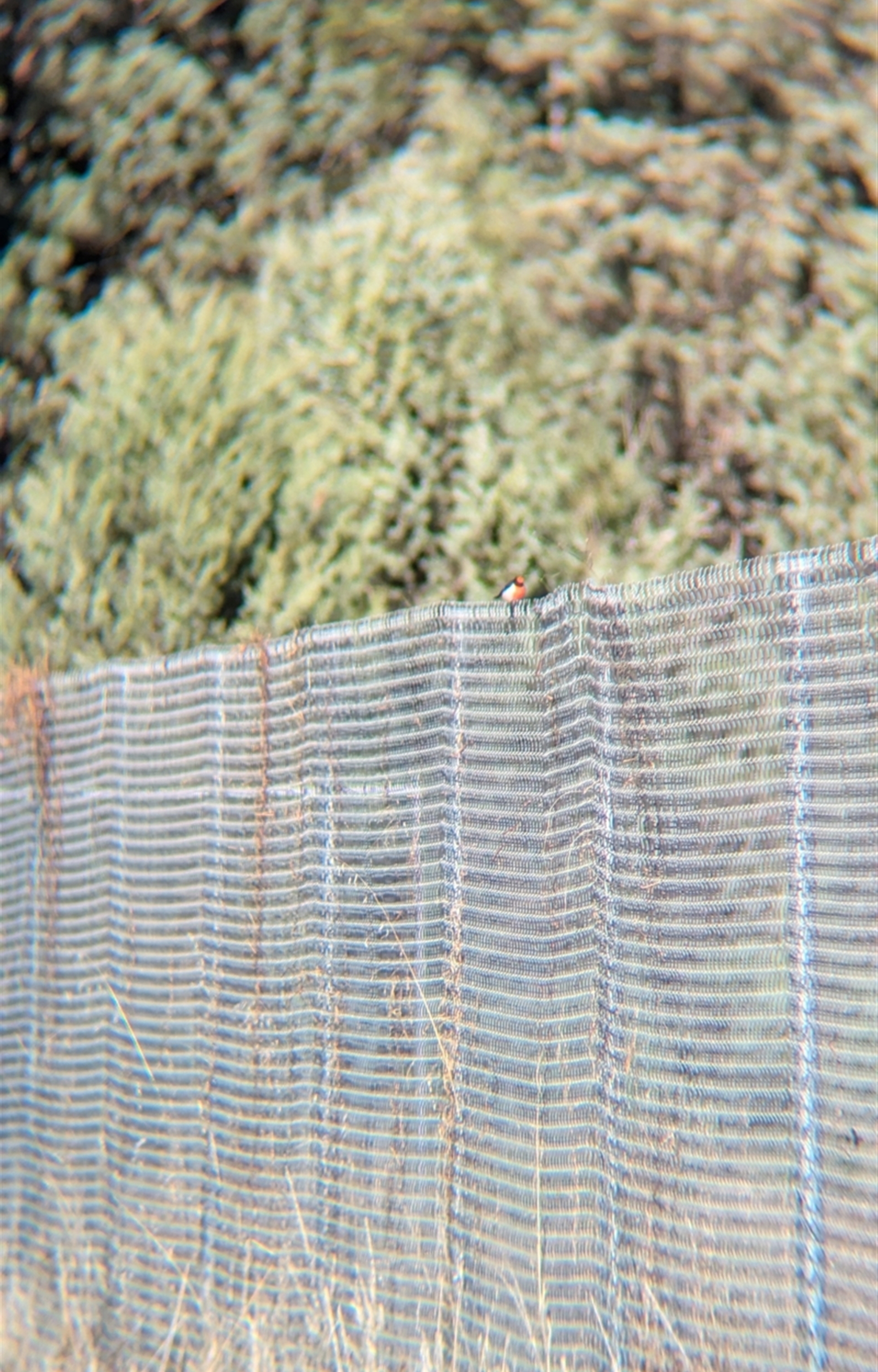 Single male red-capped robin foraging along the edge of the quarry fence