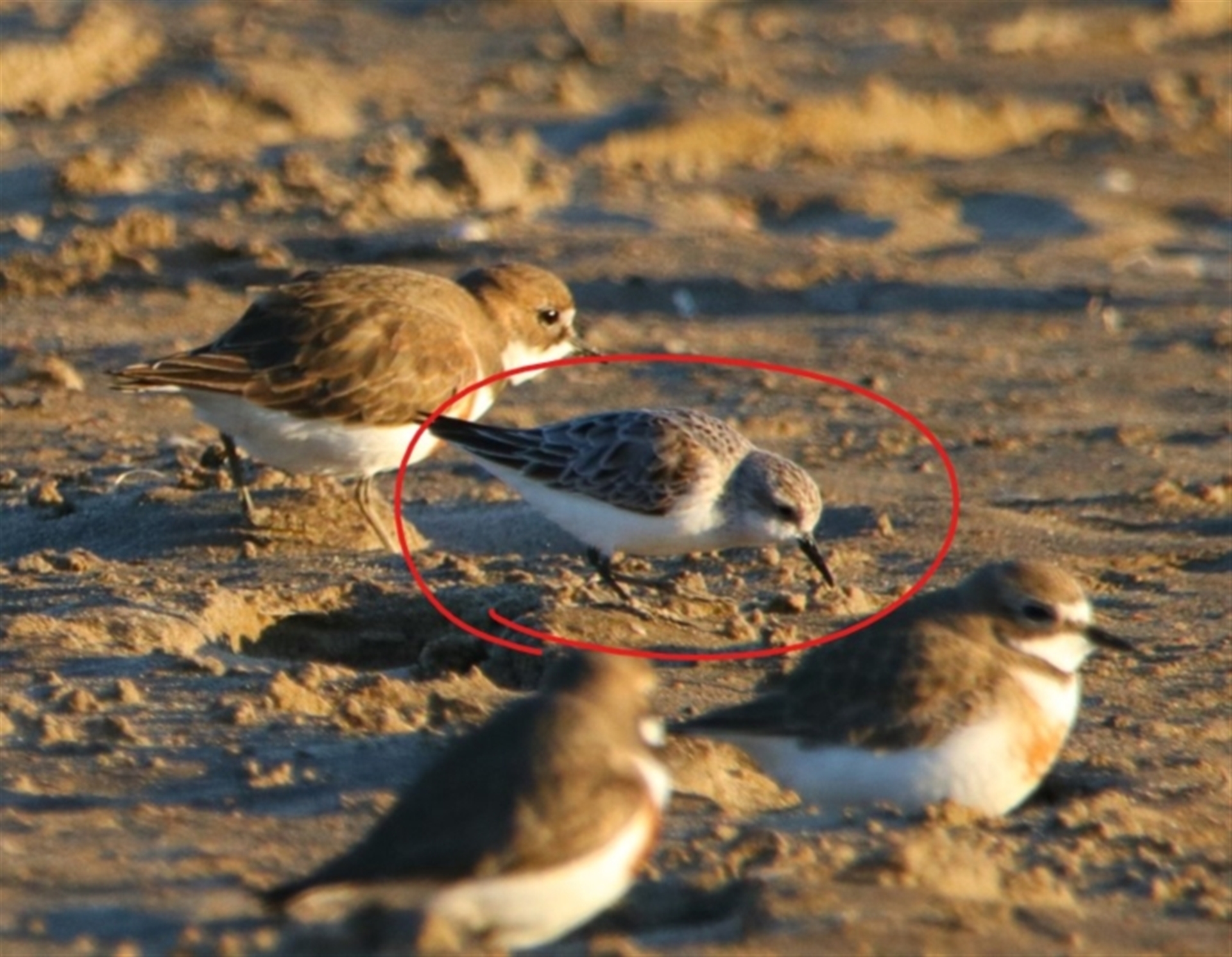 I don't know what the circled bird is. It was amongst red-capped plovers and double barred plovers. Is it an immature or a different species? Calidris ruficollis (Red-necked Stint)?
