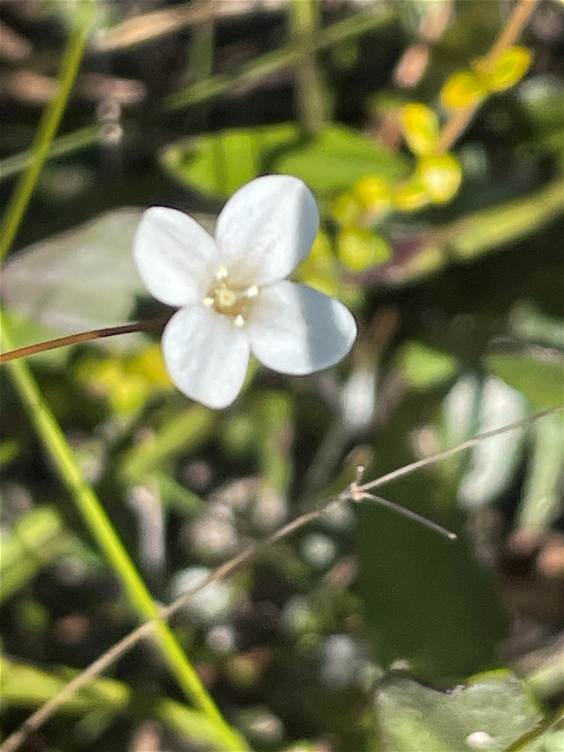 For example, let's all pay respect to this plant by noticing: • this flower has: sepals (calyx), four white petals, the four stamens situated exserted between, along the split between, each of these four petals; • this flower here's long pedicel joins the peduncle at a point with other branches' stubs indicating that this inflorescence has/had a total number of flowers over time of more or less three flowers; • the thick matted hairs on the stem between the small short leaves, etc. .