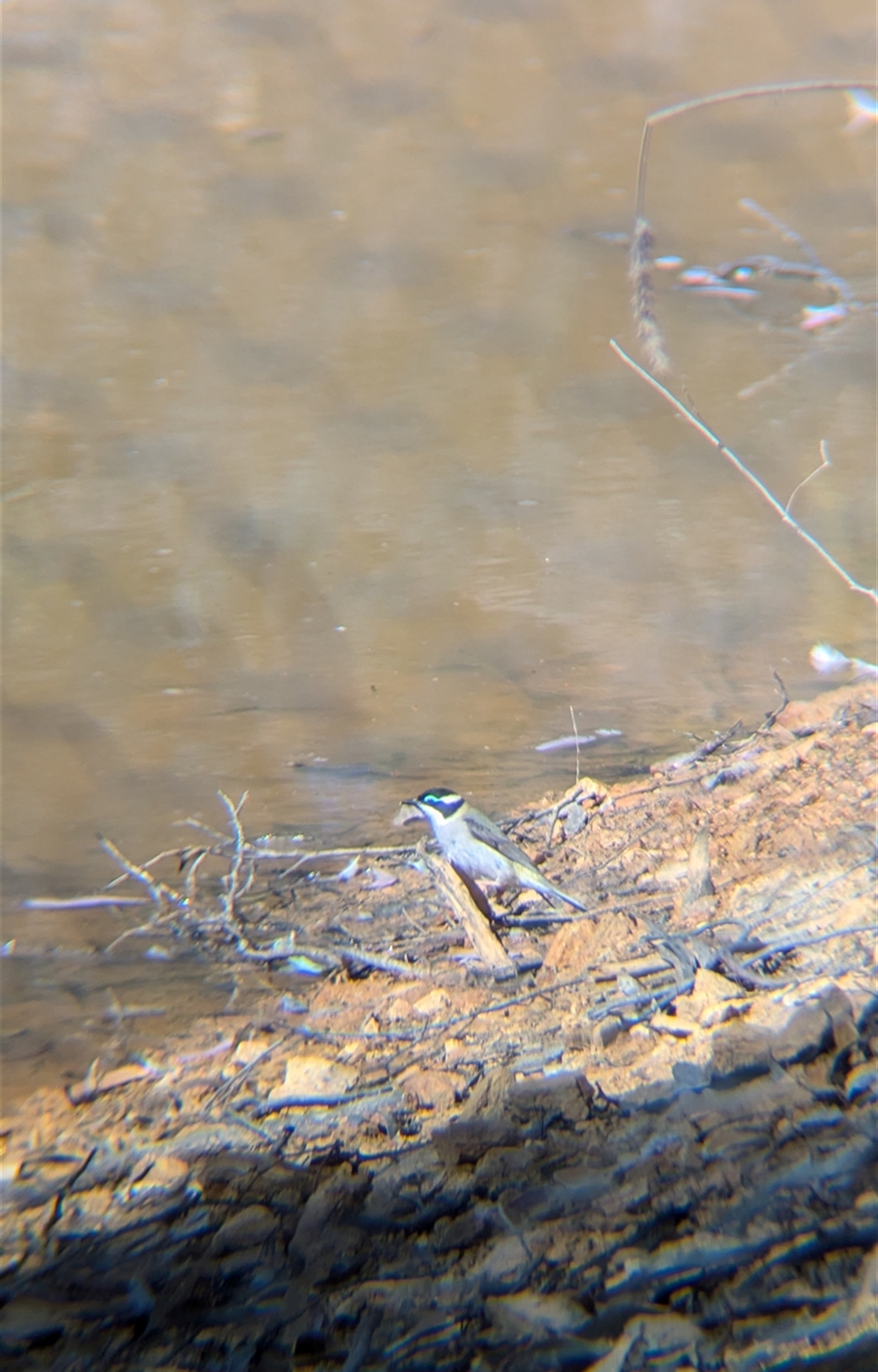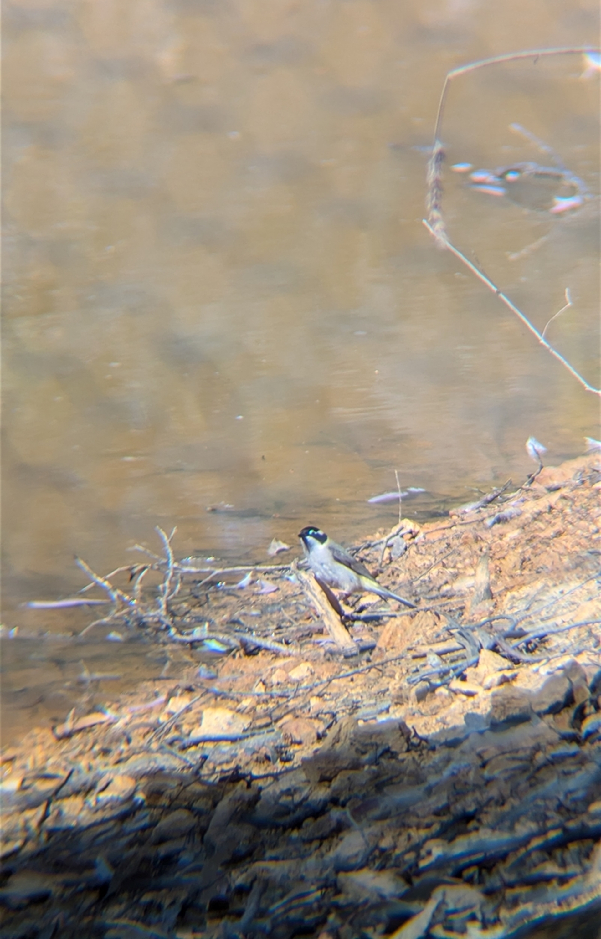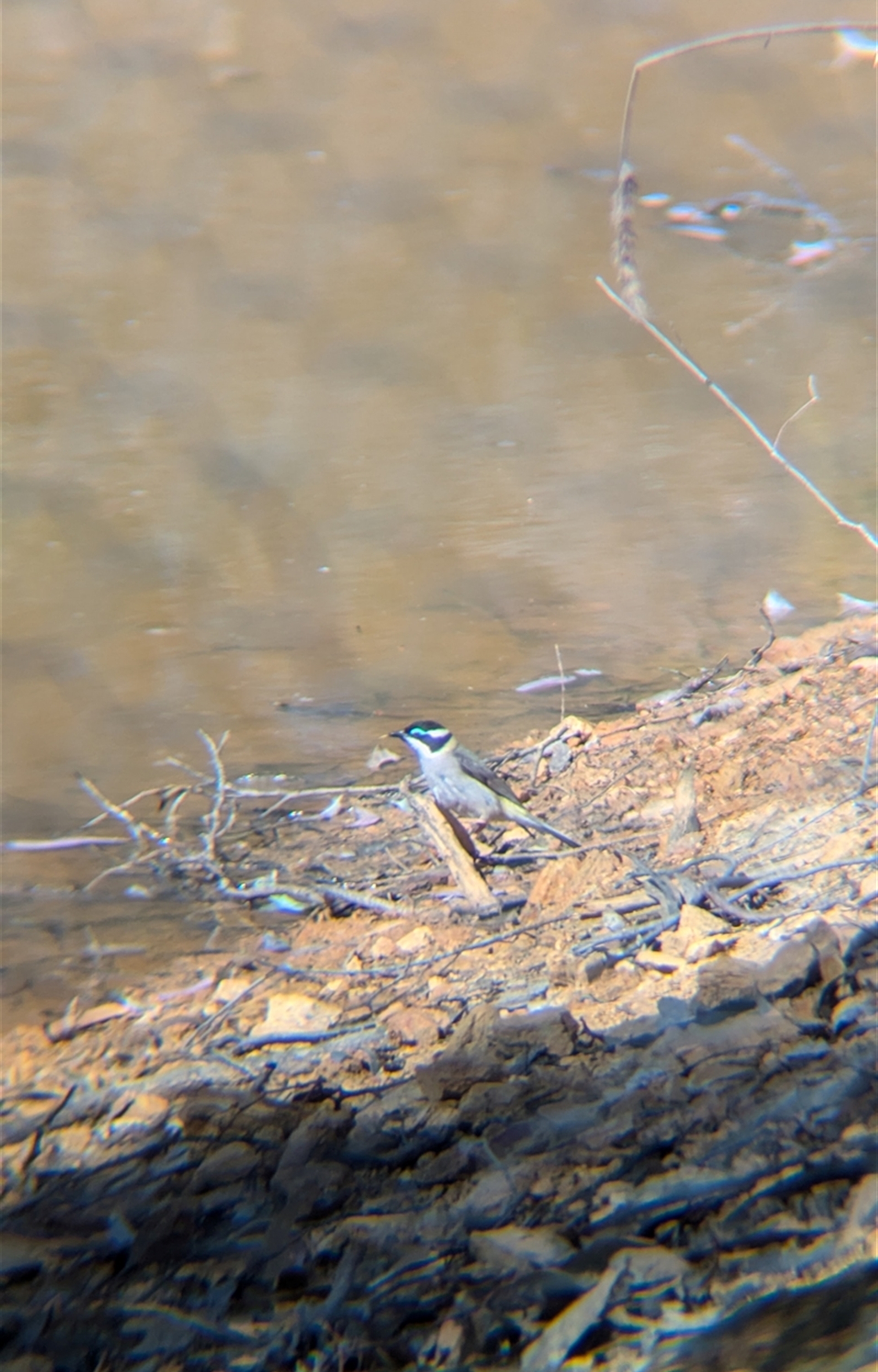 Single black-chinned honeyeater drinking from the dam