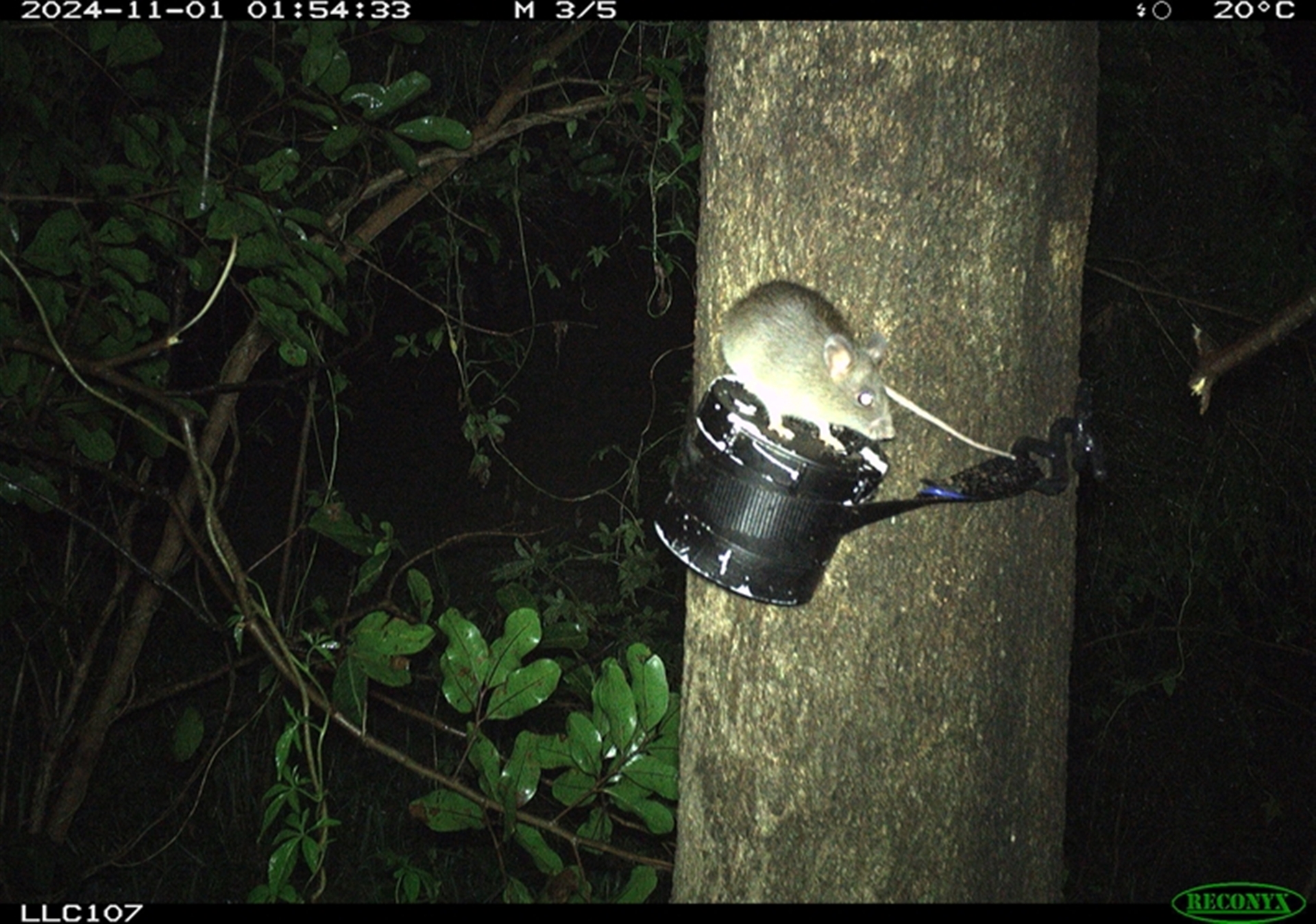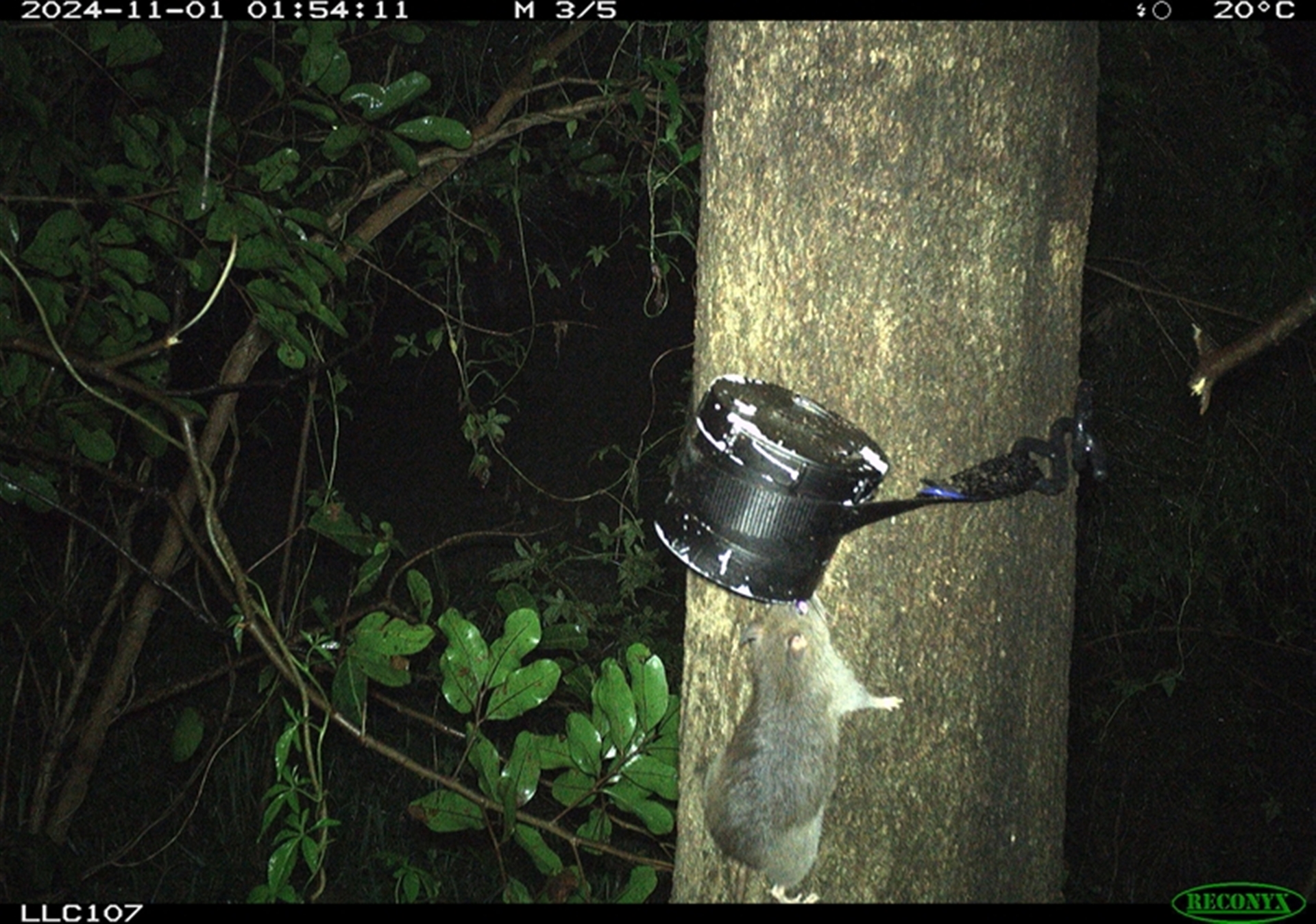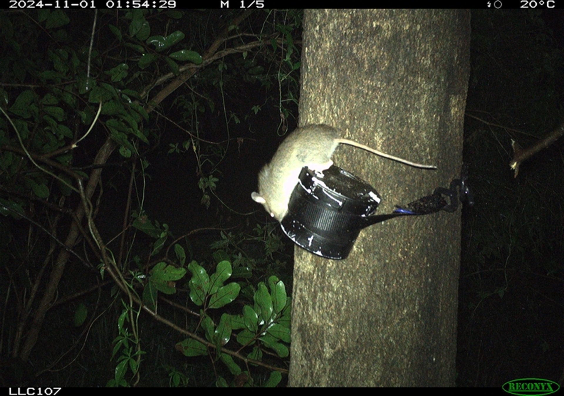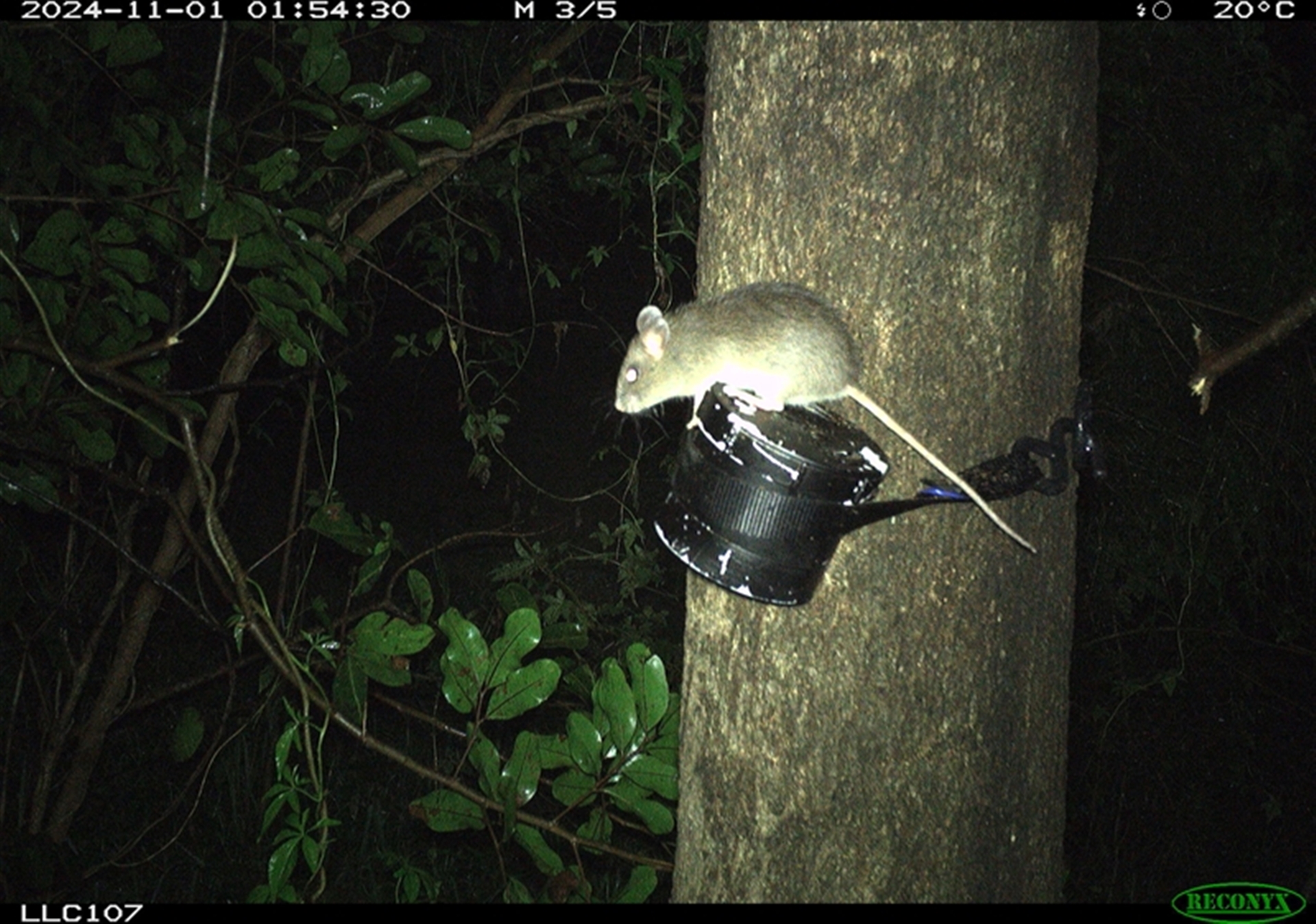 Rattus species, possibly R. fuscipes; tail too short for R. rattus; but could be that it has lost part of its tail. R. rattus are accomplished climbers.
