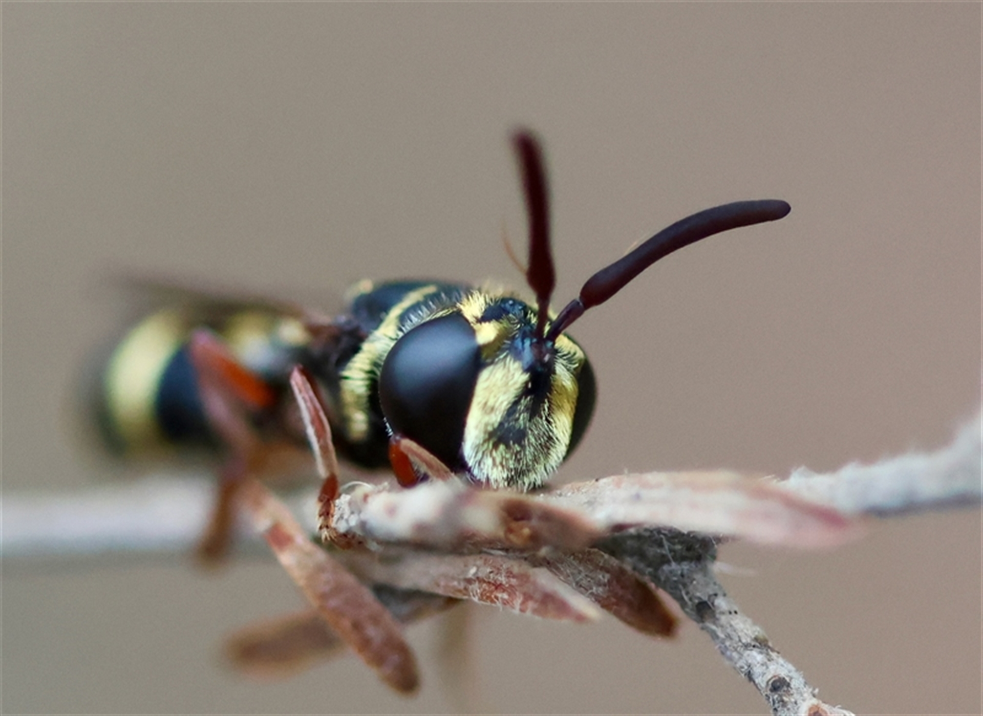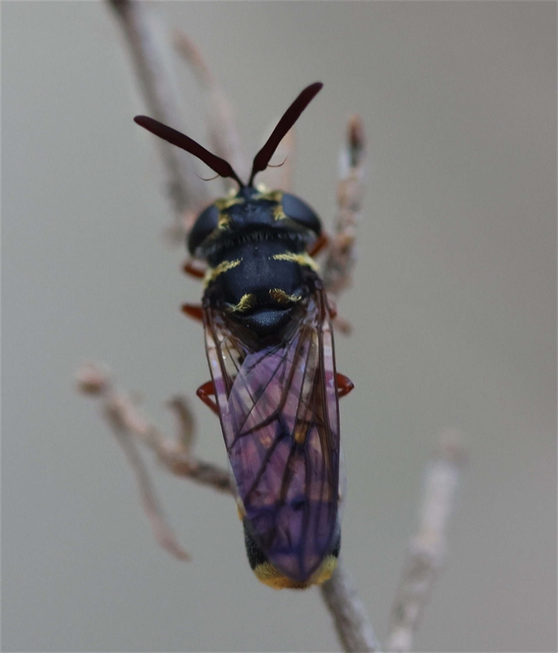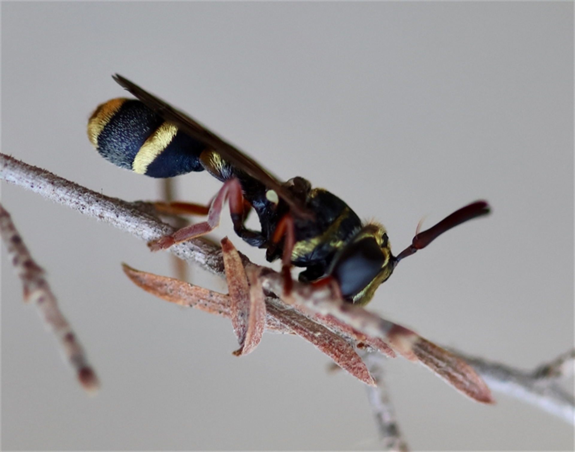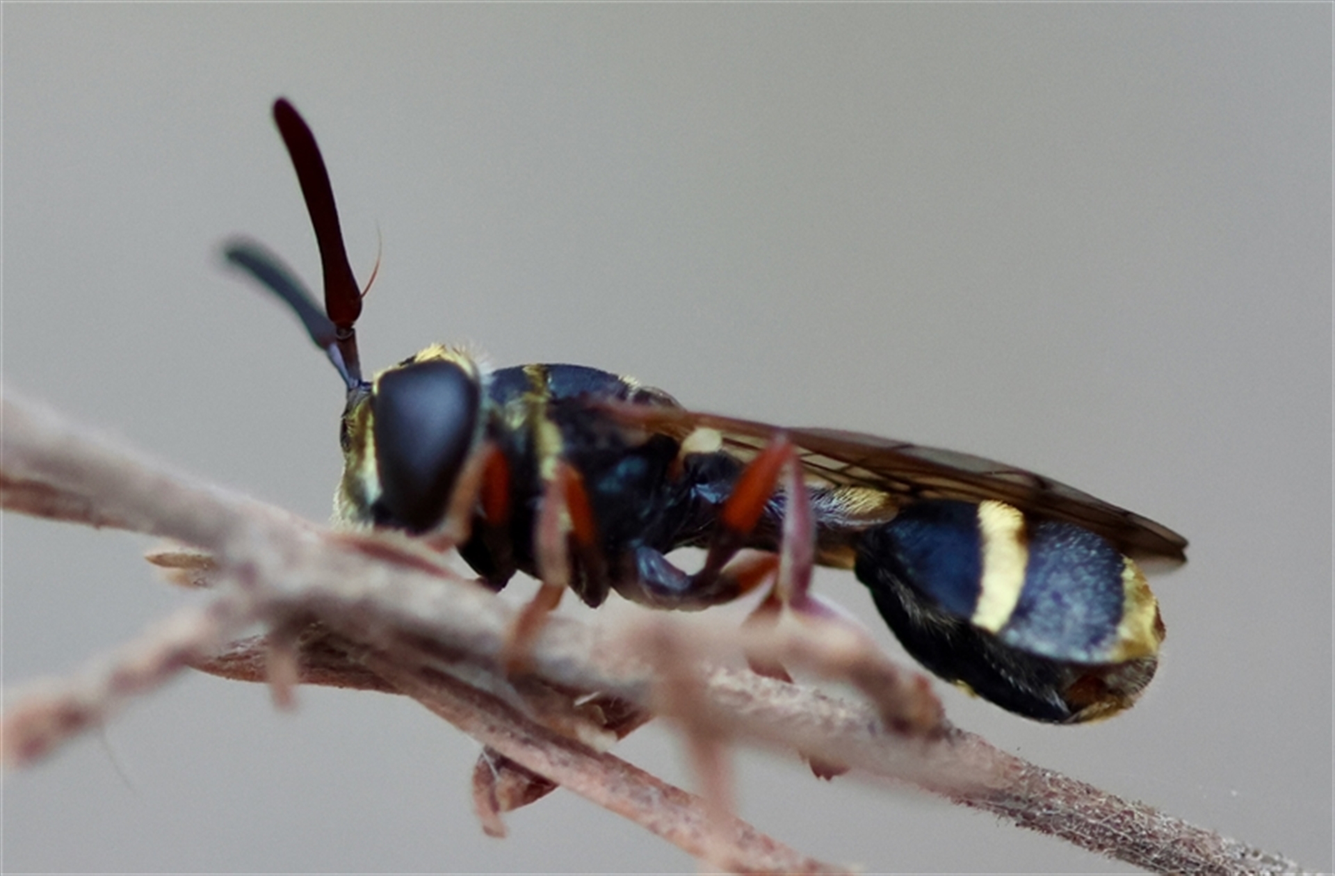 The antennae and eyes indicate this is a Fly (& if you look closely just under the wing in front of the hind leg you can see the little yellow halteres). I’m not particularly good with flies but thinking this looks like it could belong to Family Conopidae or Family Syrphidae😊