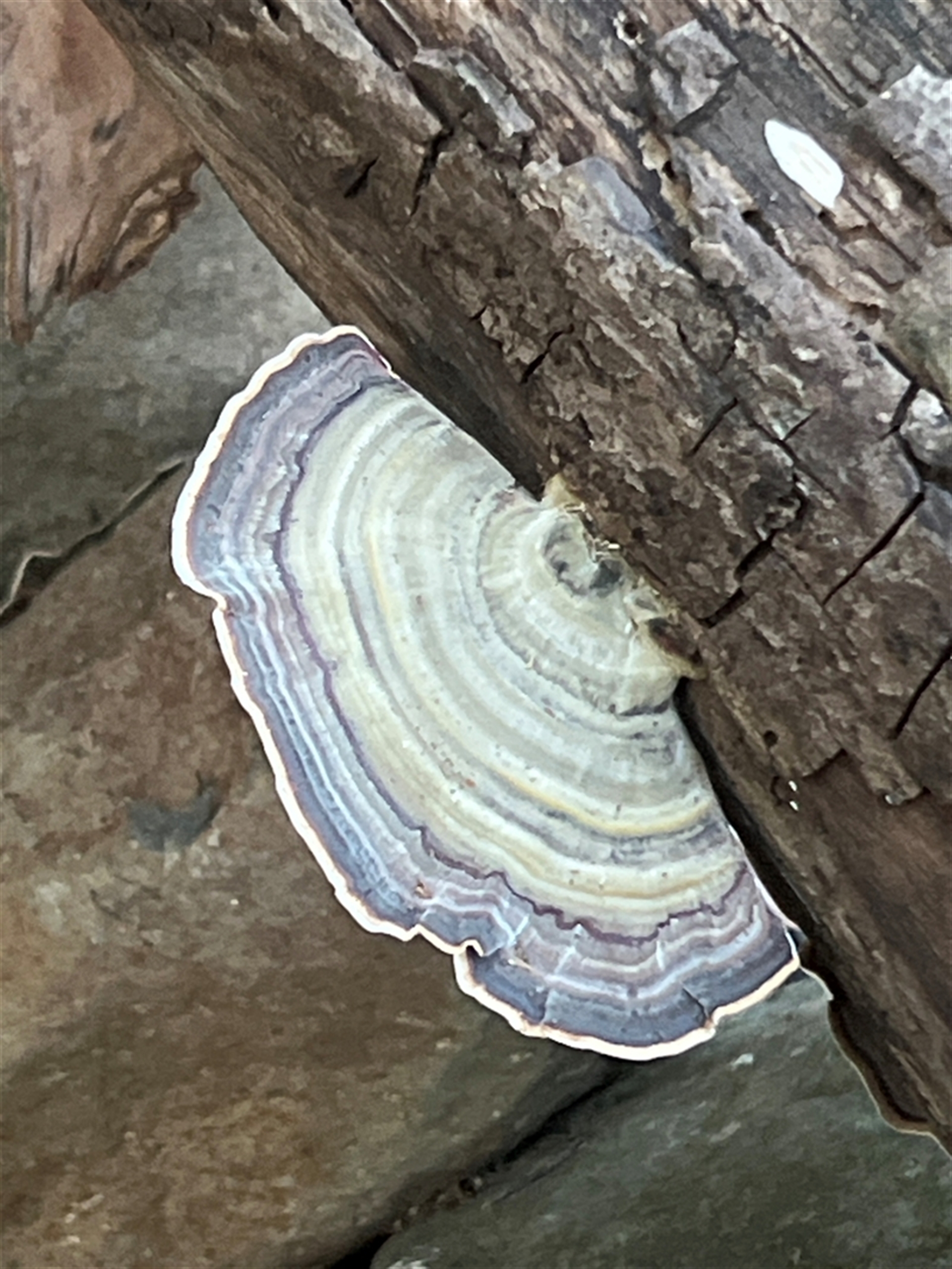 JimL NatureMapr Trametes sp. Pored or somewhat maze-like on underside [bracket polypores] Shelf-like to hoof-like & usually on wood Fungi