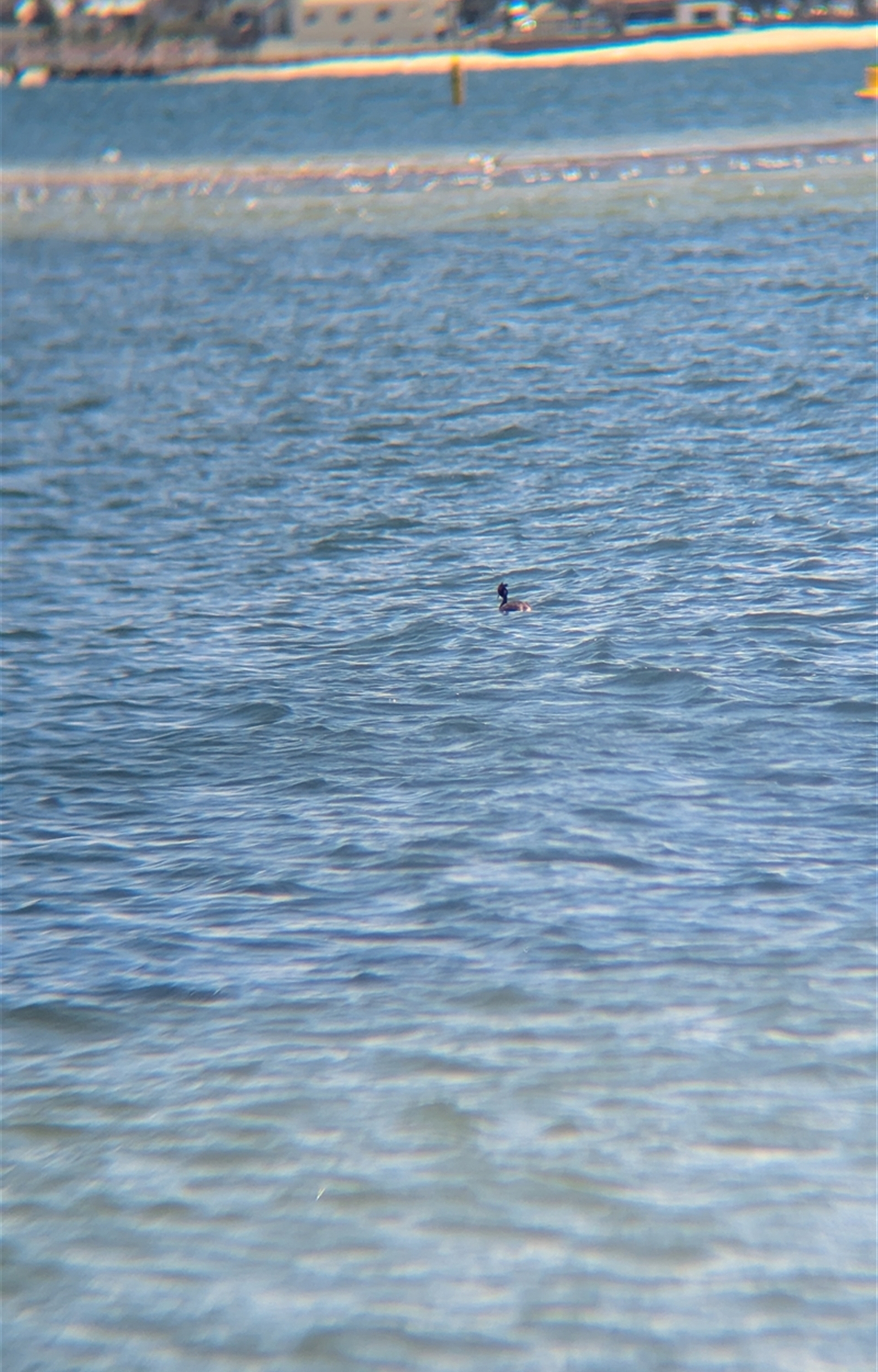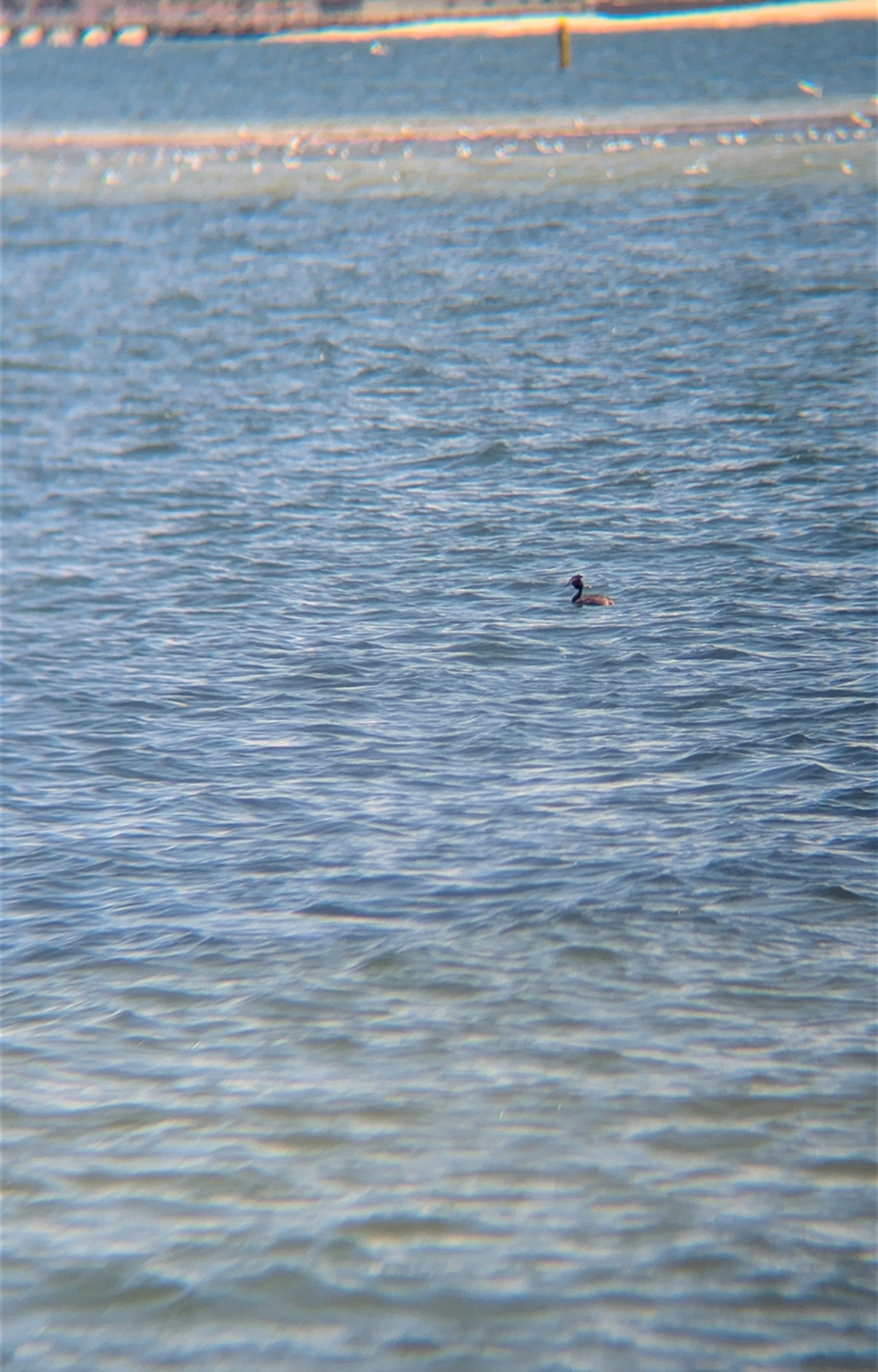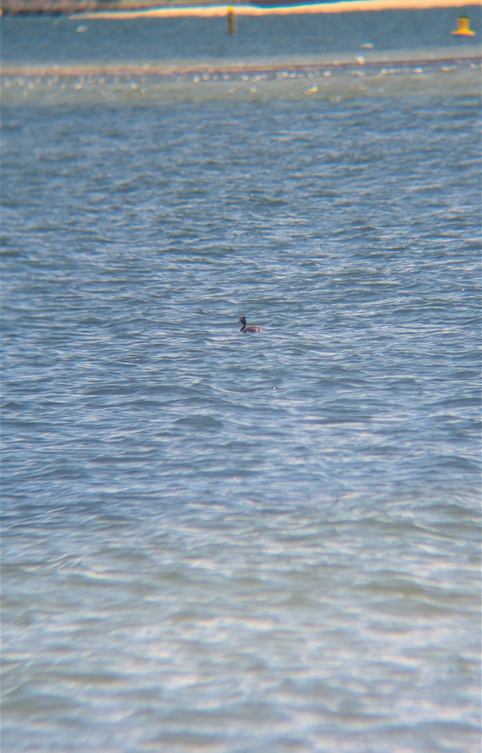 Single great-crested grebe foraging on the bay
