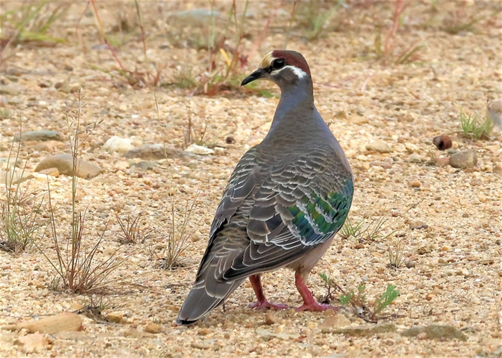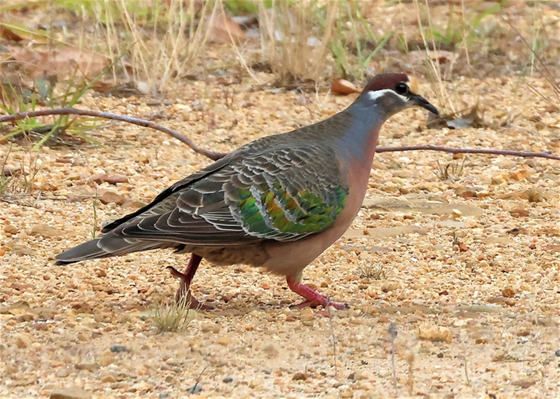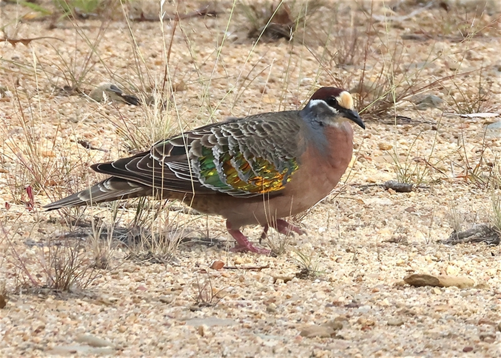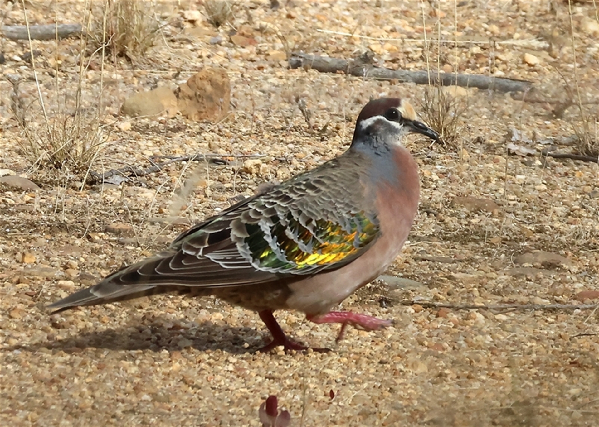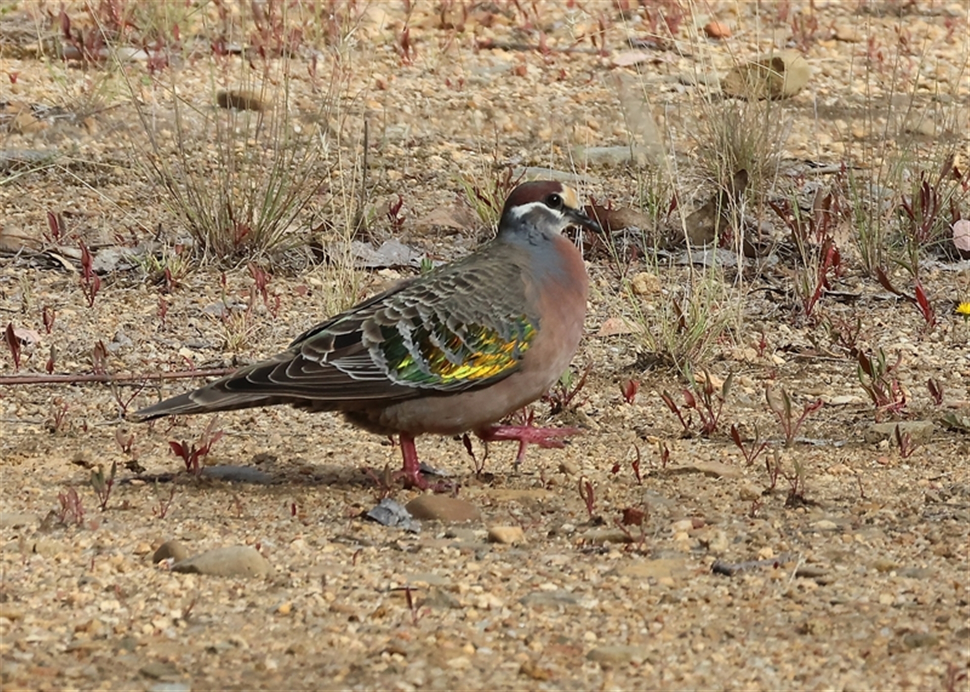 Two others flushed from tracks as I walked and all I saw was them flocking off. This one was just a fluke. I was watching a bush with small birds in it, when out the corner of my eye I saw movement. I looked - and over the wire fence this bird was strutting along. I was able to follow along the fenceline and get more photos and it still did not fly off. Presume it is used to dog walkers and runners.