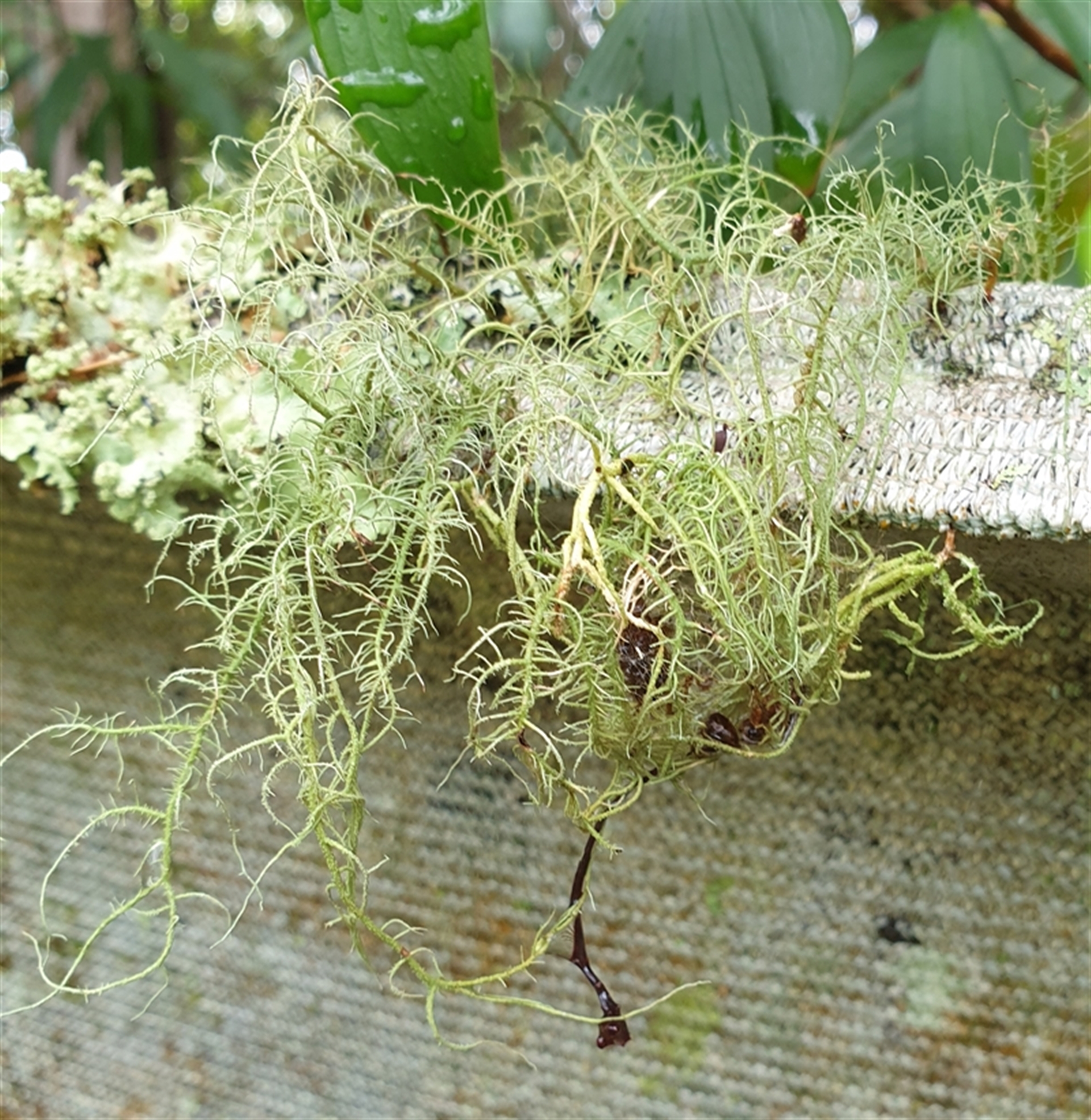 * The shade cloth canopy itself collapsed a few years ago and a substantial amount of leaf litter has accumulated in the depression formed in the top, with several ferns & other plants colonizing the underside, rooting deep into the leaf litter, whilst the lichens and to some extent, mosses are mostly on the more exposed areas, where there is less/no leaf litter.