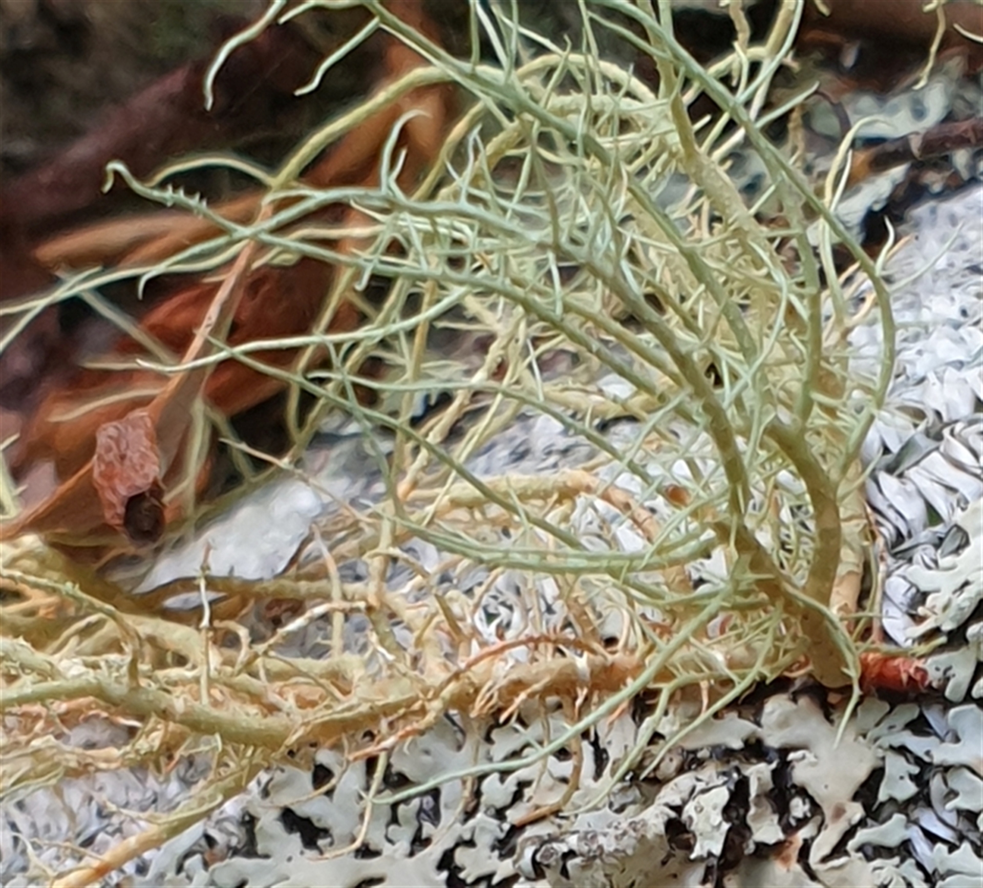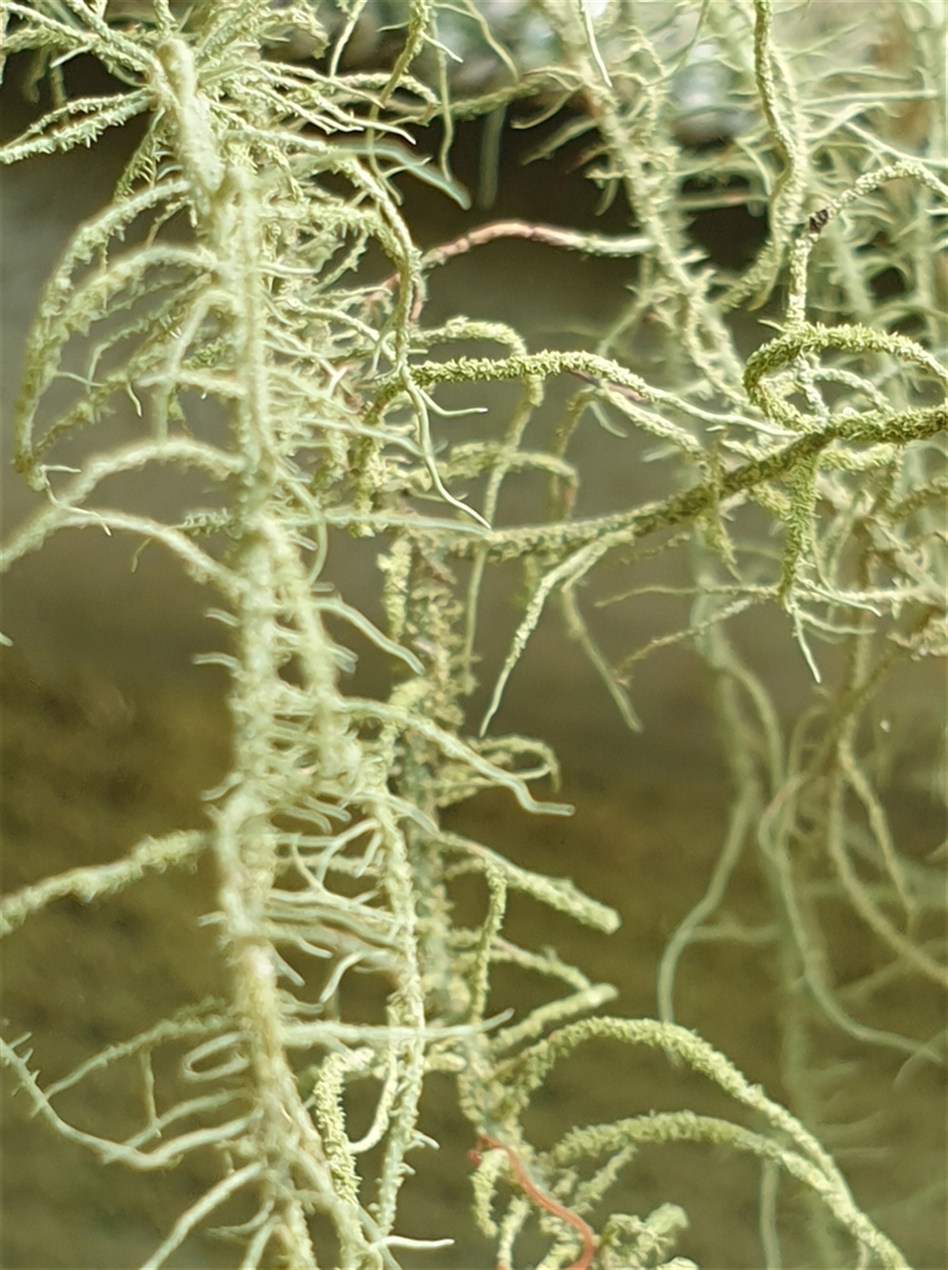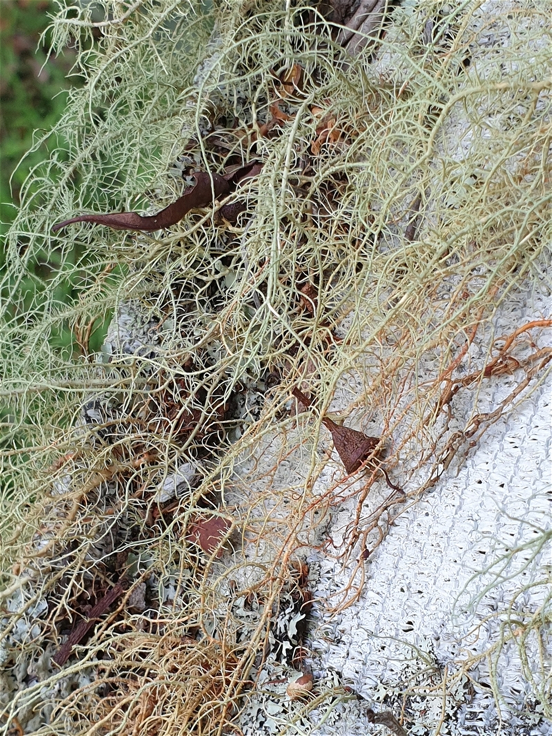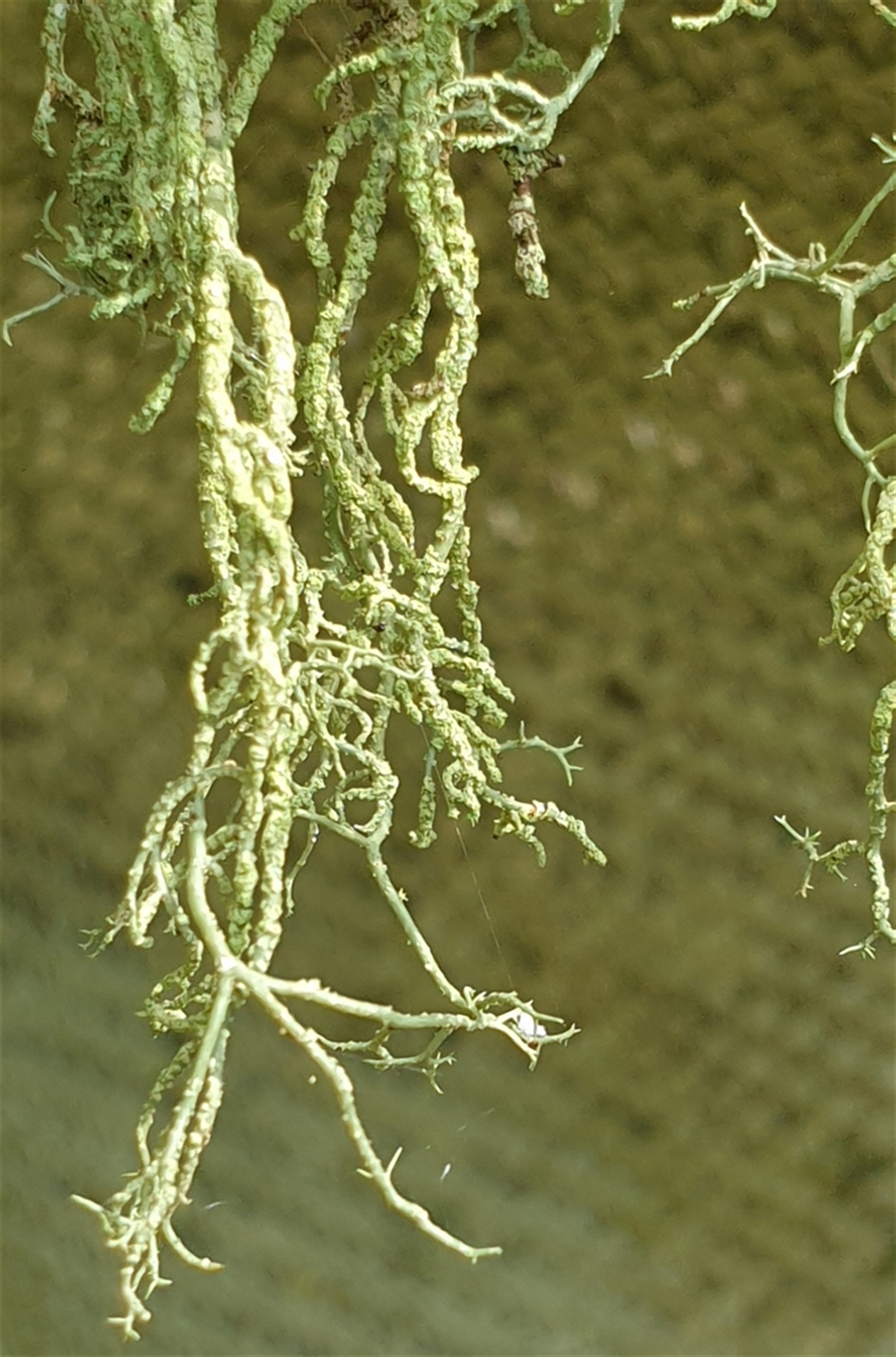 This lichen is abundant in this locality, both on living and dead wood, predominantly attached to bark. Its string-like structure is distinctive.