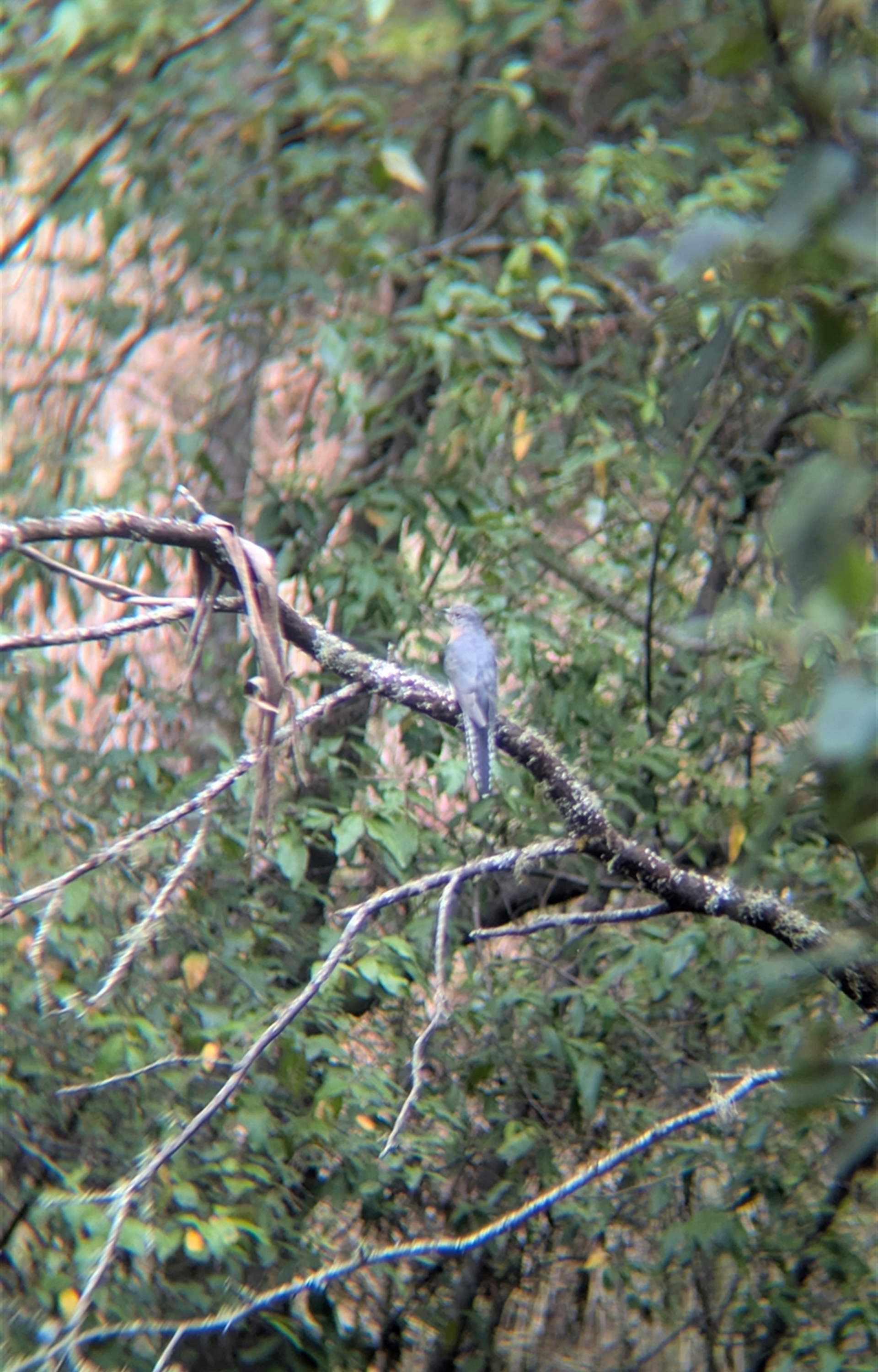 Single fan-tailed cuckoo foraging in the understorey