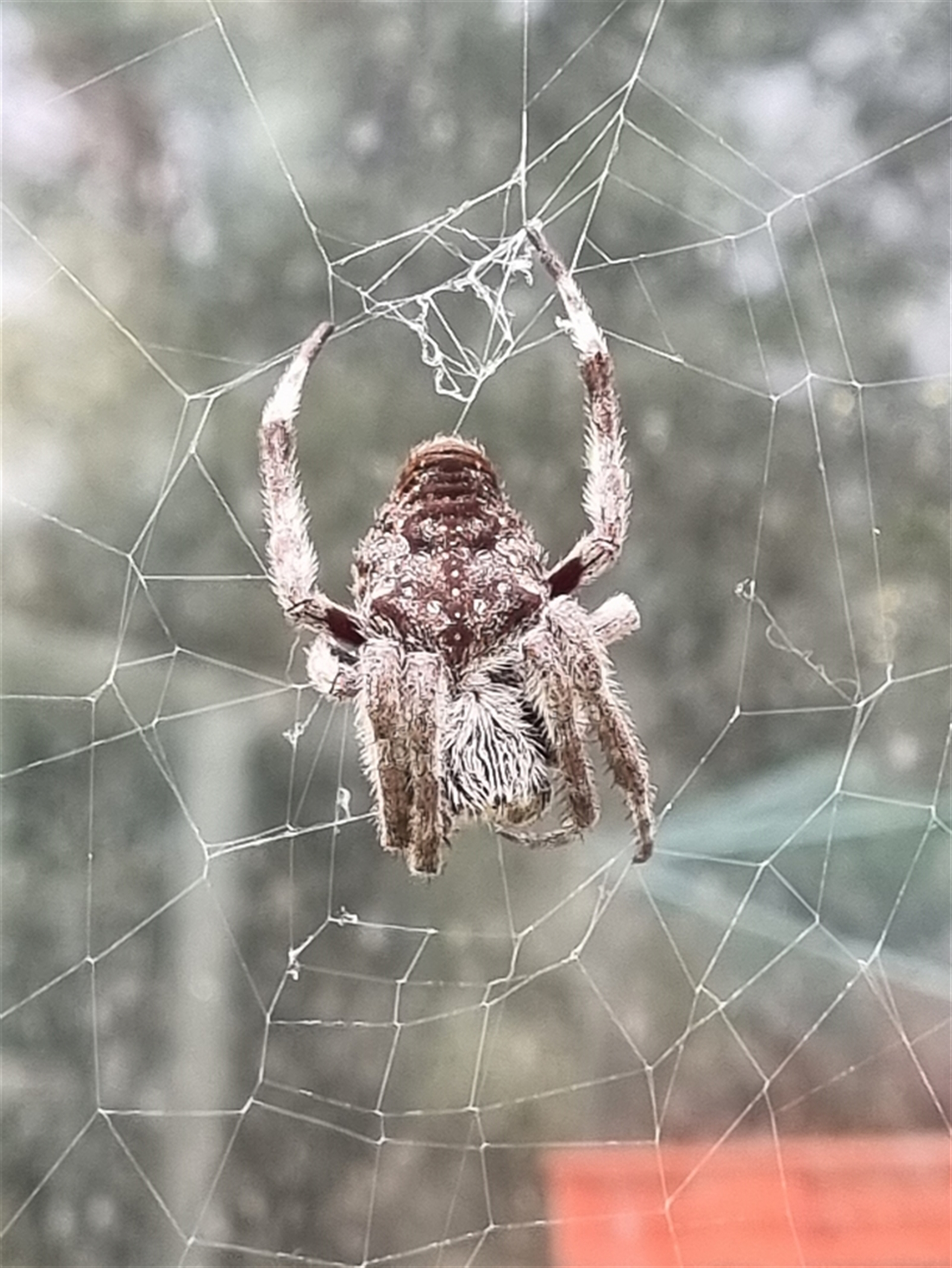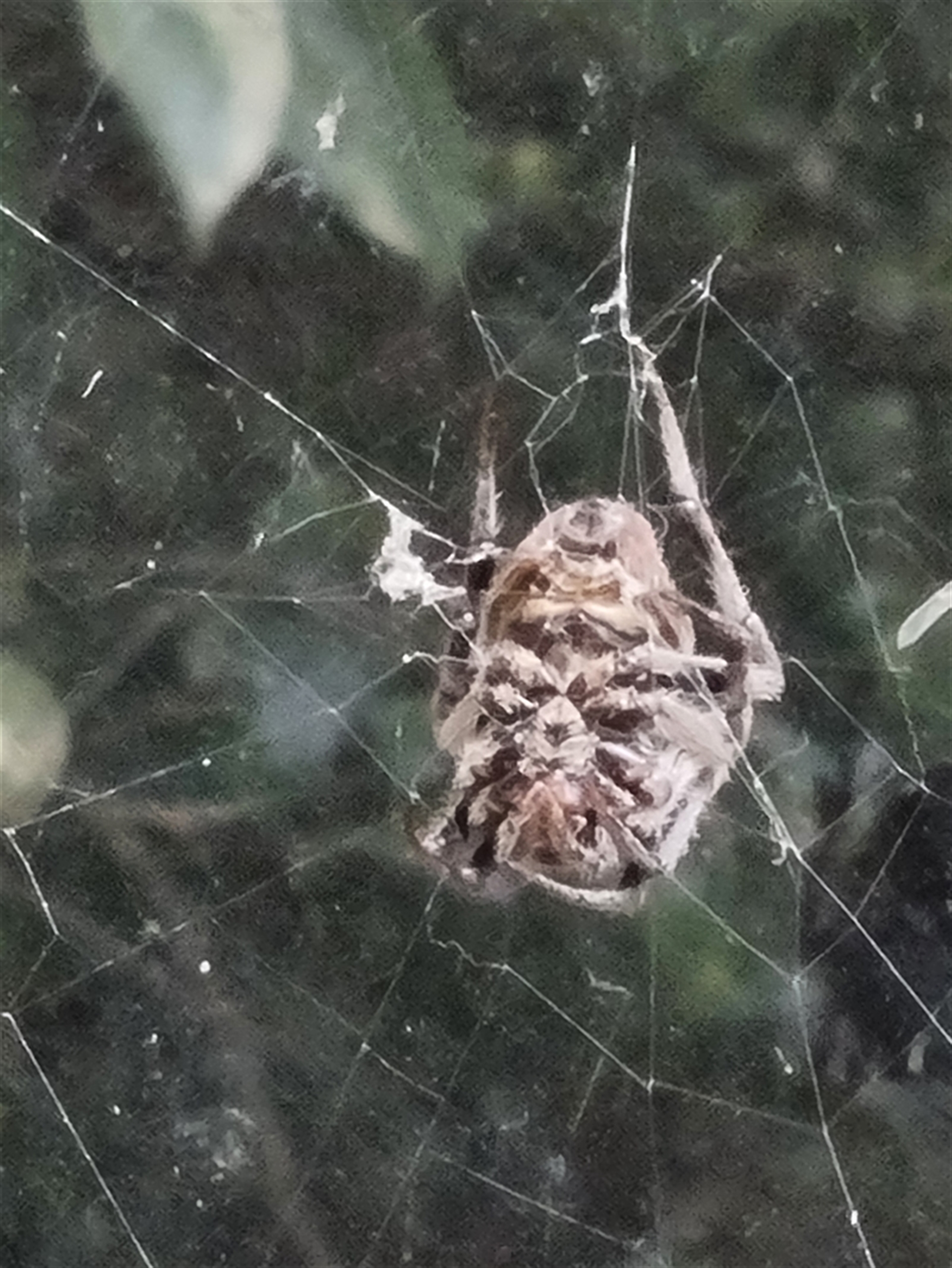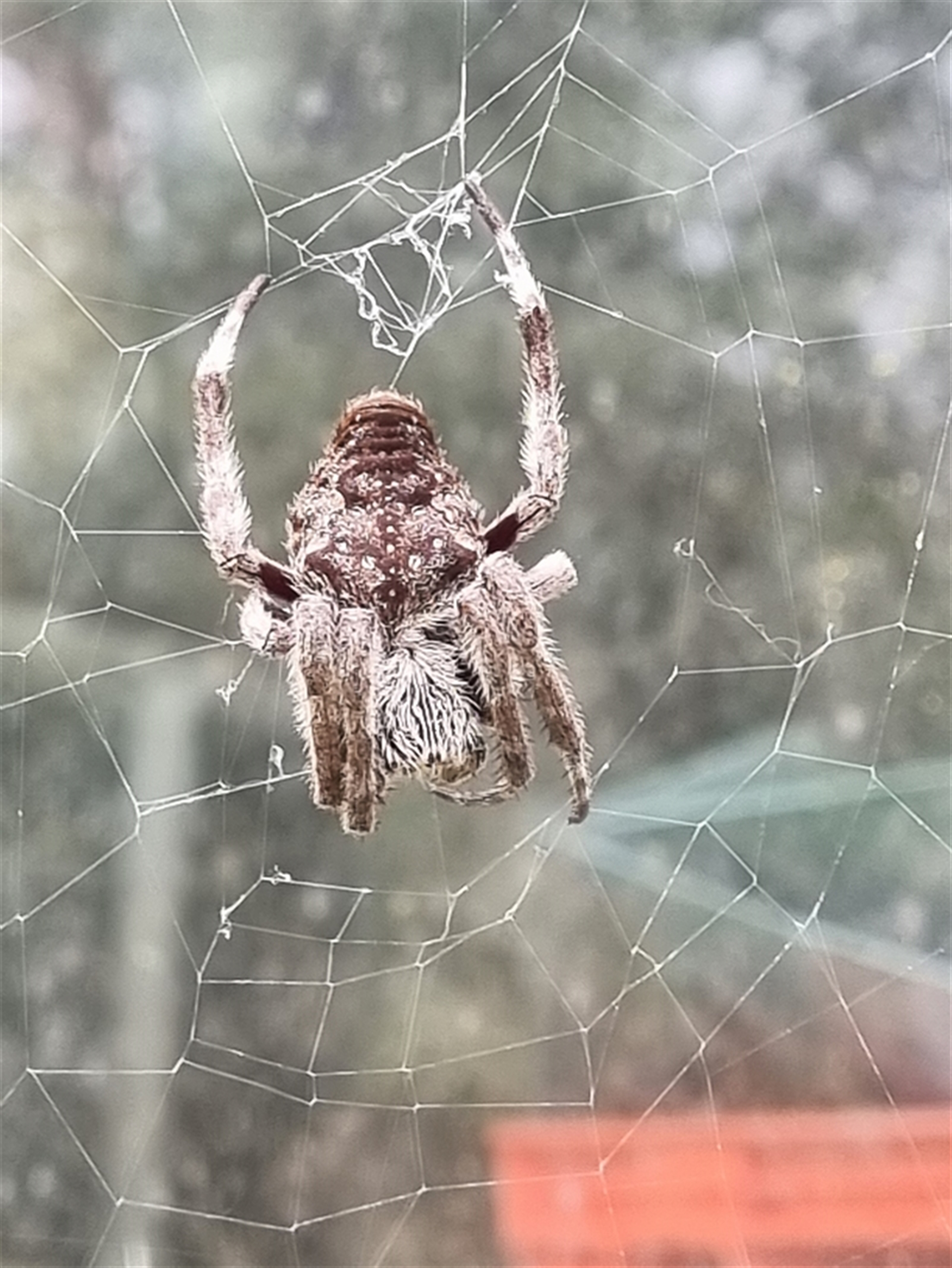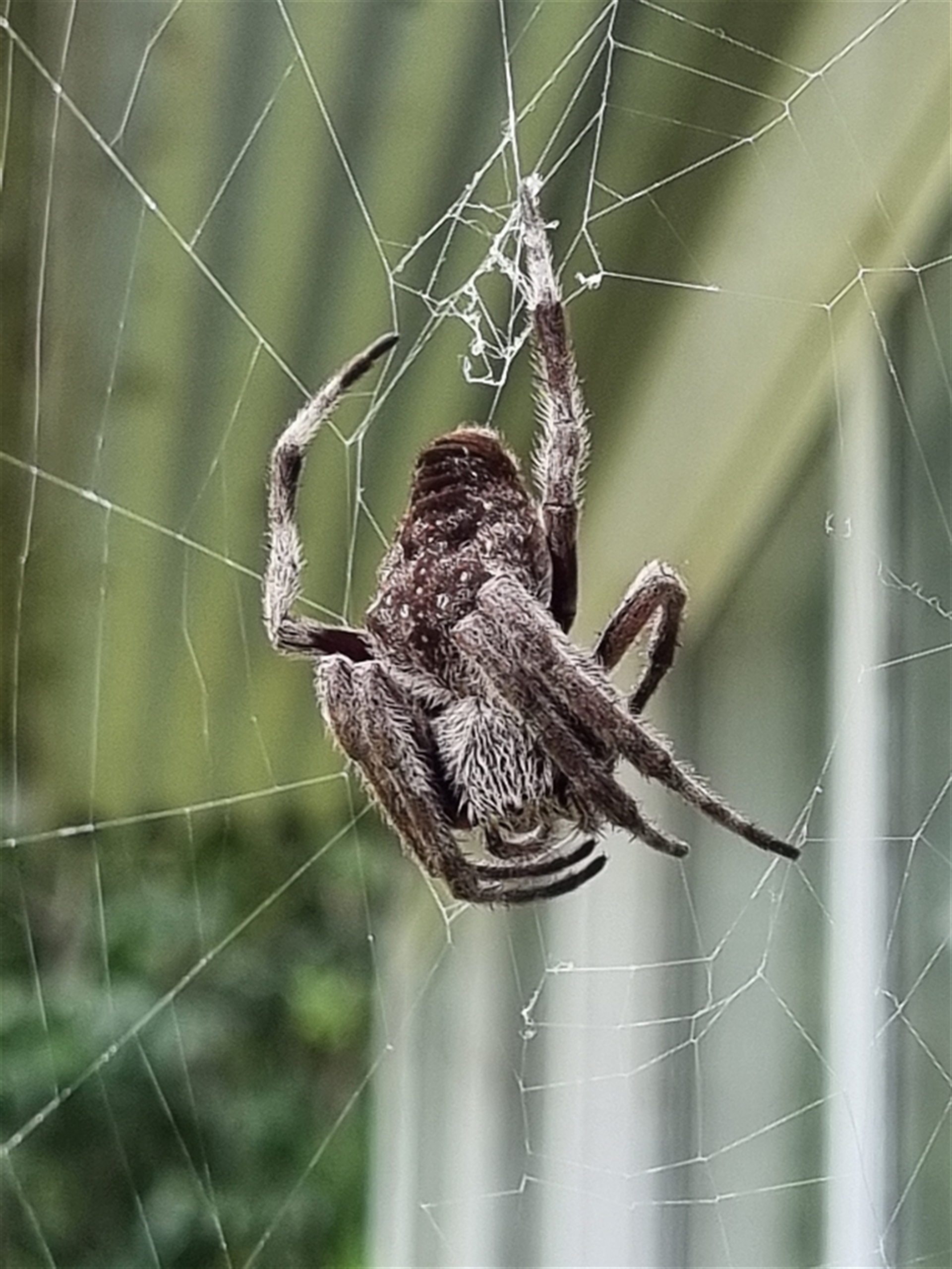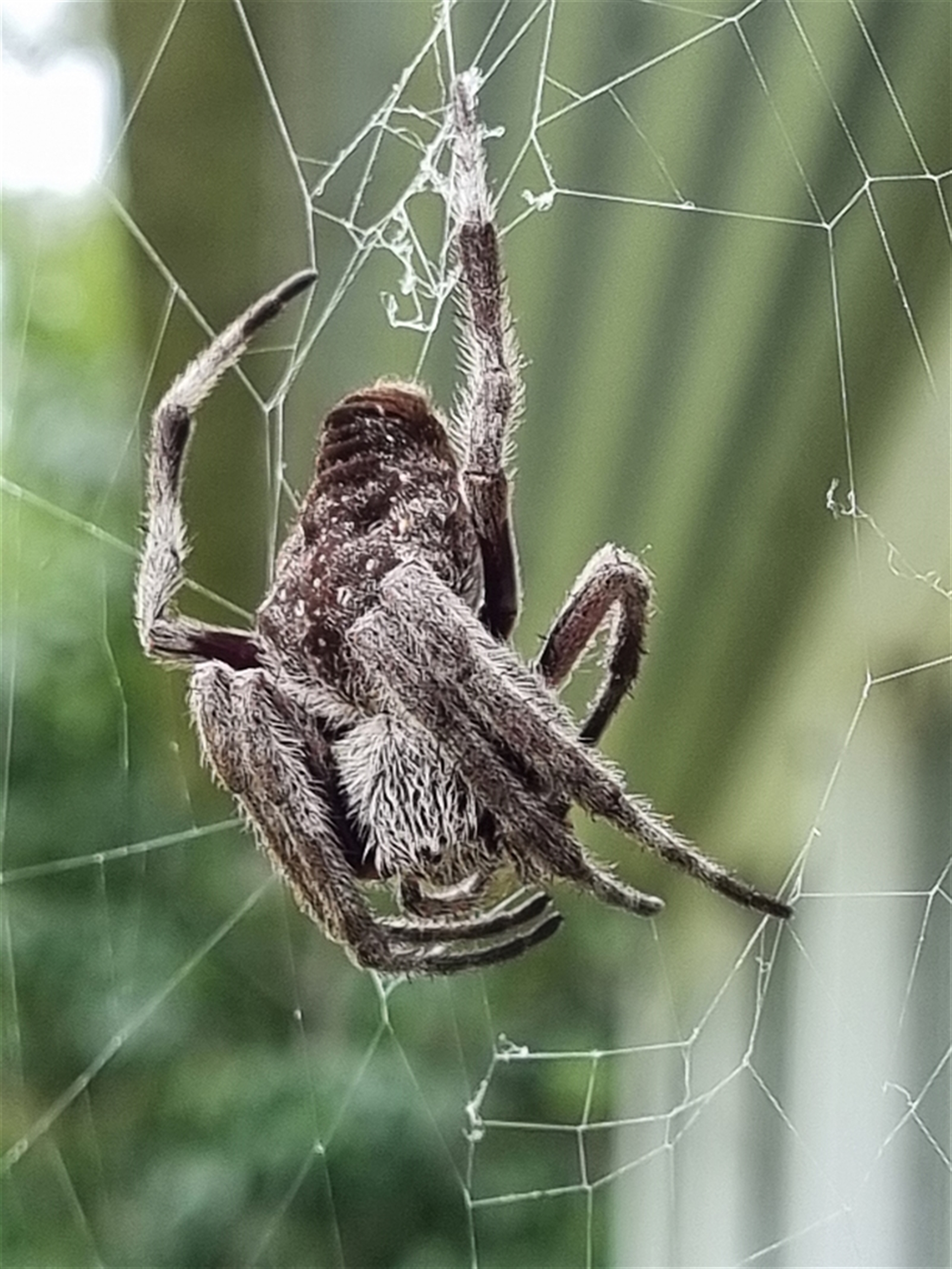 Another big hairy orb weaver spider, brown with pale fawn-white markings. Fine white dots are symmetrically distributed on the top of the abdomen. Looks like a different sp to sightings 4654480 & 4654484, &, especially, 4654481. However I think it may be the same sp as at sighting 4645856.